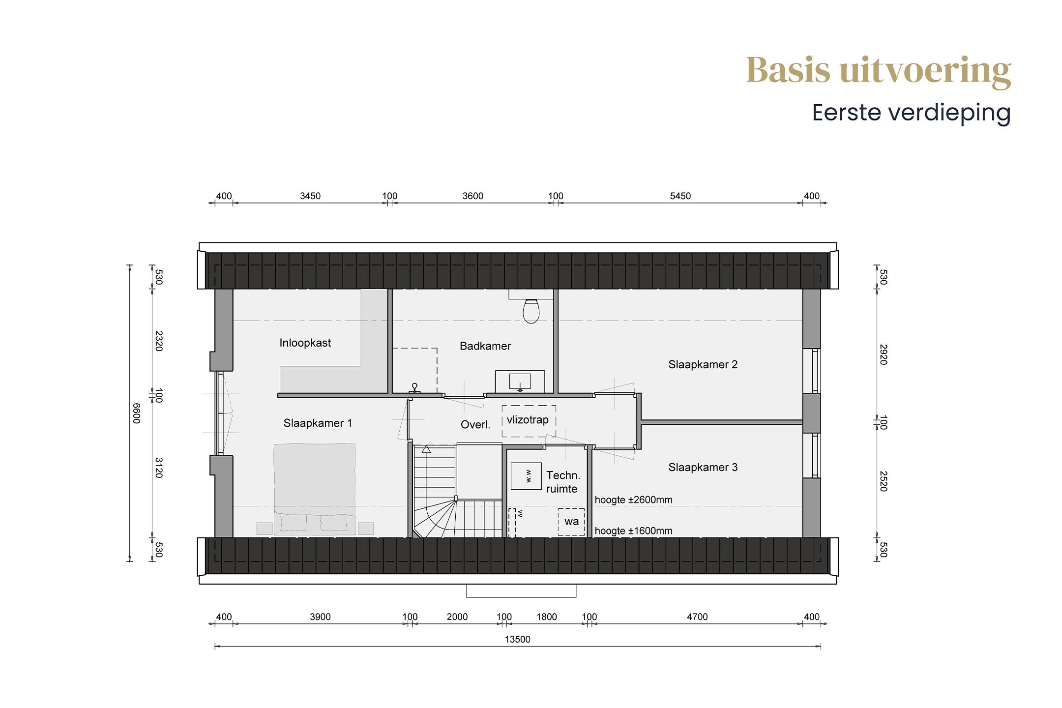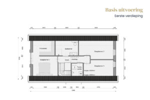 Op de eerste verdieping bevinden zich de masterbedroom met inloopkast en frans balkon aan de straatzijde en twee – eveneens – goed bemeten slaapkamers aan de achterzijde. Daar tussenin bevindt zich de badkamer met douche, wastafel en tweede toilet en de was- en stookruimte in de technische ruimte.