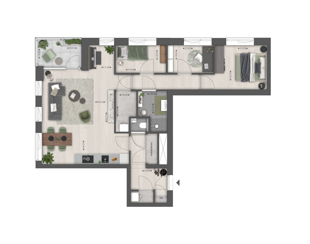 In totaal zijn er 22 royaal appartementen, waarbij de woonoppervlakte verschilt van ca. 88 tot 90 m². Alle appartementen voorzien in een woonkamer met open keuken, drie slaapkamers, een eigen buitenruimte en een separaat toilet.