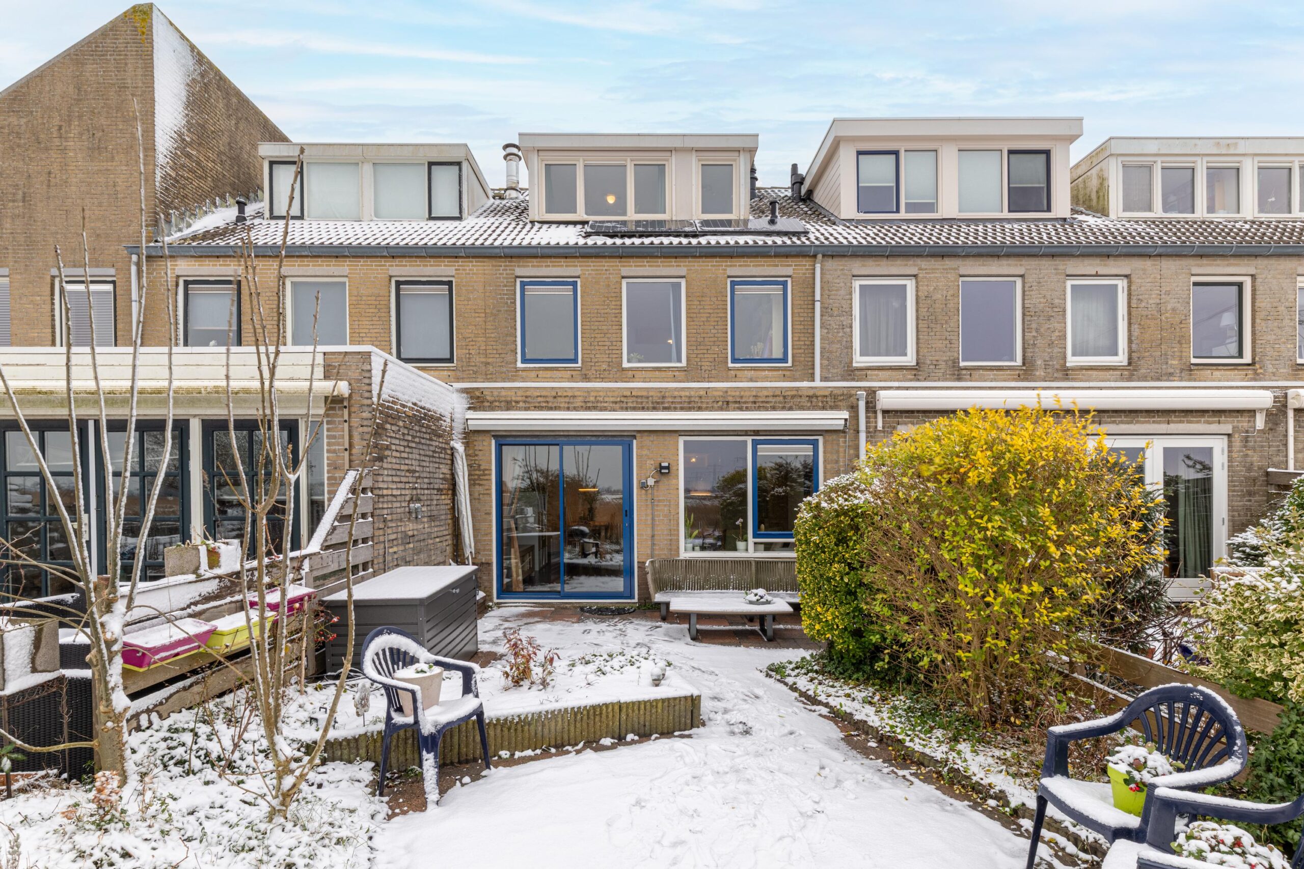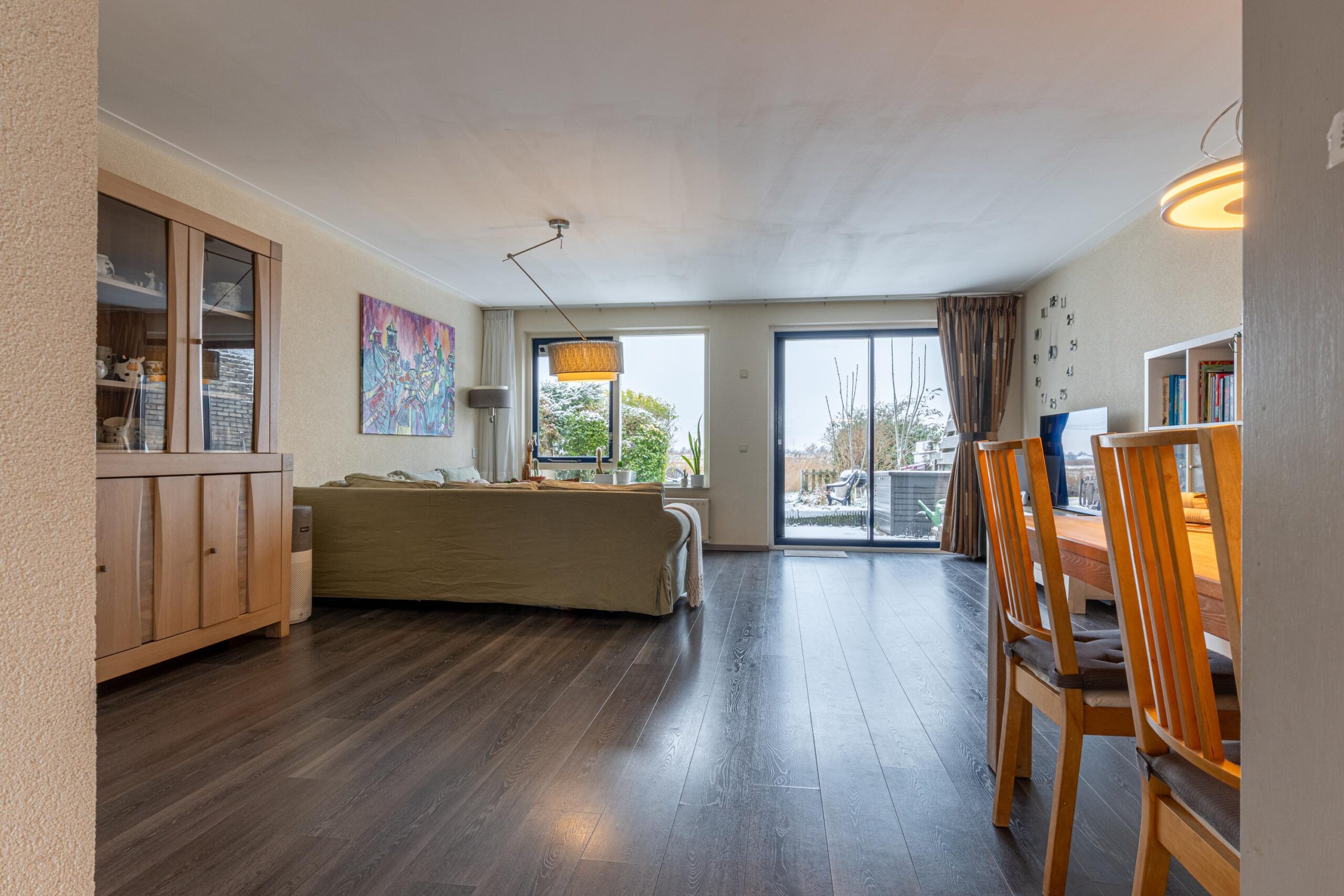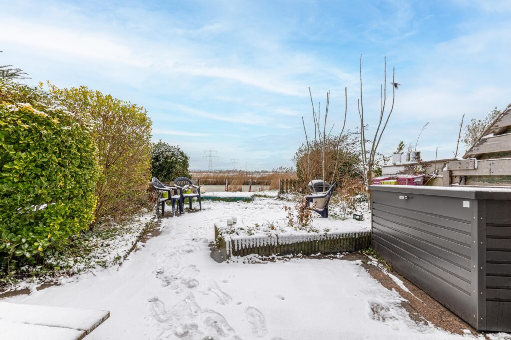 Via de schuifdeur in de woonkamer komen we in de achtertuin. Met een oppervlakte van circa 60 m² en een ligging op het westen is dit op zichzelf al een heerlijke plek om van de middag- en avondzon te genieten. Maar wat deze tuin écht bijzonder maakt, is het adembenemende uitzicht en de unieke ligging aan het Westzijderveld. De tuin sluit direct aan op open vaarwater met een steiger direct achter de tuin. Vanaf hier vaar je met je eigen bootje zo de natuur in en verken je de uitgestrekte velden vanaf het water. Een zeldzame combinatie van rust, vrijheid en natuur, midden in Zaandam.