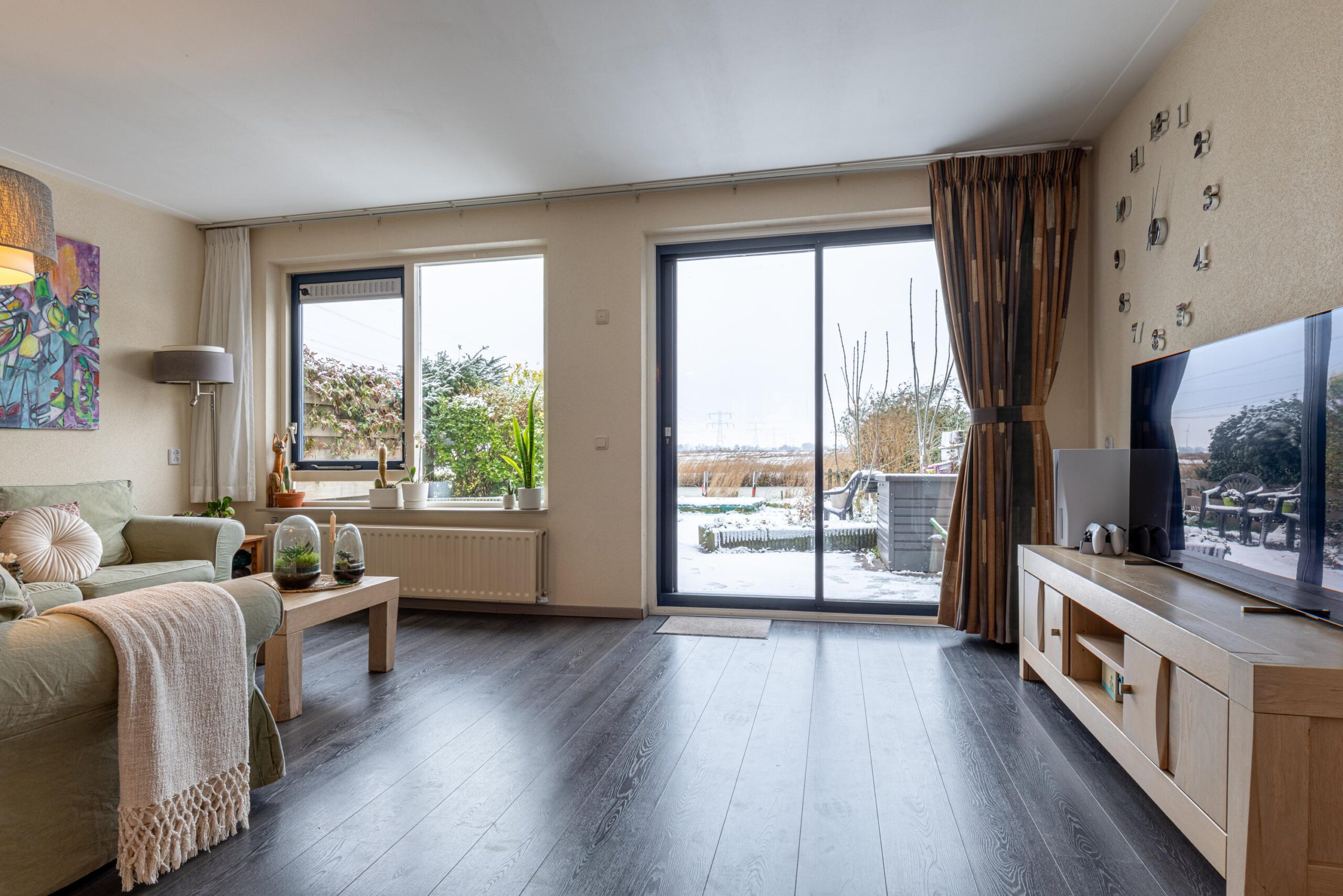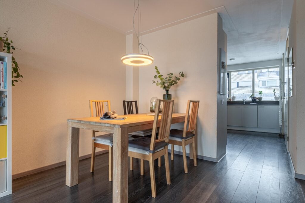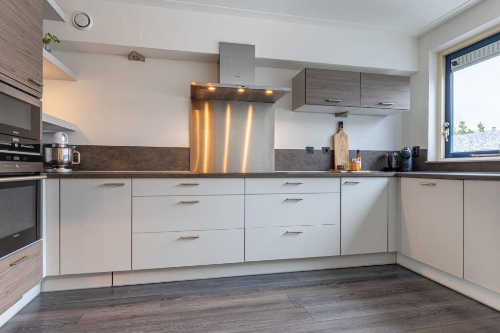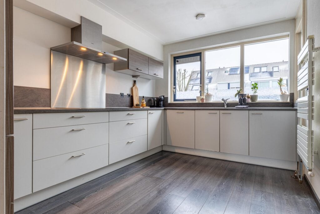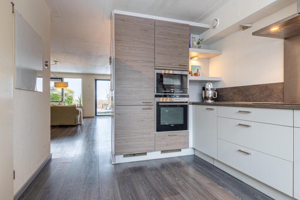 We nemen je mee naar binnen. Via de hal kom je in de zeer ruime en lichte woonkamer. Wat direct opvalt, is het prachtige uitzicht, benadrukt door de brede raampartijen. Zowel vanuit de zit- als de eethoek kijk je zo het veld in. In de zomer zet je de schuifpui open zodat de tuin een verlengde wordt van de woonkamer. Aan de voorzijde van de woning bevindt zich de verzorgde en goed Uitgeruste keuken. Deze heeft veel bergruimte en is voorzien van diverse inbouwapparatuur. In 2024 zijn zowel de vaatwasser als de koelkast vernieuwd, wat bijdraagt aan extra comfort. Dankzij de prettige lichtinval en het grote werkblad is de keuken een fijne plek om de dag te beginnen of om uitgebreid te koken voor familie en vrienden.