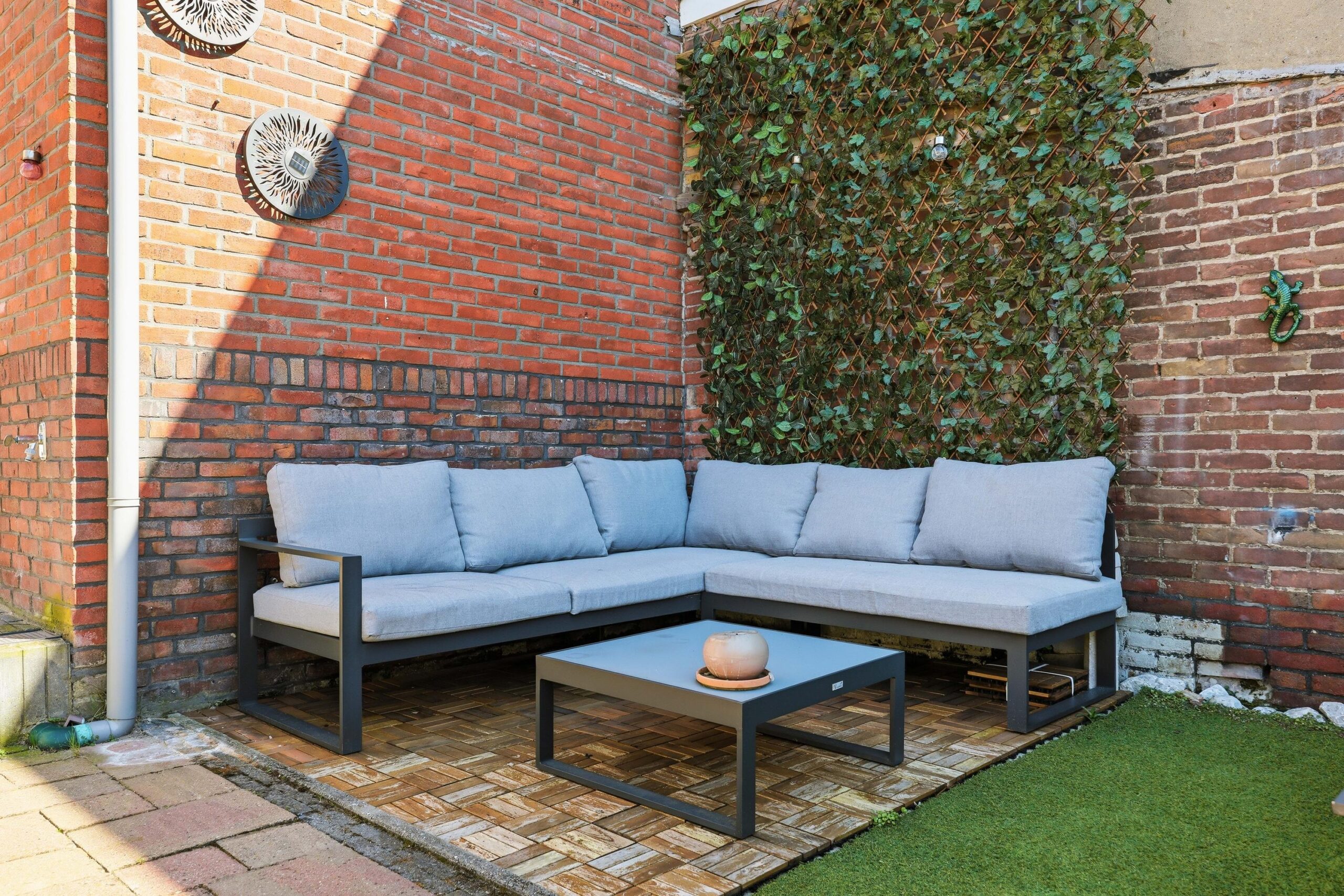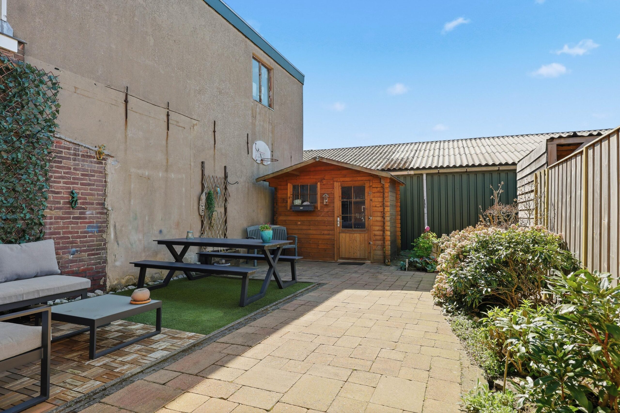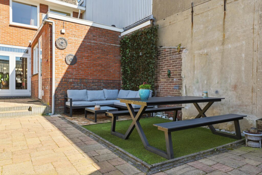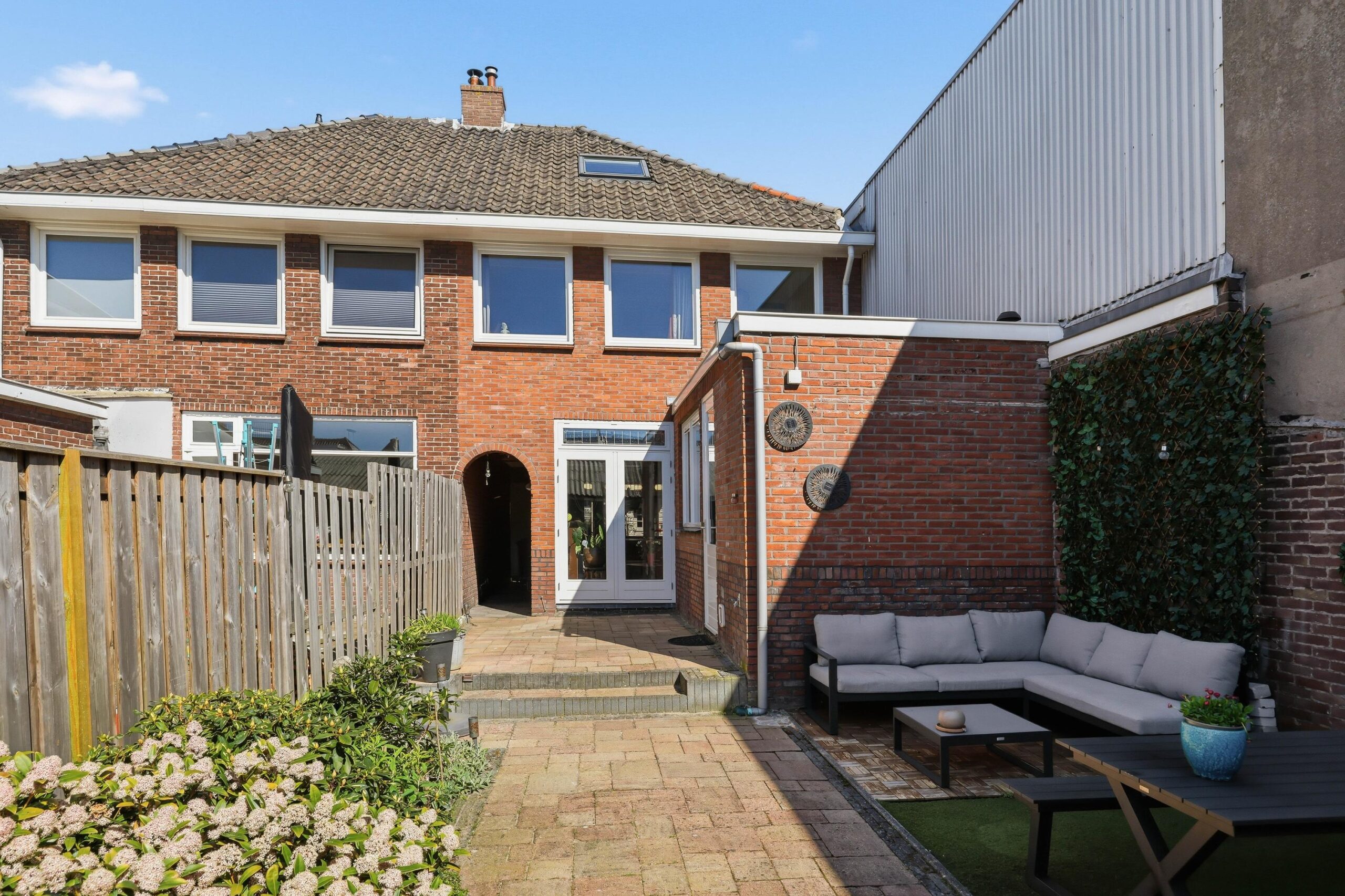 De diepe achtertuin is een fijne plek om te ontspannen en biedt voldoende ruimte voor een zitje en groen.