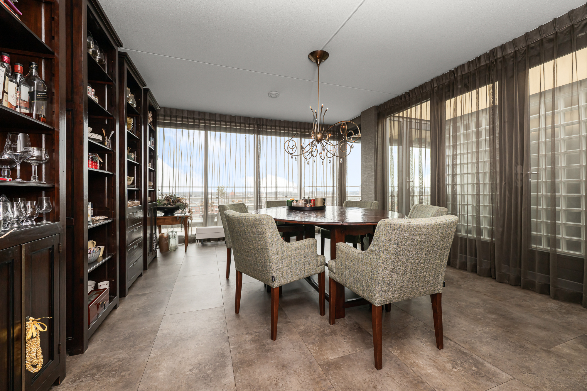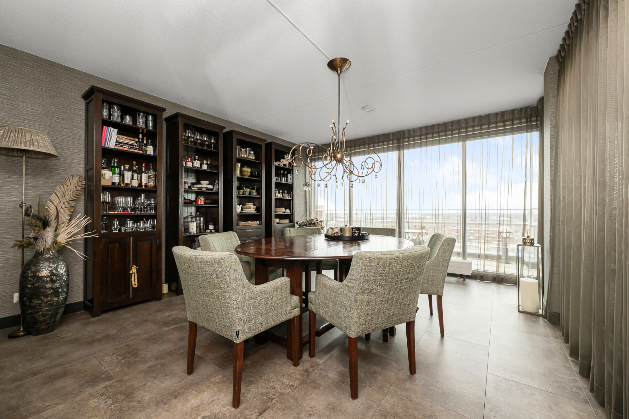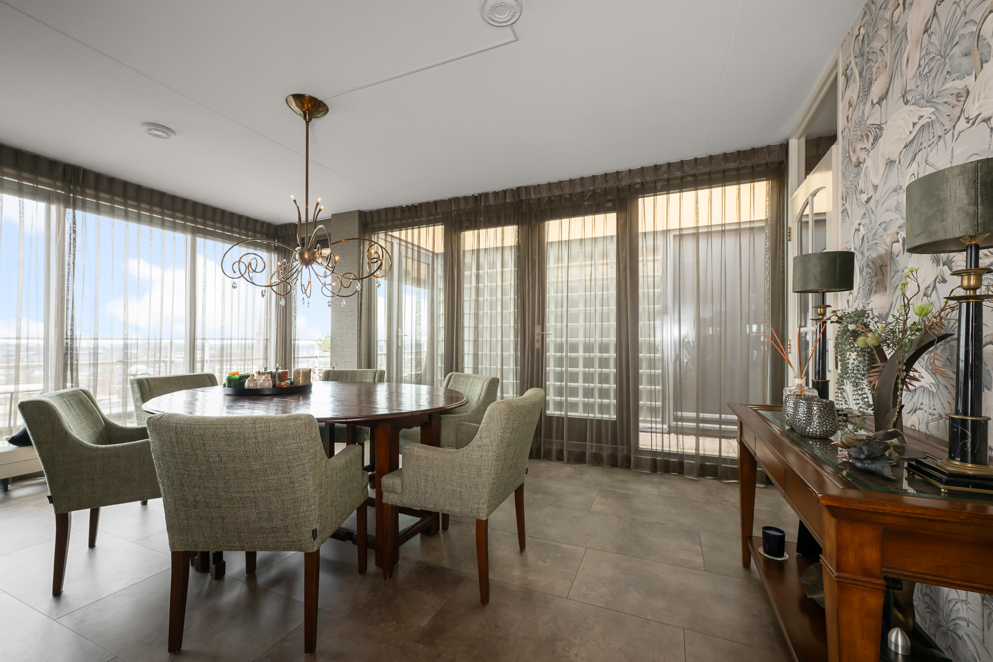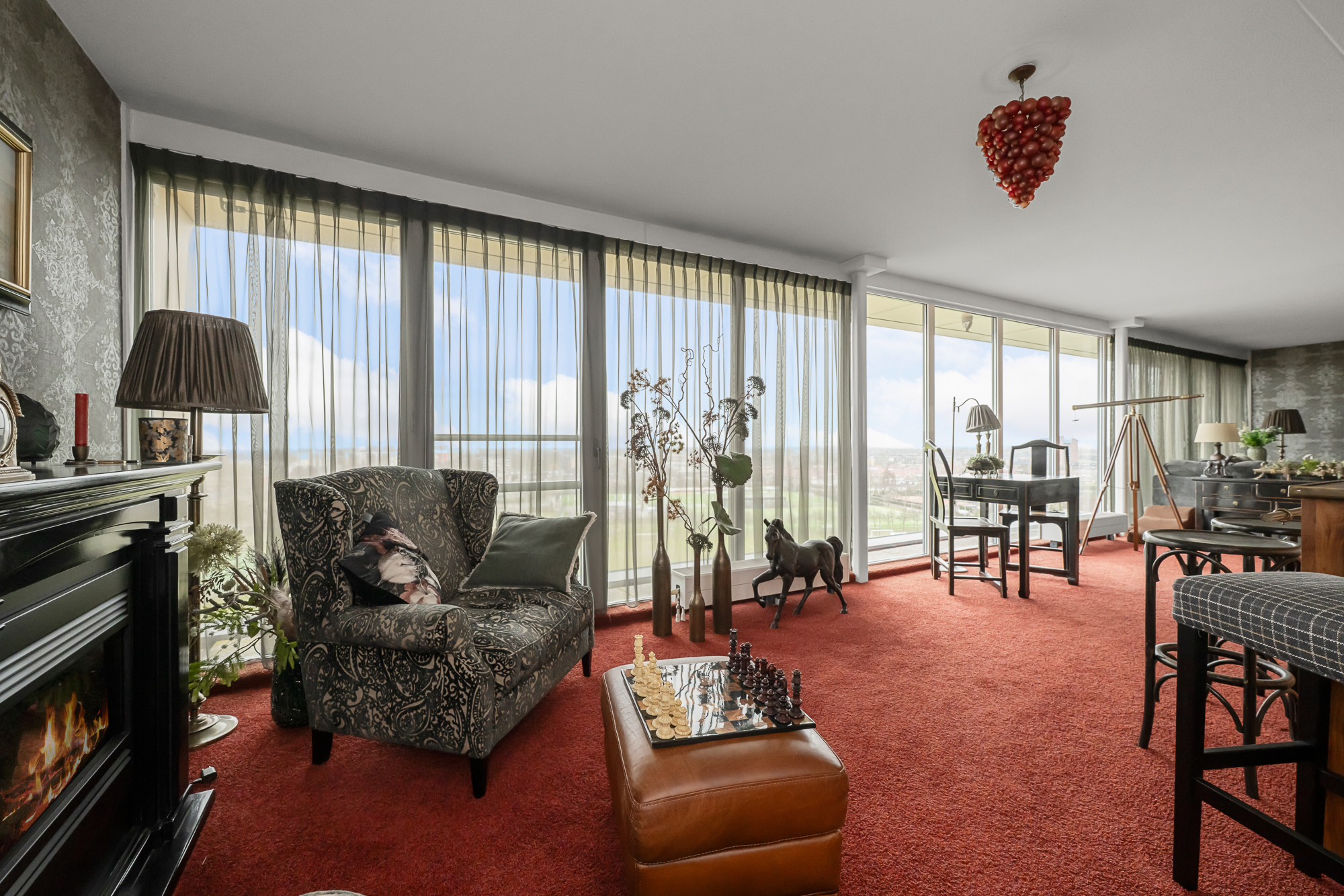 Via de afgesloten entree met liftinstallatie bereikt u rechtstreeks de hoogste verdieping, waar dit indrukwekkende penthouse zich bevindt. Zodra de deuren openen, ervaart u direct de rust en privacy die deze woonlaag zo bijzonder maken. De royale living vormt het hart van de woning en wordt gekenmerkt door grote raampartijen die zorgen voor een prachtige lichtinval en een weids uitzicht over de stad en het aangrenzende groen. Hier geniet u dagelijks van ruimte, comfort en een panoramisch decor dat nooit verveelt.