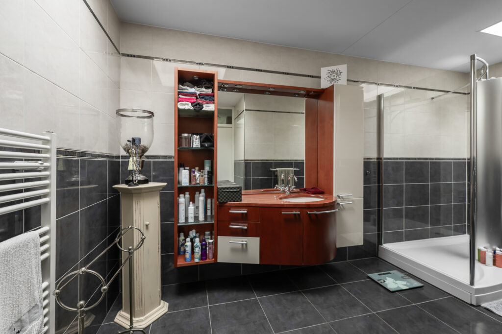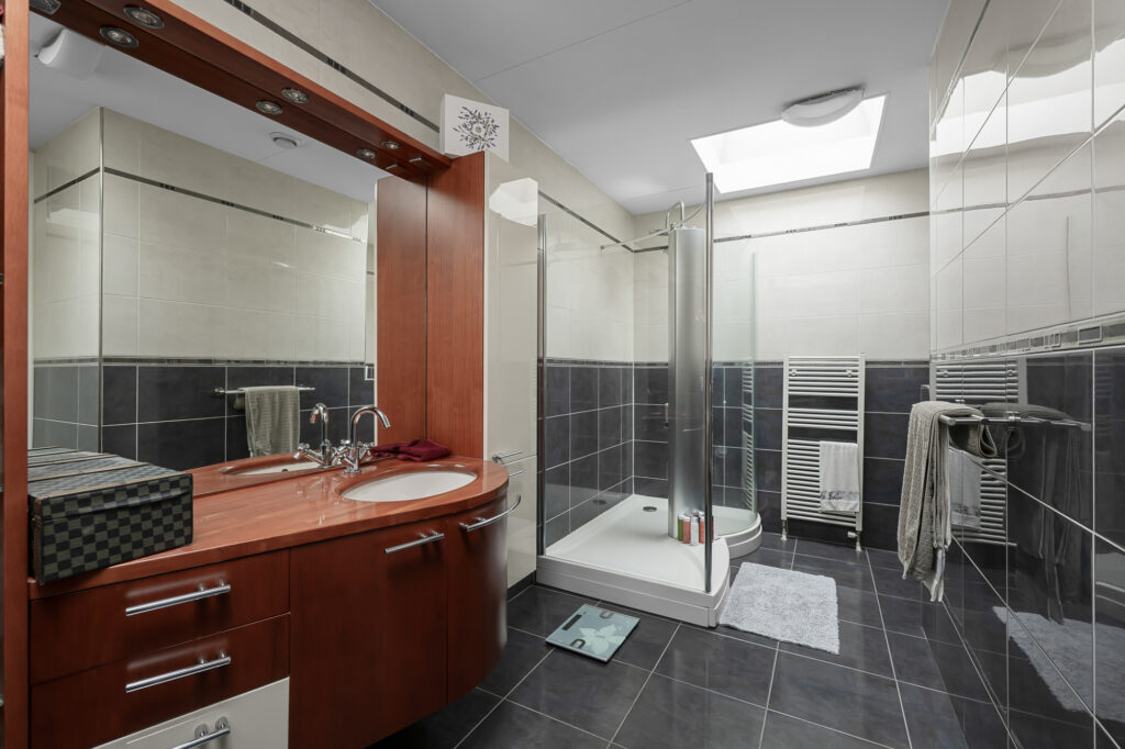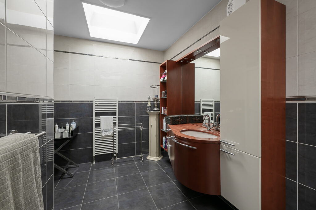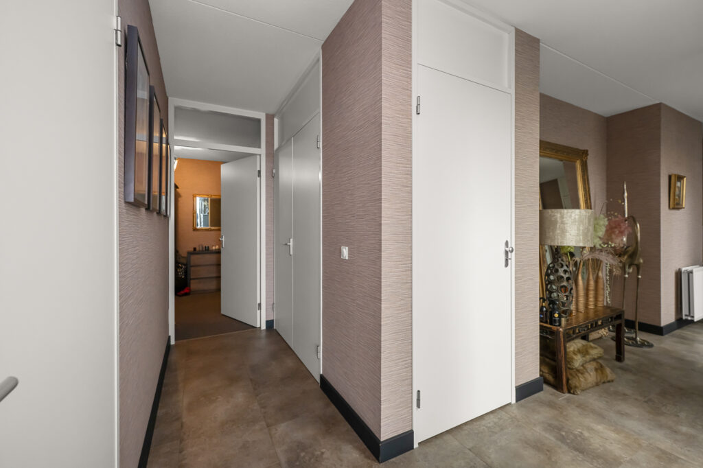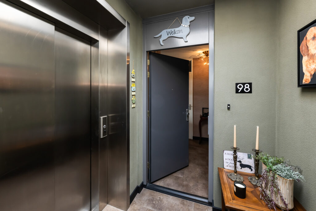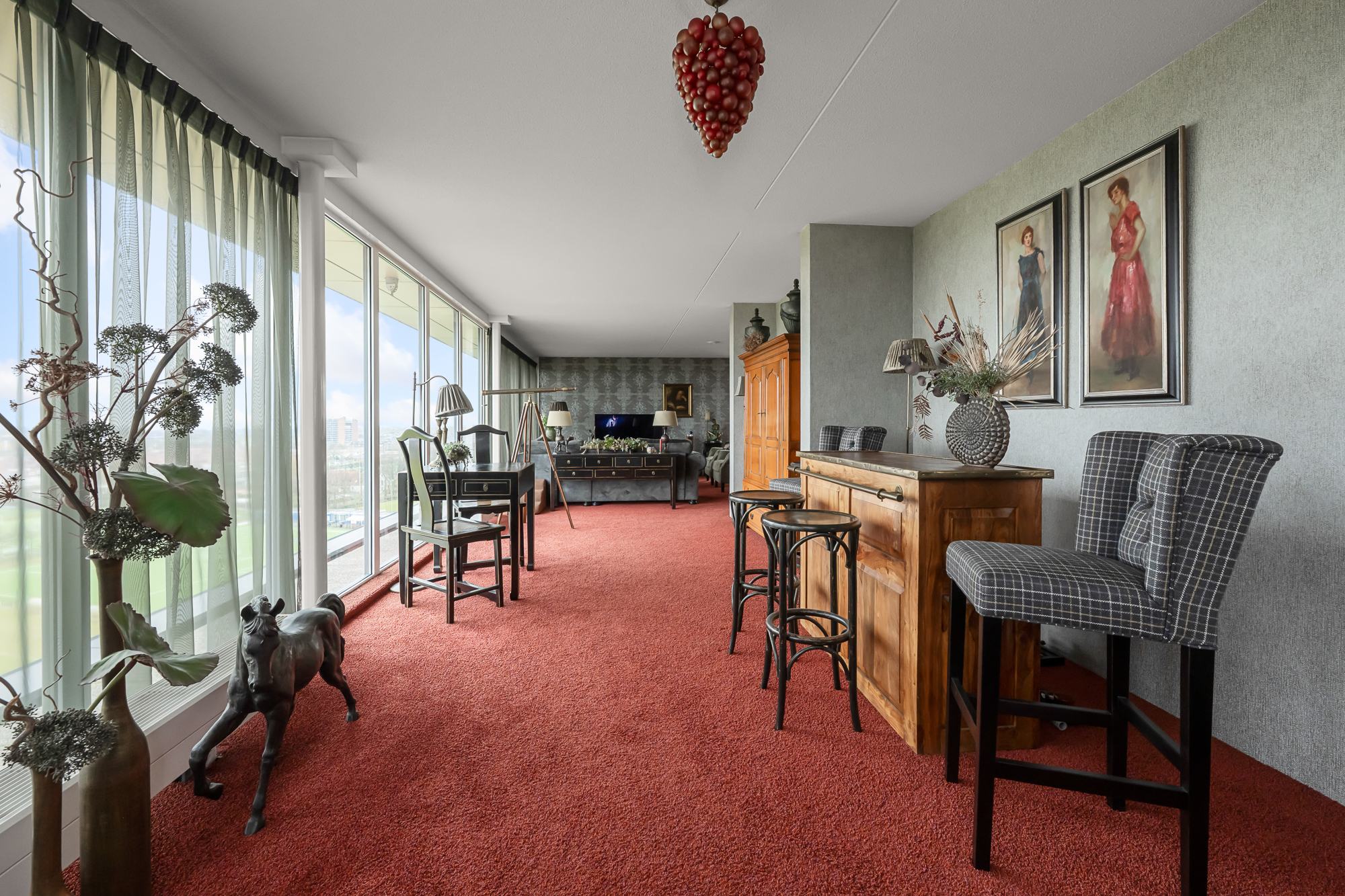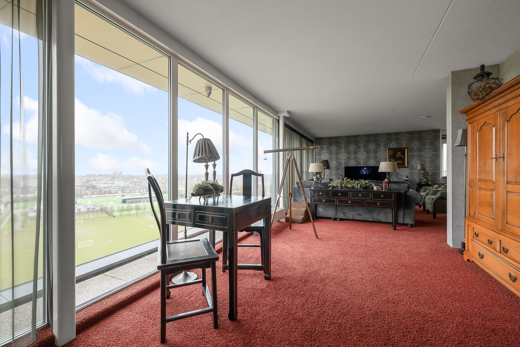 Via de afgesloten entree met liftinstallatie bereikt u rechtstreeks de hoogste verdieping, waar dit indrukwekkende penthouse zich bevindt. Zodra de deuren openen, ervaart u direct de rust en privacy die deze woonlaag zo bijzonder maken. De royale living vormt het hart van de woning en wordt gekenmerkt door grote raampartijen die zorgen voor een prachtige lichtinval en een weids uitzicht over de stad en het aangrenzende groen. Hier geniet u dagelijks van ruimte, comfort en een panoramisch decor dat nooit verveelt.