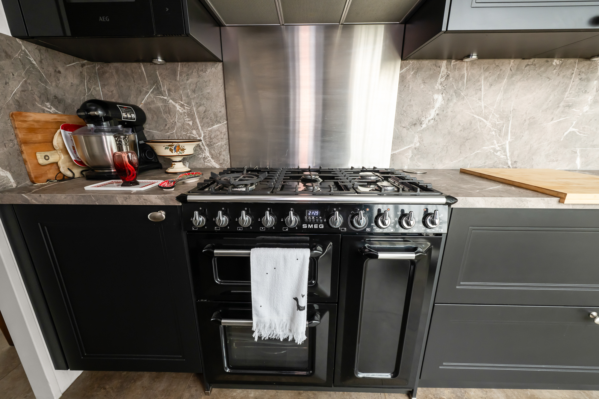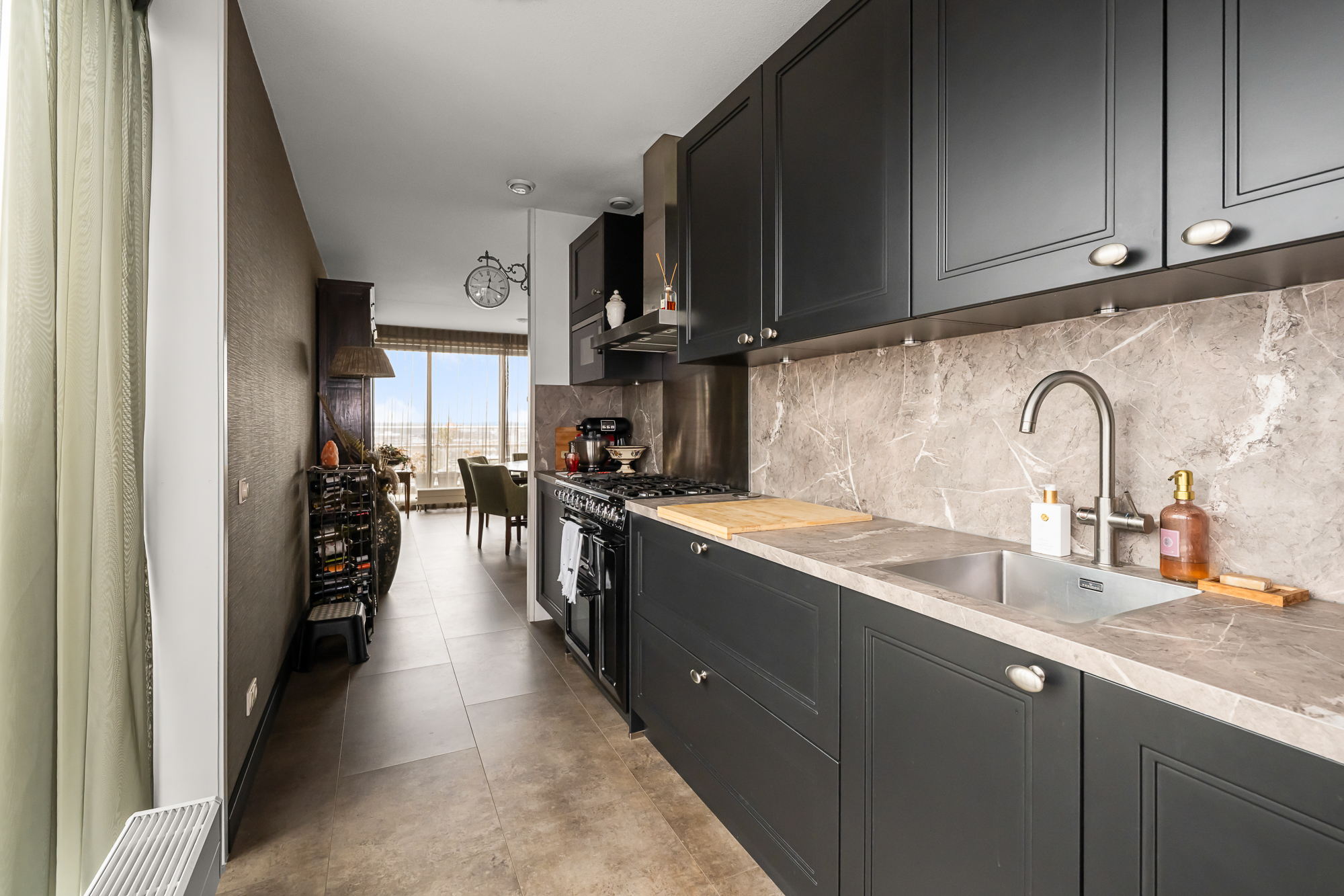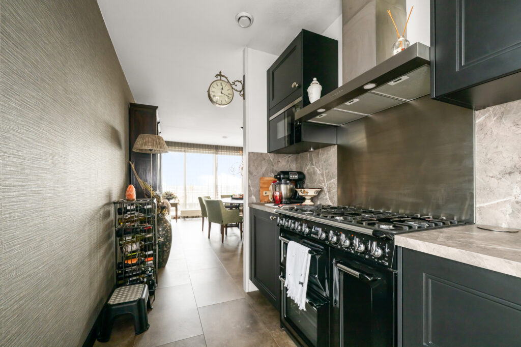 De open keuken sluit naadloos aan op de leefruimte en is uitgevoerd met diverse inbouwapparatuur, waardoor koken en gezellig samenzijn moeiteloos samengaan. Dankzij de royale opzet is er volop plek voor een grote eettafel en een comfortabele zithoek.