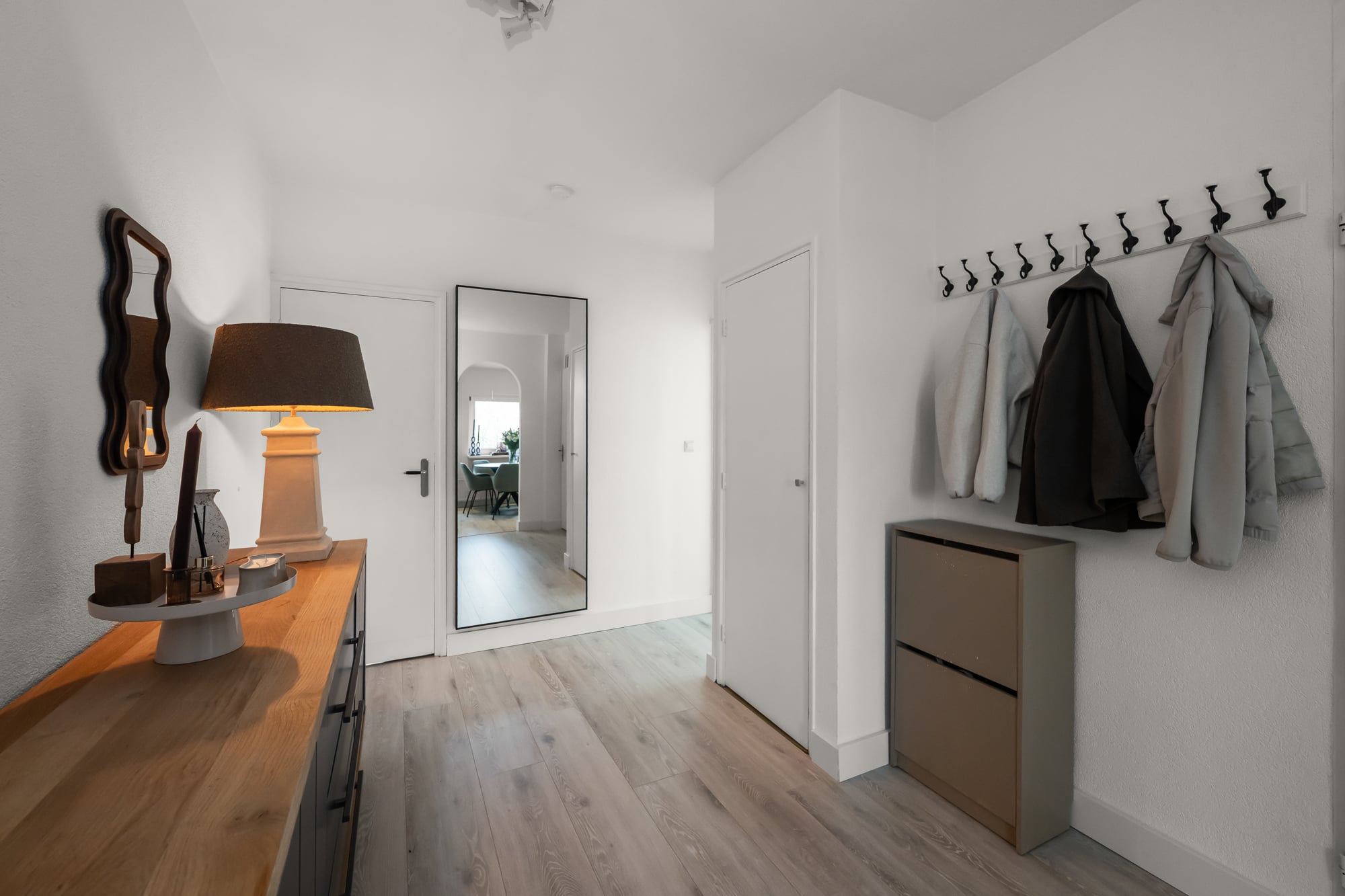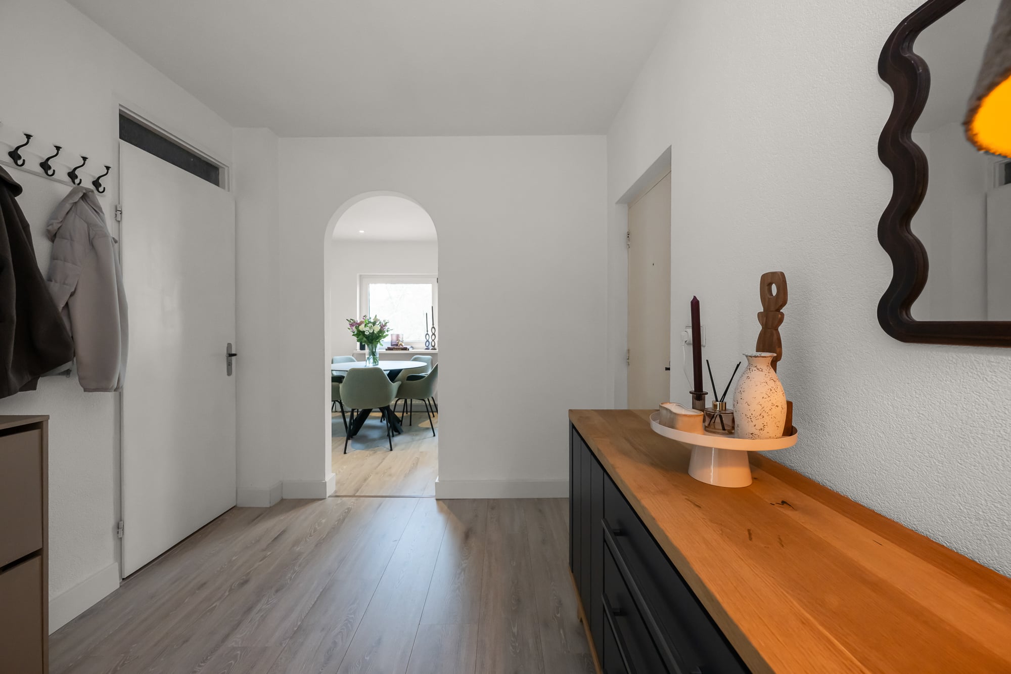 Via de portiek stappen we naar de eerste verdieping. Hier kom je binnen in een ruime hal met voldoende ruimte voor de jassen, tassen en schoenencollecties. De hal geeft toegang tot de verschillende ruimtes. De woonkamer voelt direct prettig en licht aan dankzij de grote ramen. Hier is genoeg ruimte voor een gezellige zithoek, waardoor het een fijne plek is om te ontspannen, thuis te werken of vrienden uit te nodigen.
