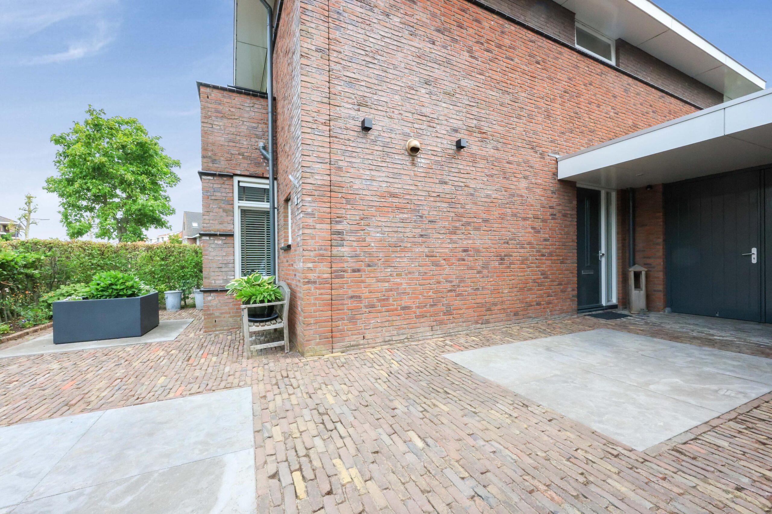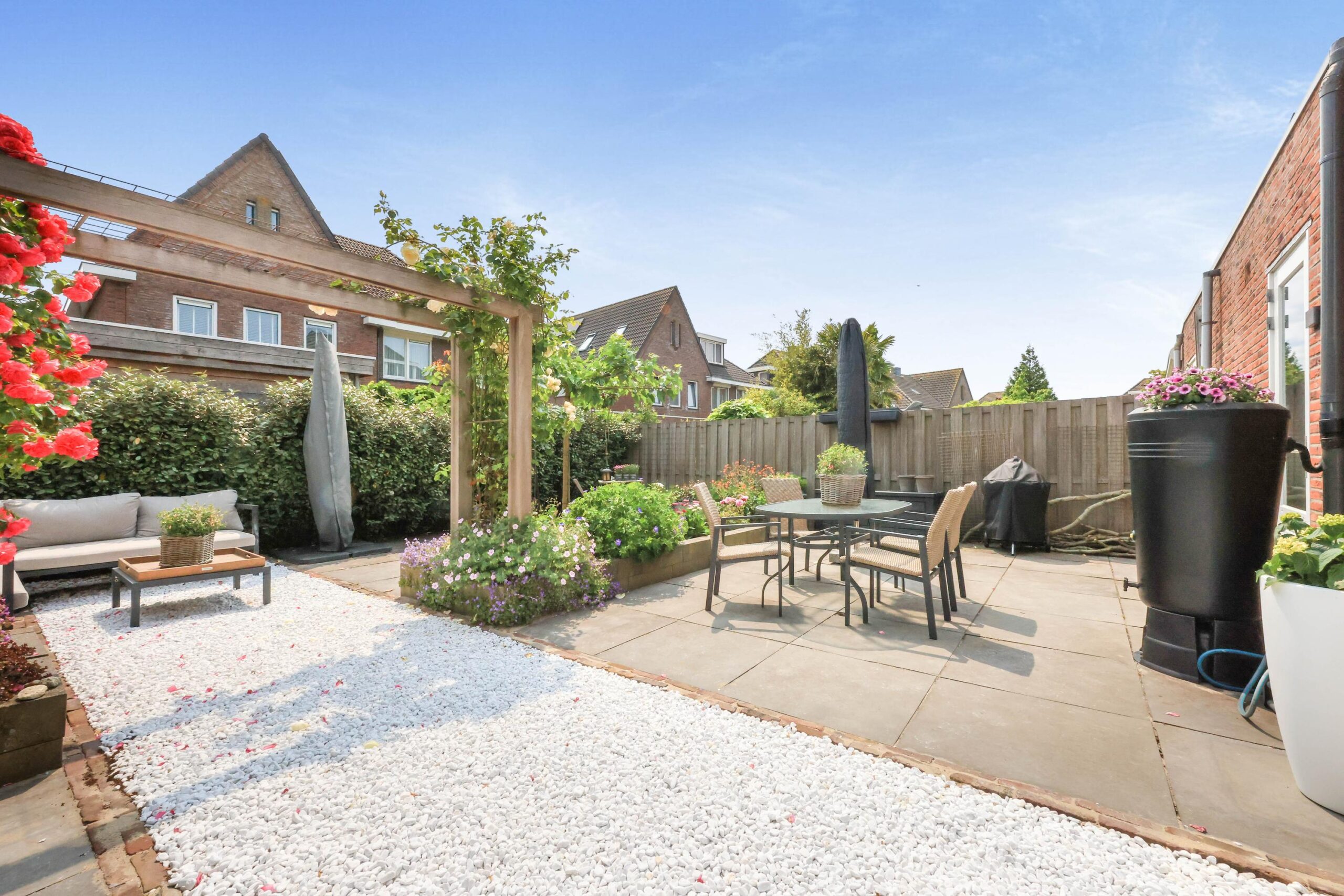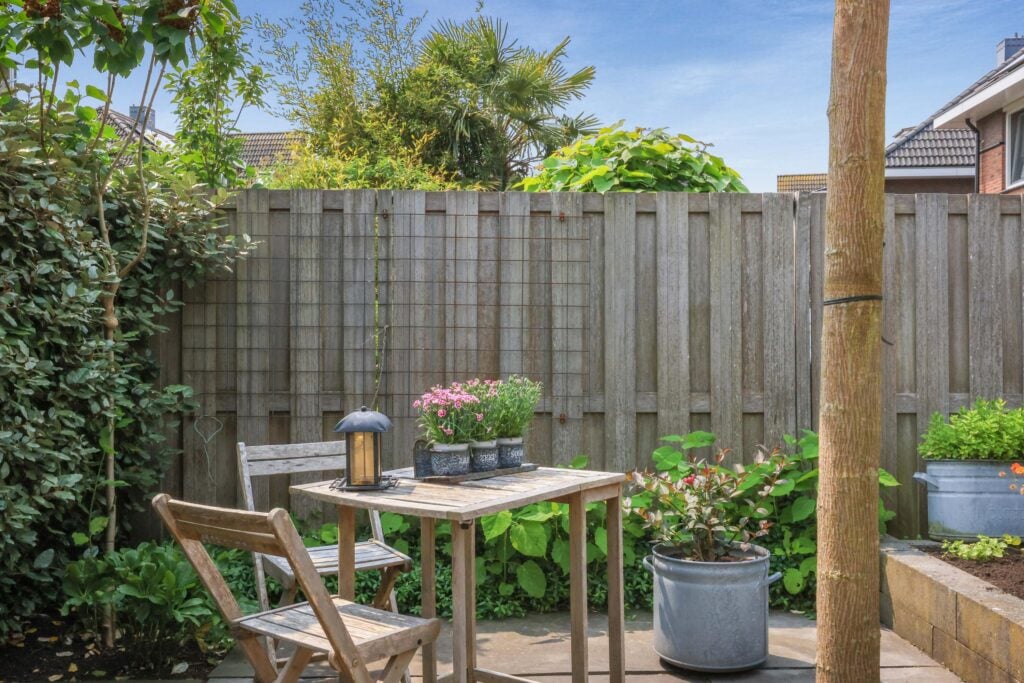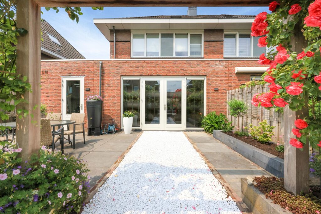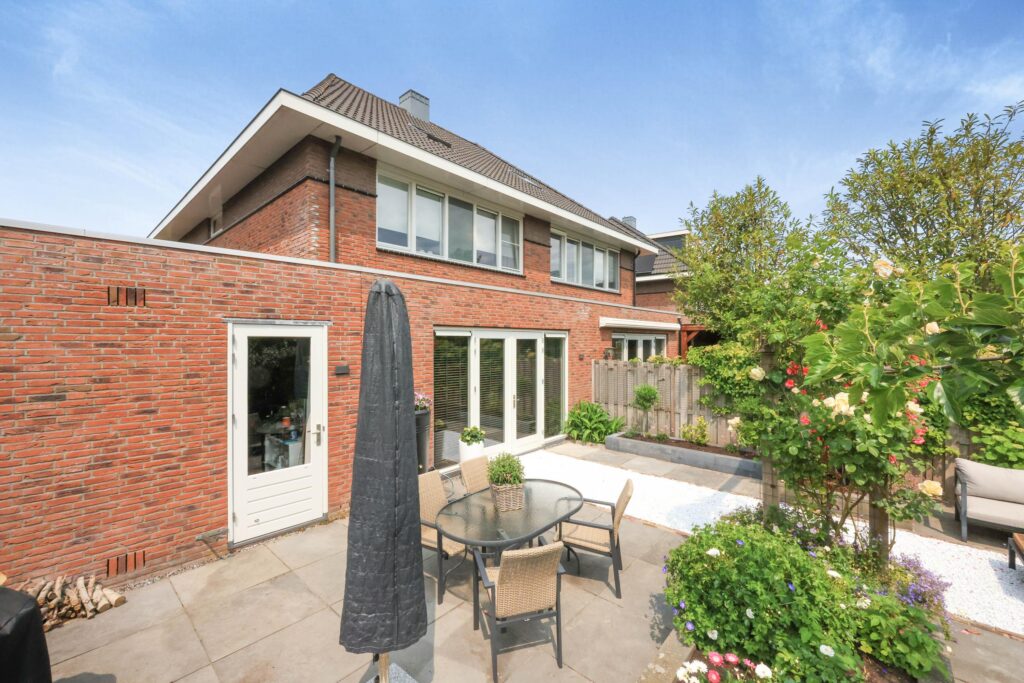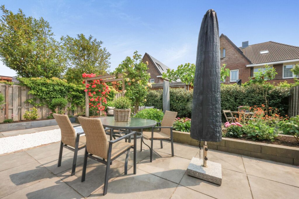 De achtertuin is met zorg aangelegd en biedt een fijne combinatie van groen en terrassen. Hier is altijd wel een plek in de zon of schaduw te vinden. De tuin biedt veel privacy en is een heerlijke plek om te ontspannen.