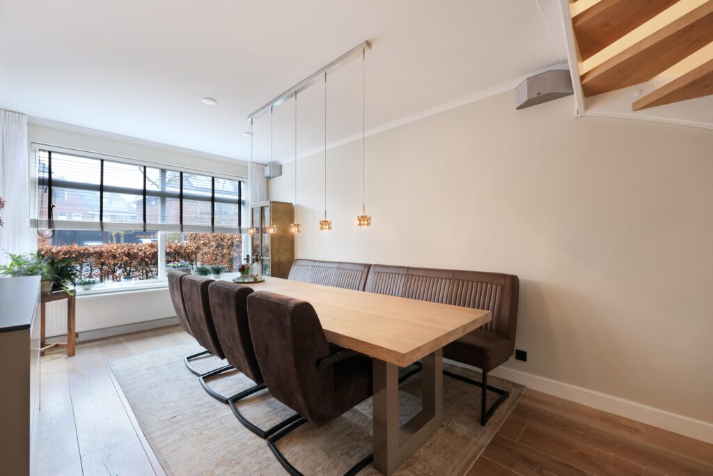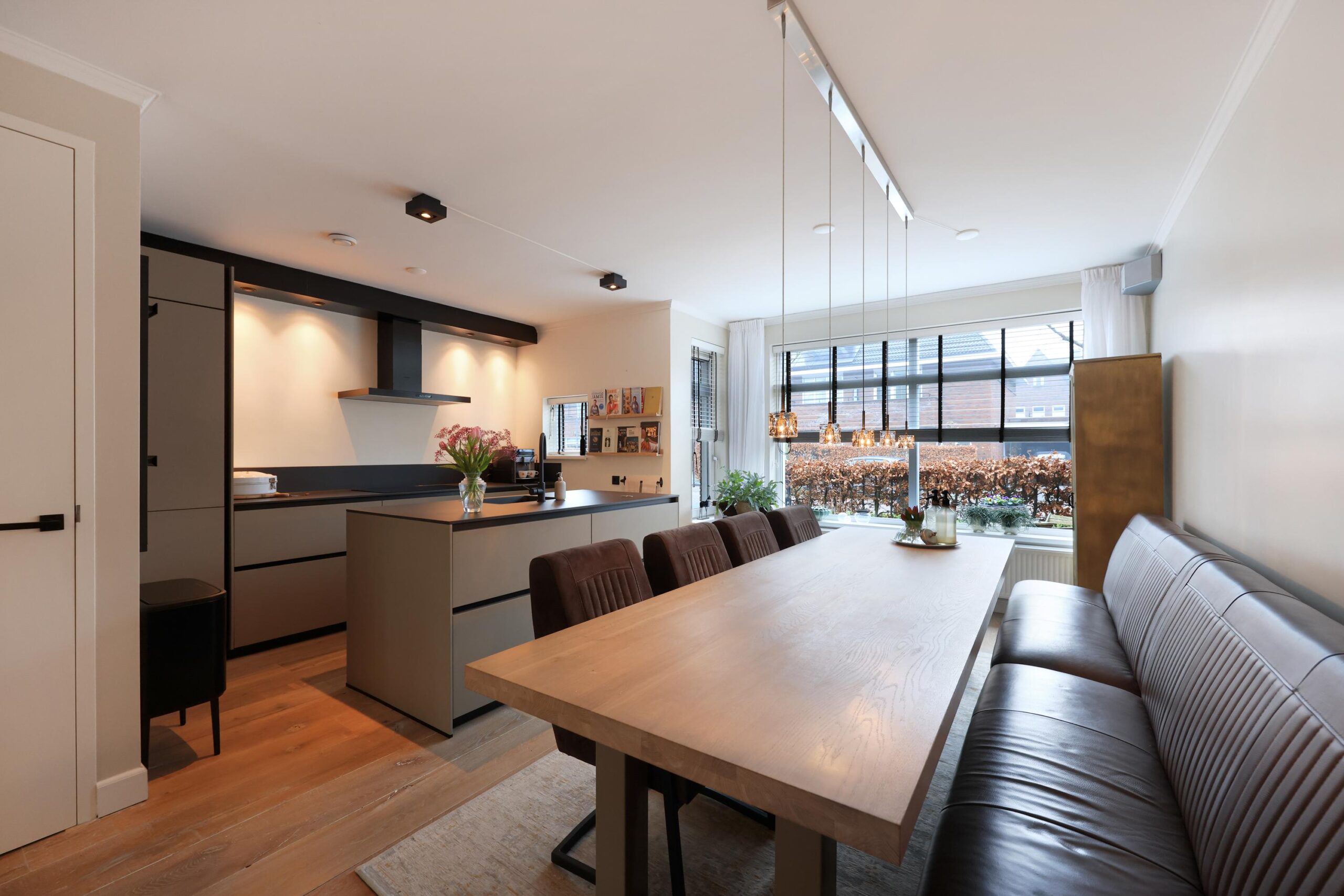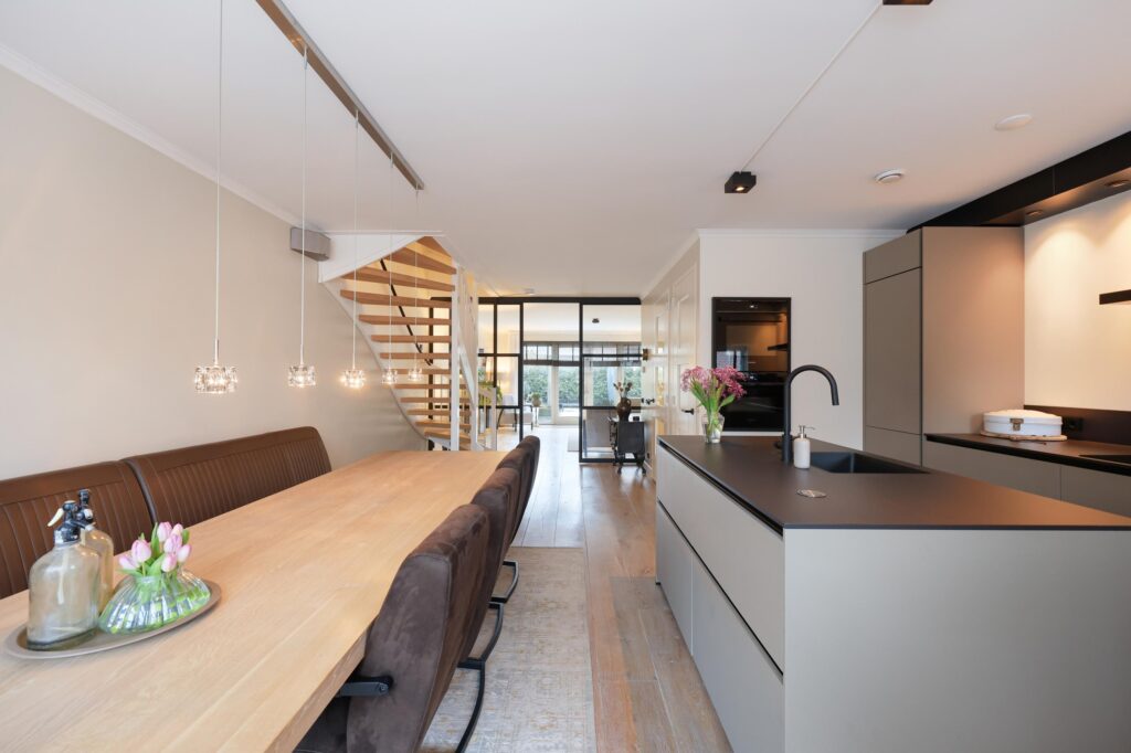 De verzorgde voortuin is een voorbode voor wat er binnen je te wachten staat. Vanuit de hal stap je de royale leefruimte binnen, waar direct de ruimte en het licht opvallen. De moderne open keuken vormt het hart van de woning en is uitgevoerd met een kookeiland en strakke kastenwand. Aansluitend is er volop ruimte voor een grote eettafel, ideaal voor het koken en gezellige avonden. De woonkamer is breed opgezet en dankzij de grote raampartijen aan de achterzijde geniet je hier van een fijne verbinding met de tuin.