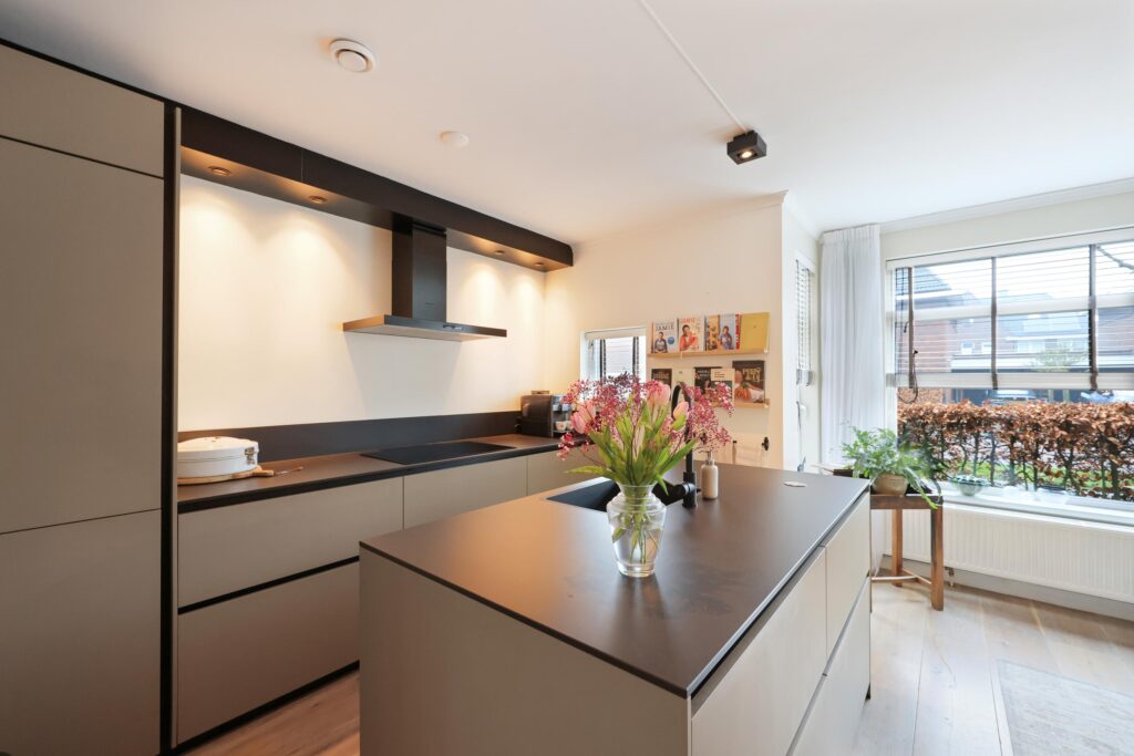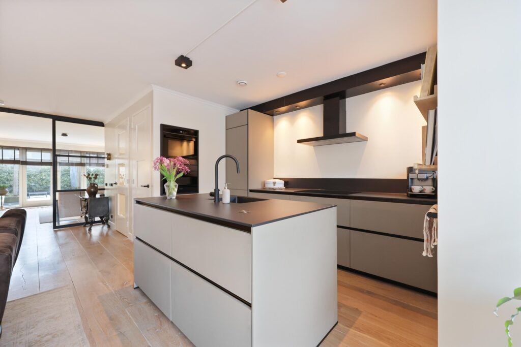 – Moderne keuken uit 2024 met kookeiland en inbouwapparatuur;