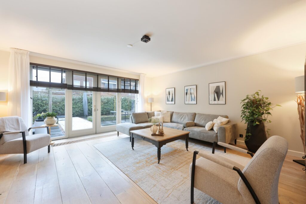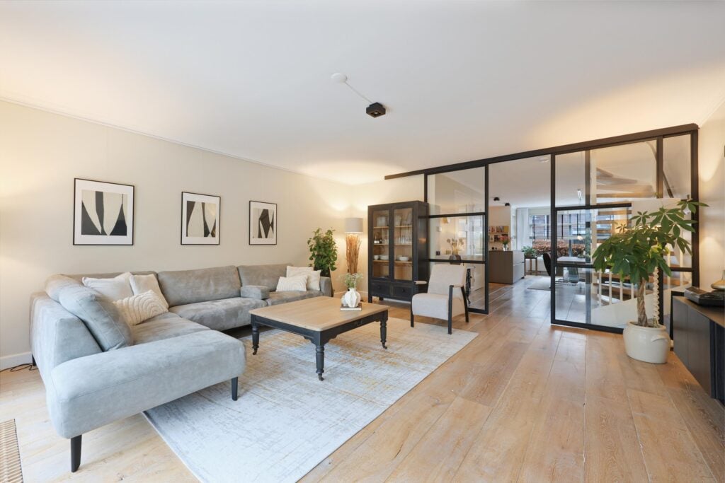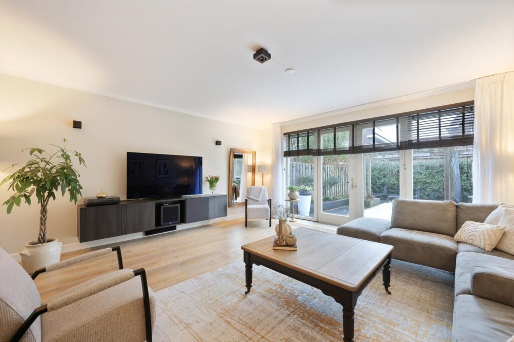 – Riante woonkamer met massief houten vloerdelen;