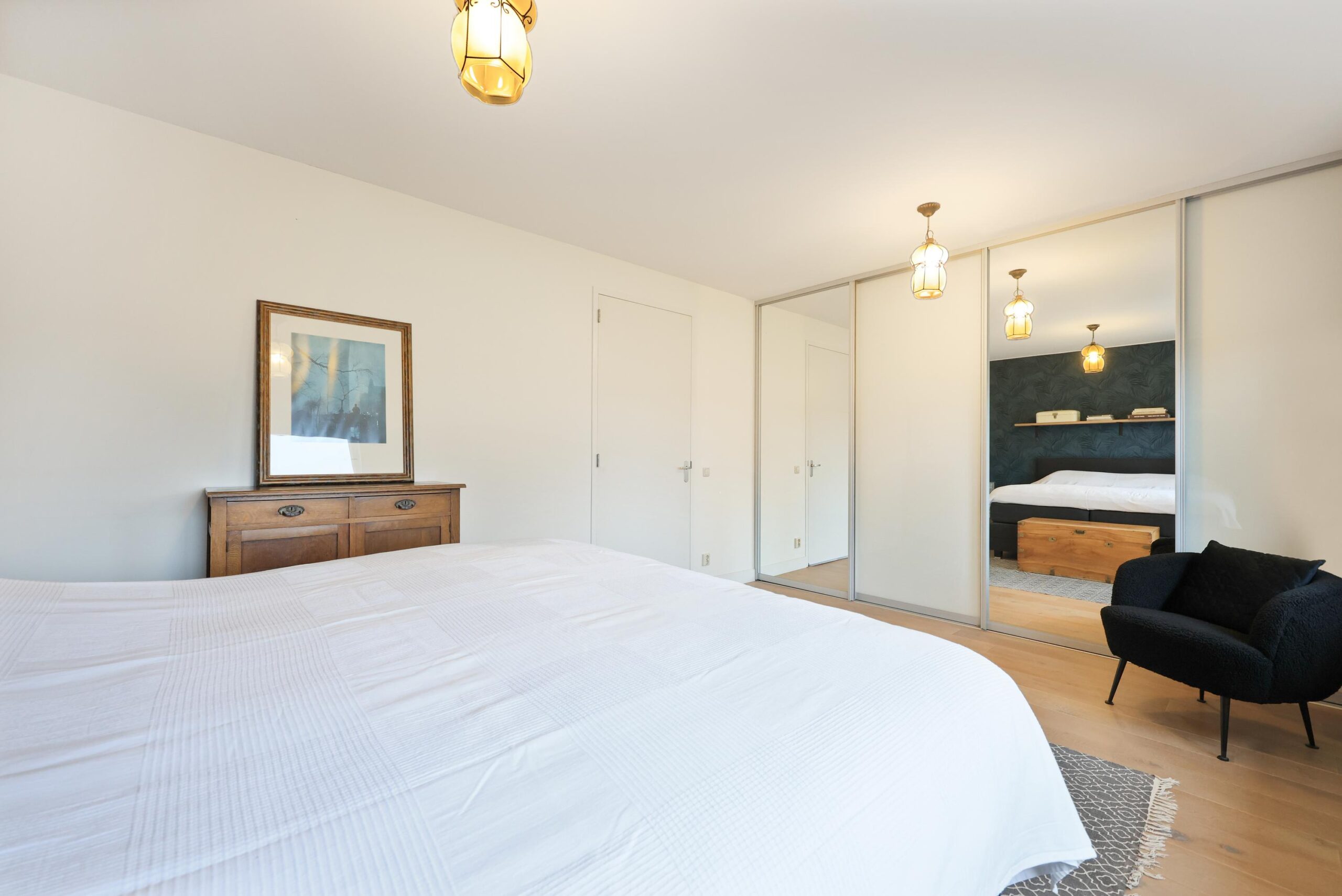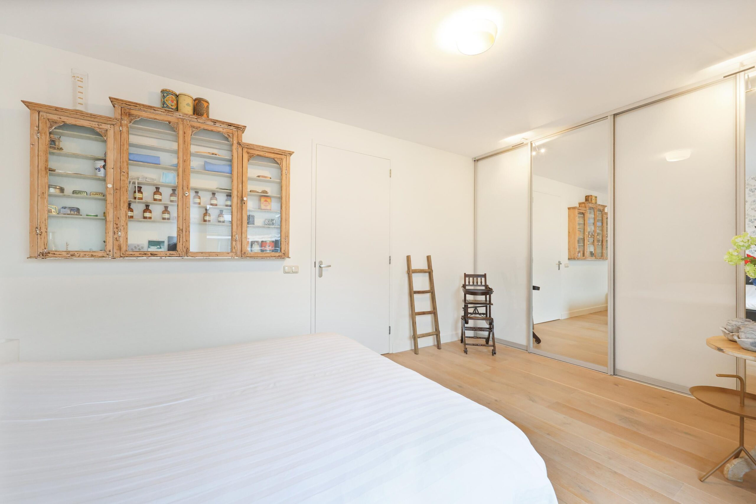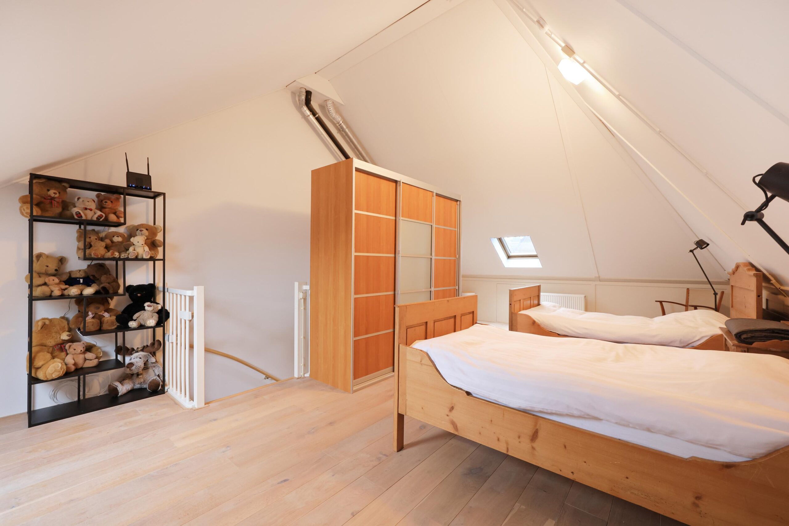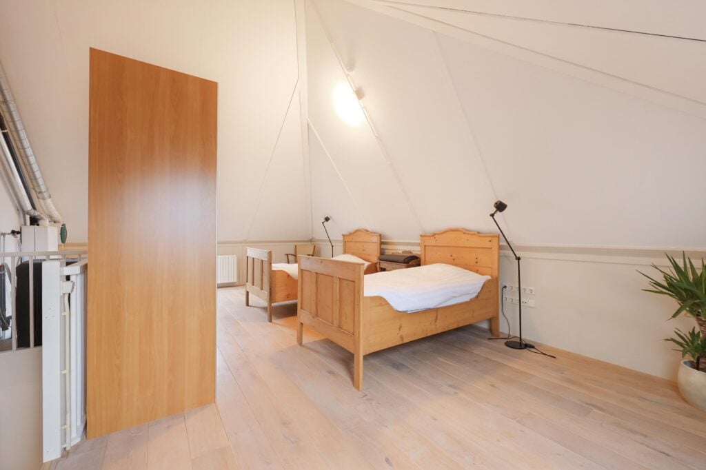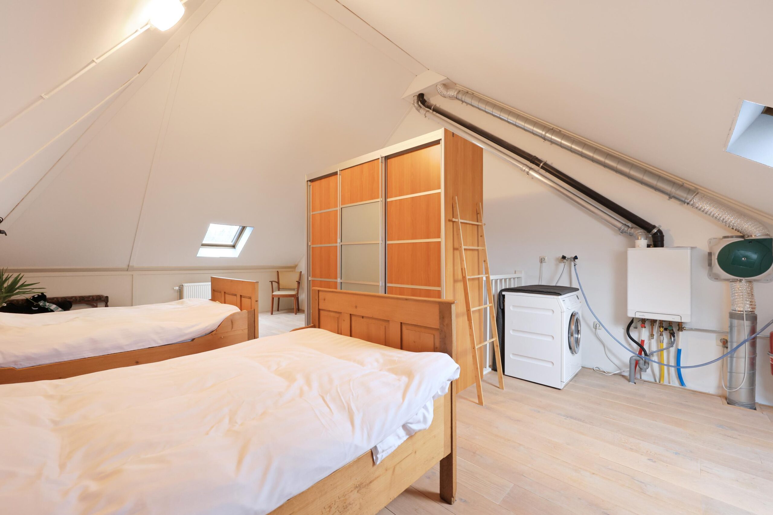 De zolderverdieping is een volwaardige extra leeflaag. Dankzij de hoogte en de twee dakramen is dit een lichte en ruime verdieping, momenteel ingericht als extra slaapruimte met veel bergruimte. Ideaal als derde slaapkamer, werkruimte of hobbykamer.