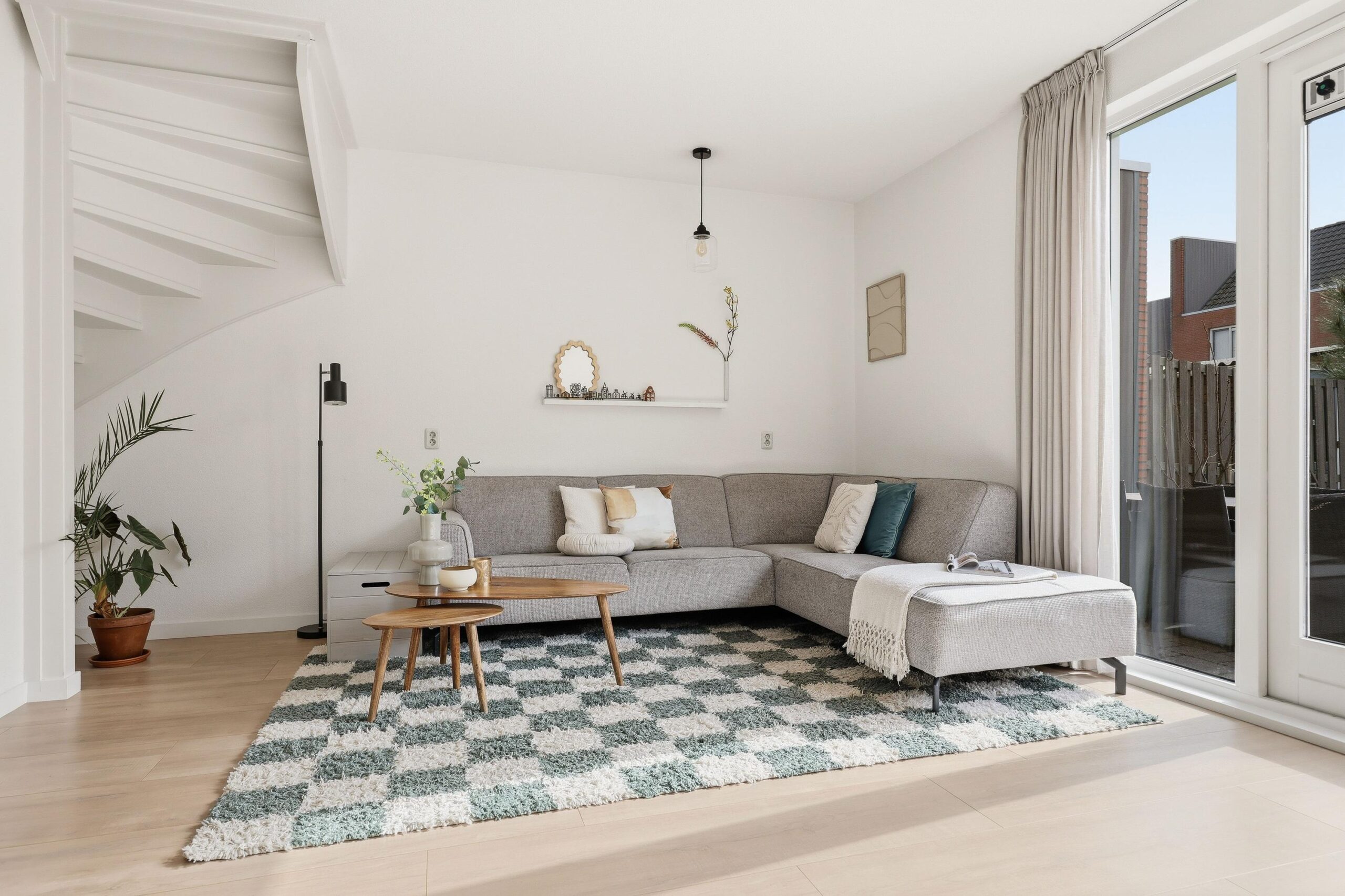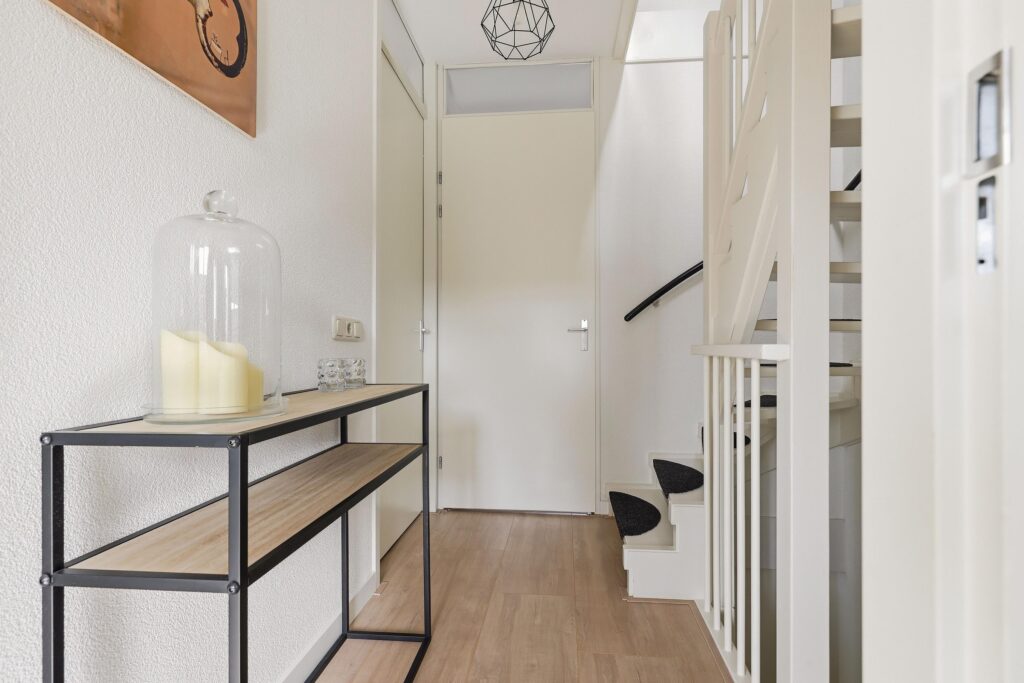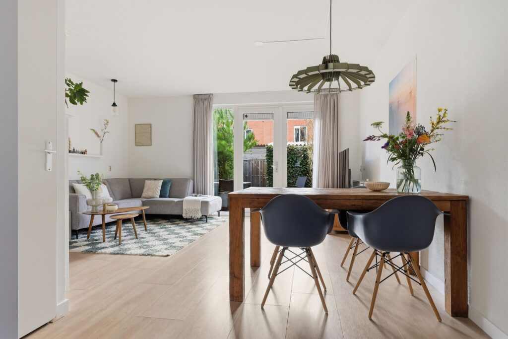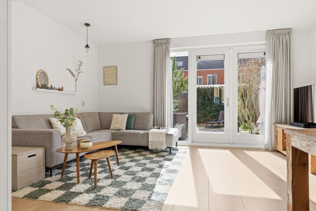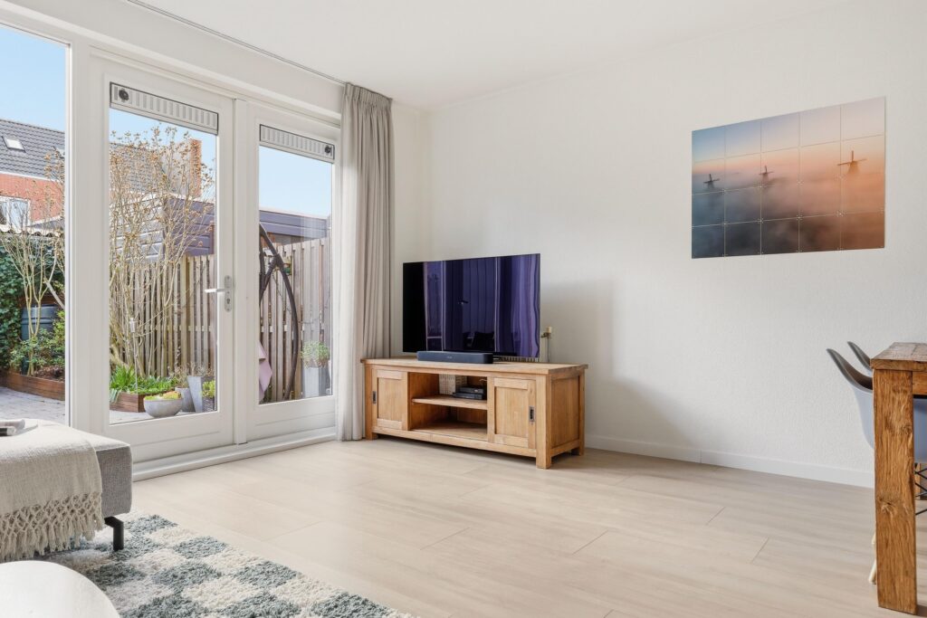 Bij binnenkomst valt direct de nette afwerking en prettige lichtinval op. De woning is gelegen aan een rustige straat en maakt direct een verzorgde indruk. De entree geeft toegang tot de hal met toilet en leidt naar de ruime woonkamer, waar grote openslaande deuren zorgen voor een open en lichte sfeer. De woonkamer is afgewerkt met een nette vloer en hoge witte plinten, wat het geheel een moderne en verzorgde uitstraling geeft. Aan de achterzijde zorgen openslaande deuren voor een directe verbinding met de zonnige tuin op het zuidoosten, waar je vrijwel de hele dag van de zon kunt genieten.