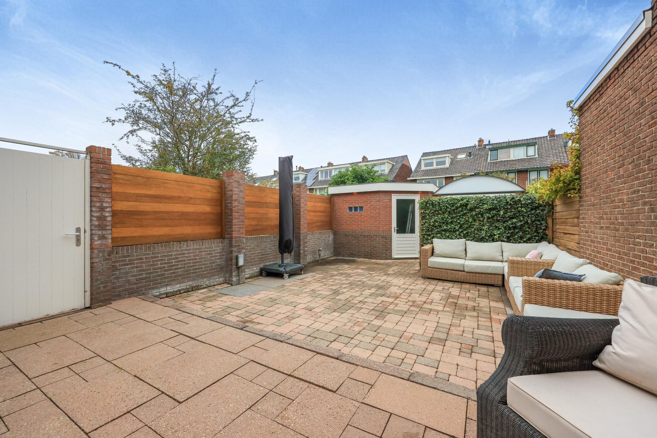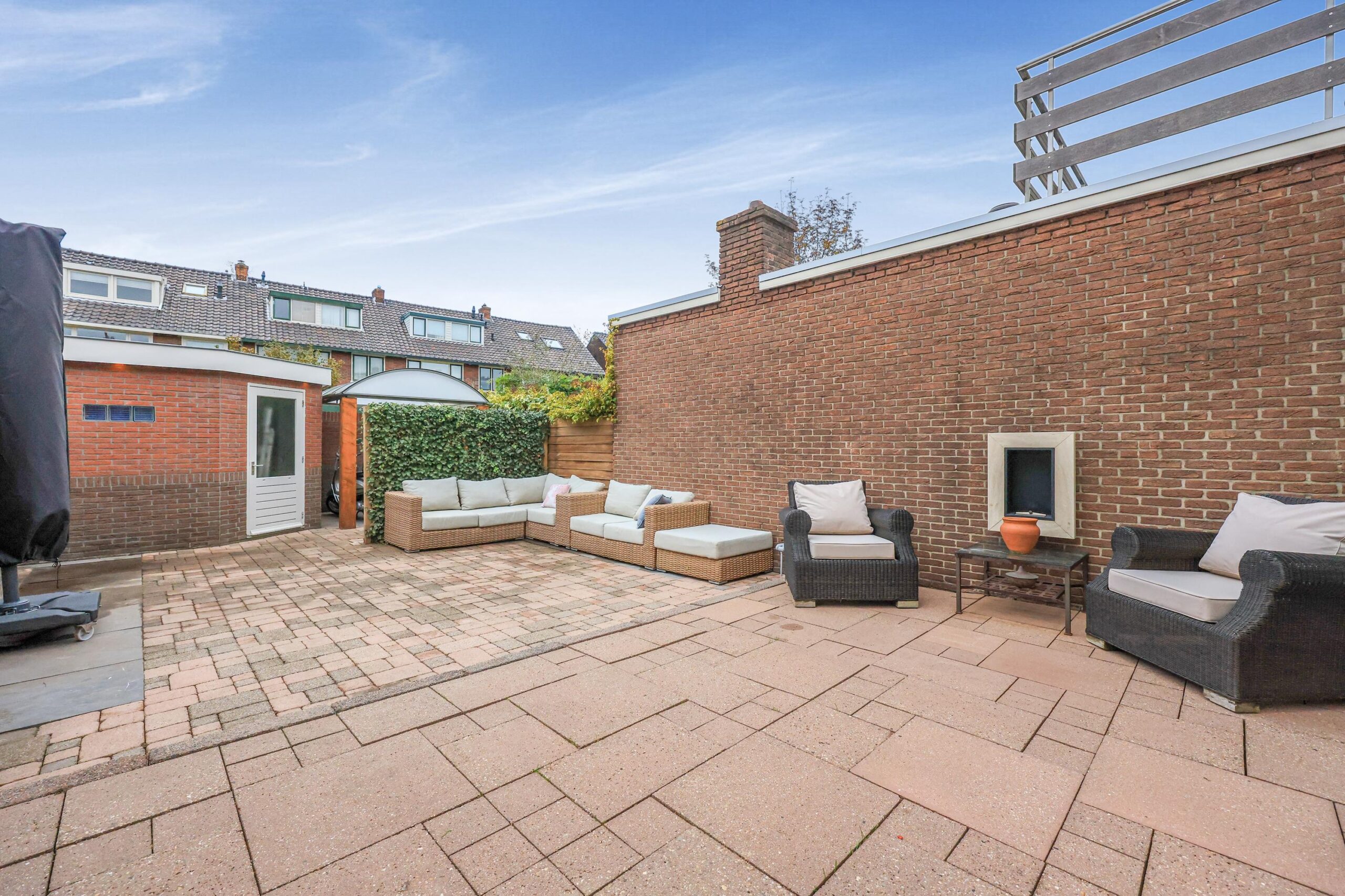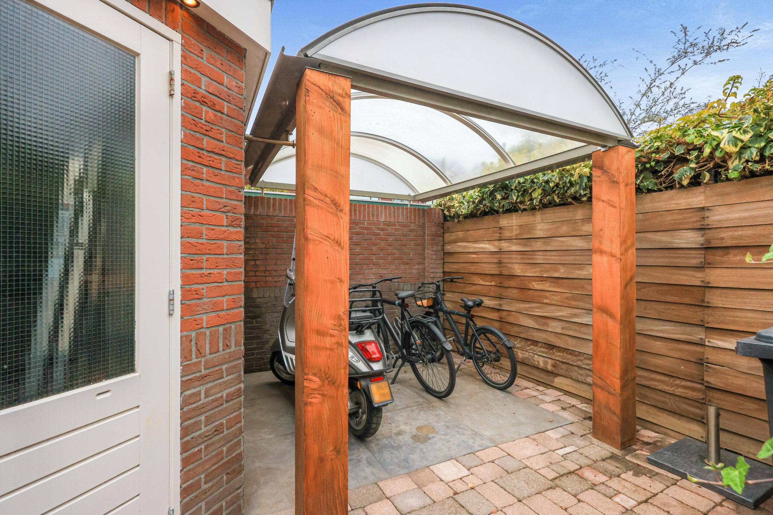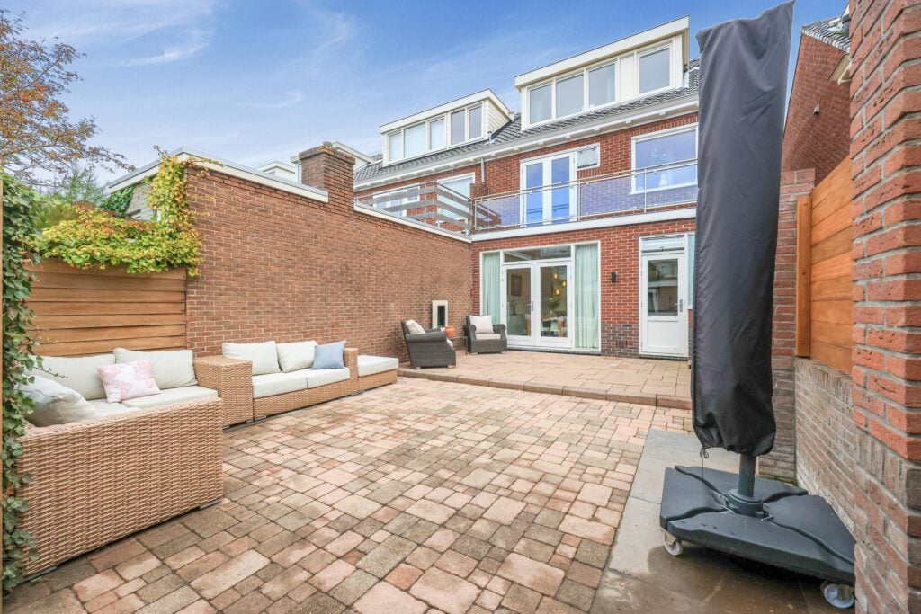 De fraai aangelegde achtertuin op het westen biedt veel privacy en zon in de middag en avond. Het is een heerlijke plek om te ontspannen en te genieten van het buitenleven. Via de zijkant van de woning kun je de tuin verlaten, waar zich een berging en een overkapping bevinden. Ideaal voor het stallen van fietsen, scooters of een motor.