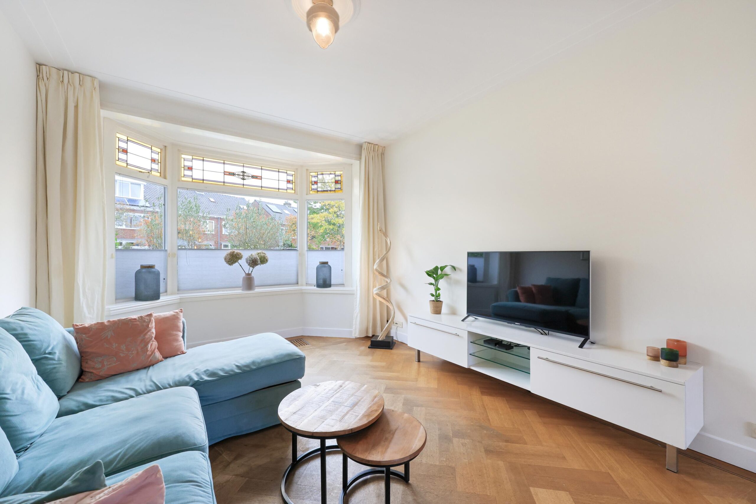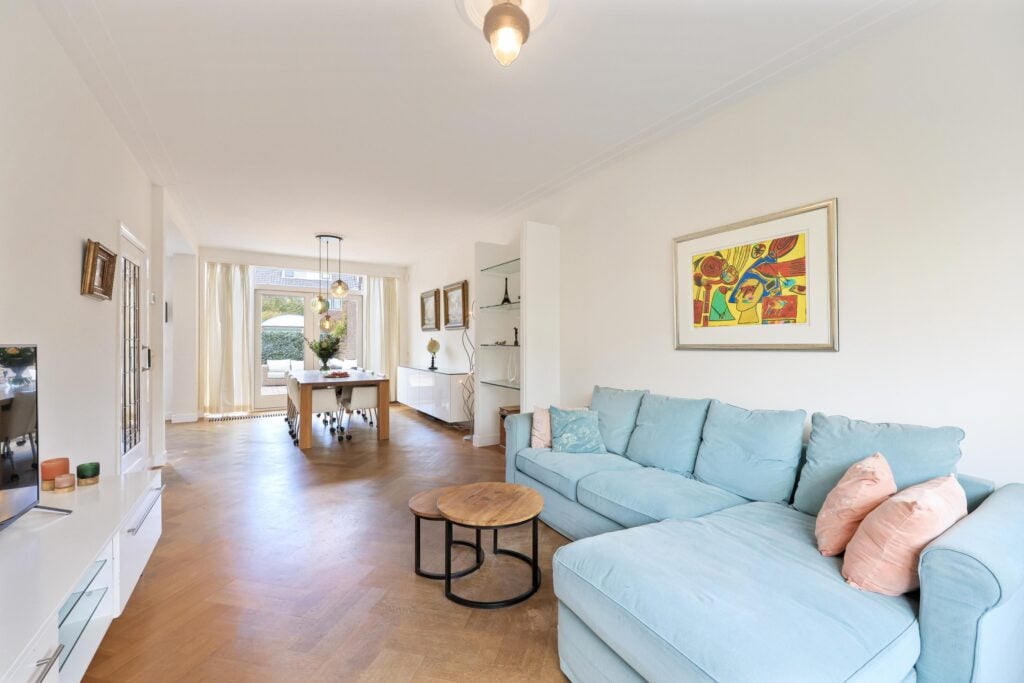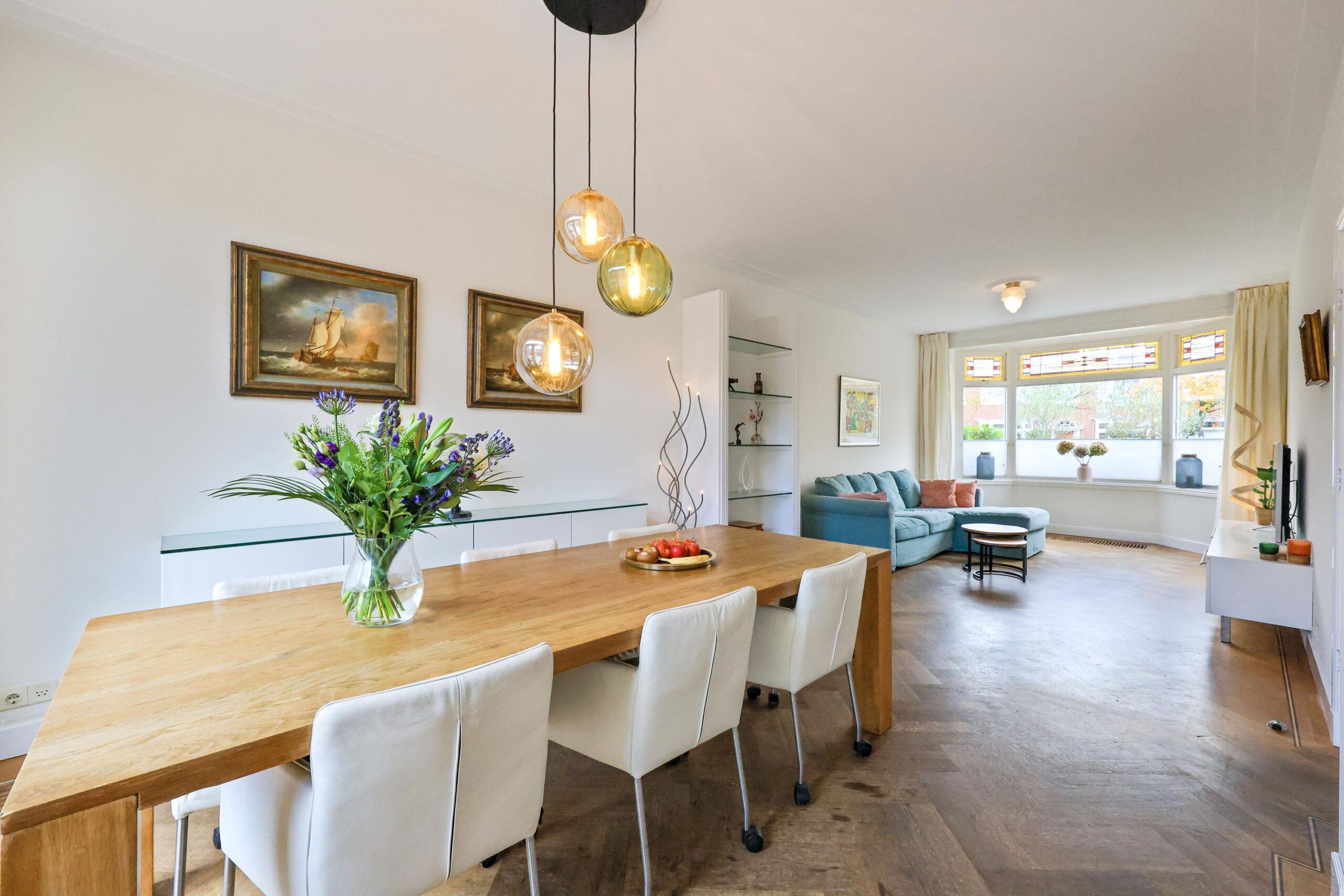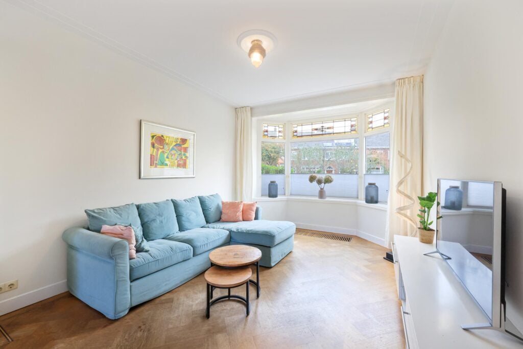 De woonkamer is licht en sfeervol, voorzien van een erker, karakteristieke glas-in-loodramen en openslaande deuren naar de tuin. Hier komt de authentieke stijl van de woning prachtig samen met het comfort van nu.
