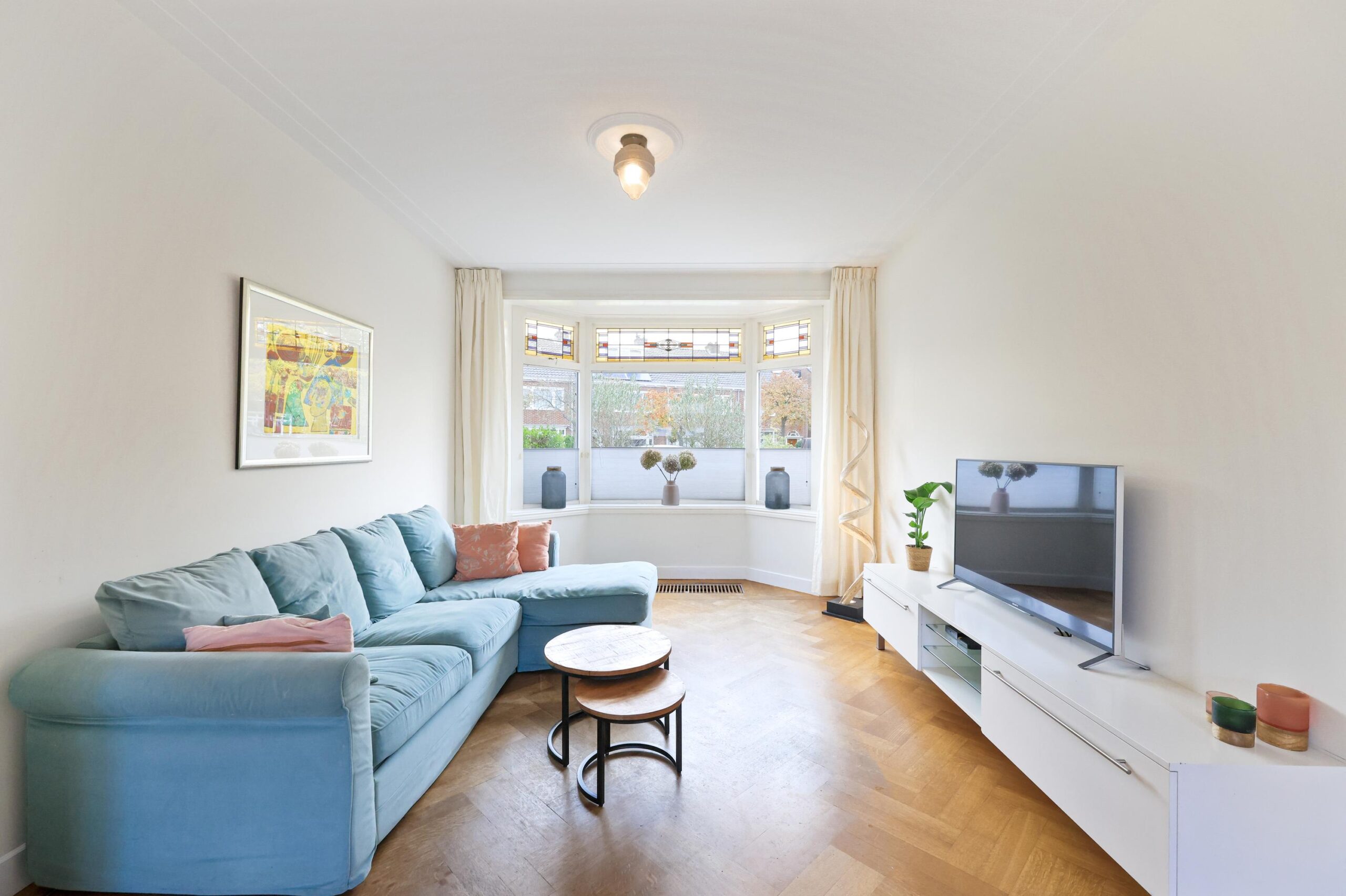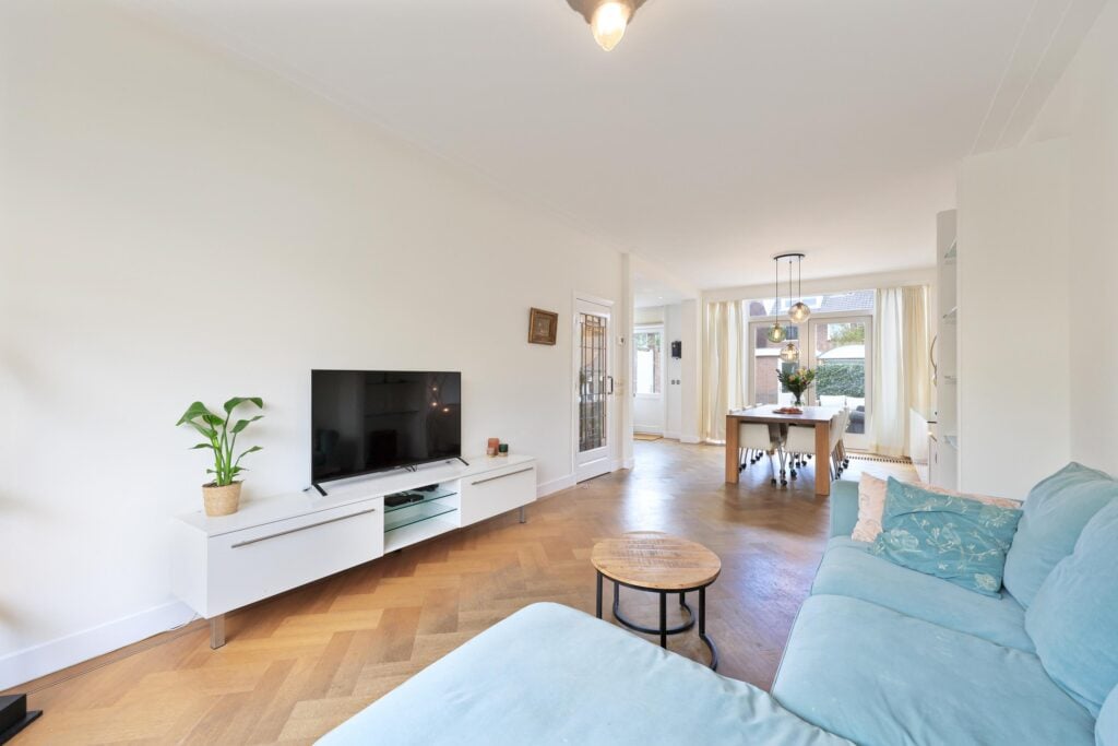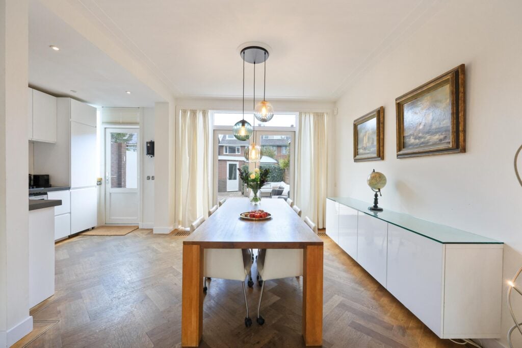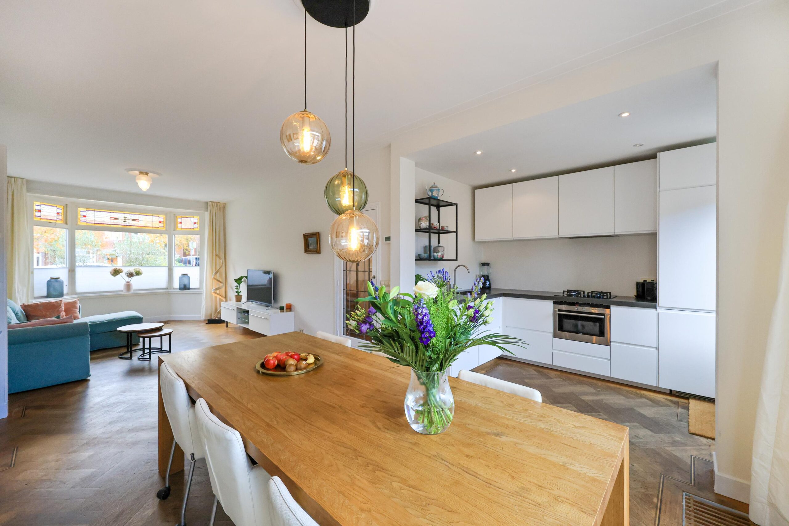 De woonkamer is licht en sfeervol, voorzien van een erker, karakteristieke glas-in-loodramen en openslaande deuren naar de tuin. Hier komt de authentieke stijl van de woning prachtig samen met het comfort van nu.