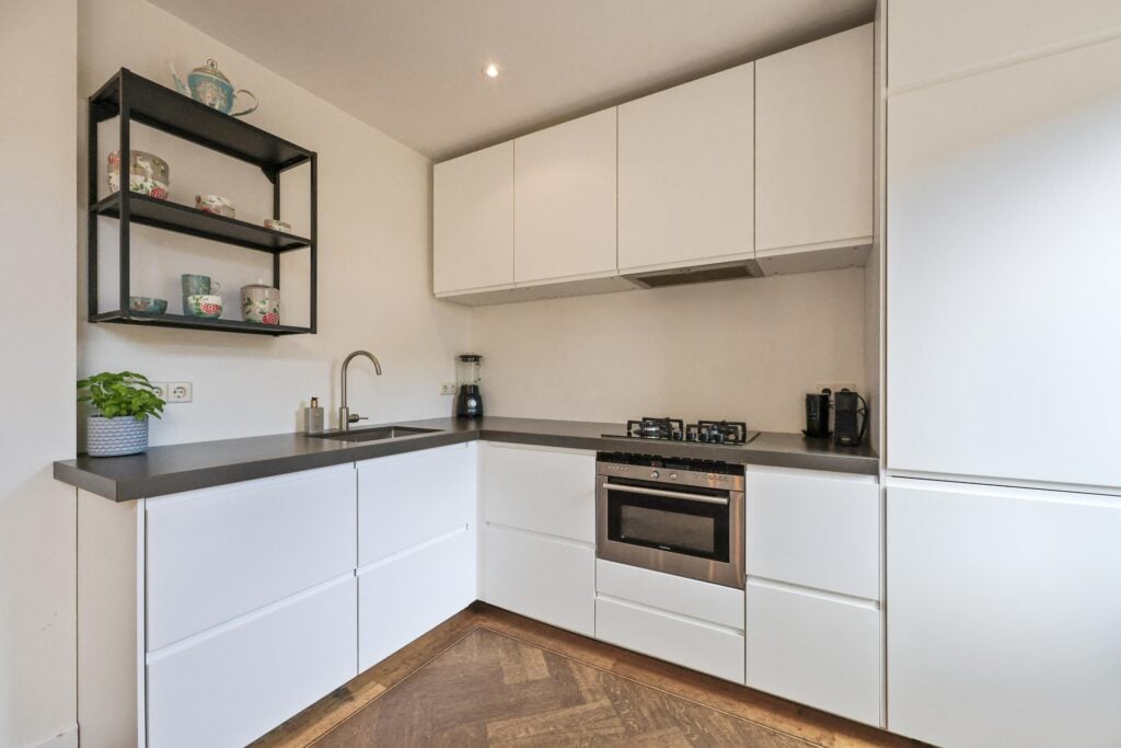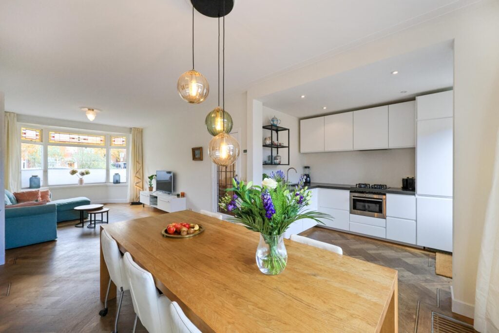 De moderne keuken aan de achterzijde is strak vormgegeven, praktisch ingedeeld en voorzien van alle wenselijke inbouwapparatuur. Vanuit de keuken heb je direct contact met de woonkamer, waardoor koken en gezellig samenzijn hier perfect samengaan.