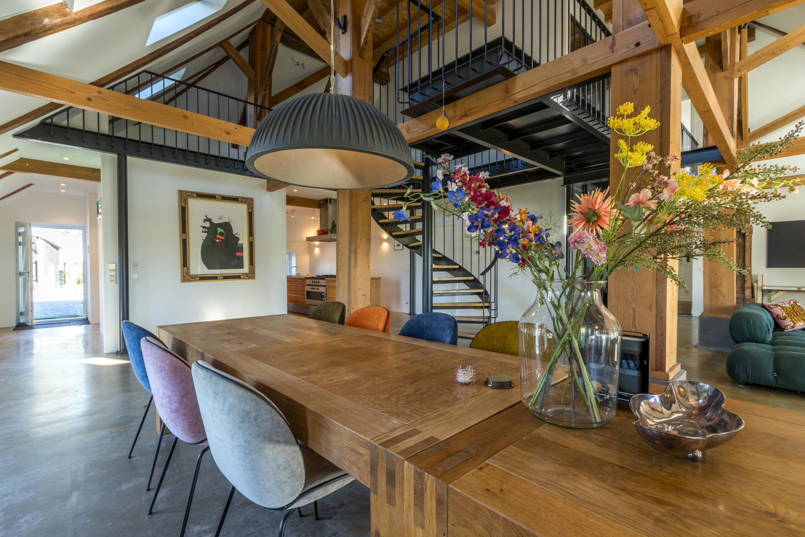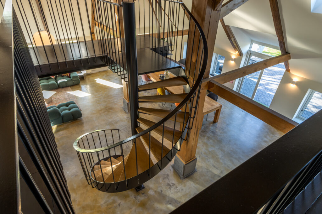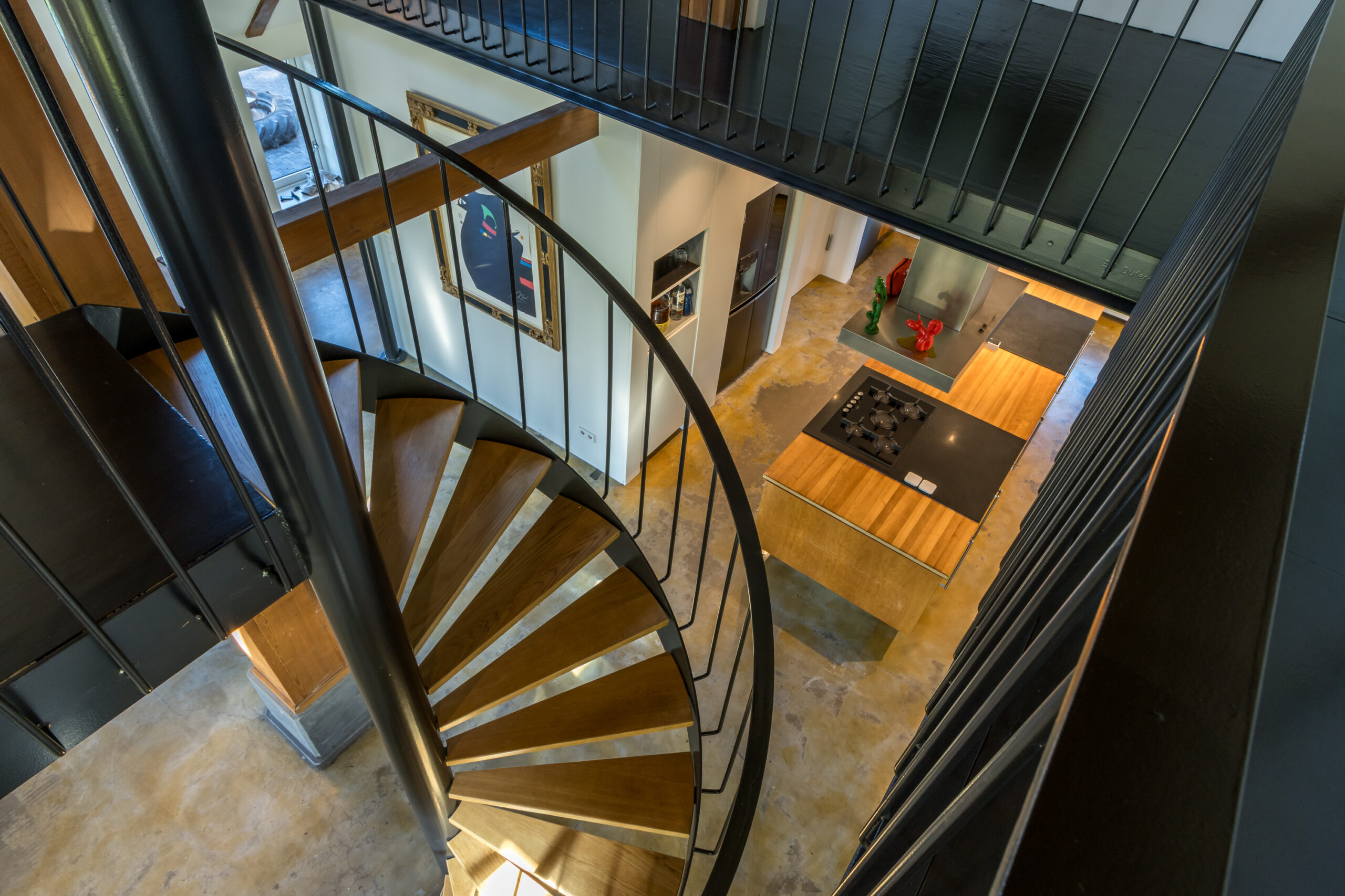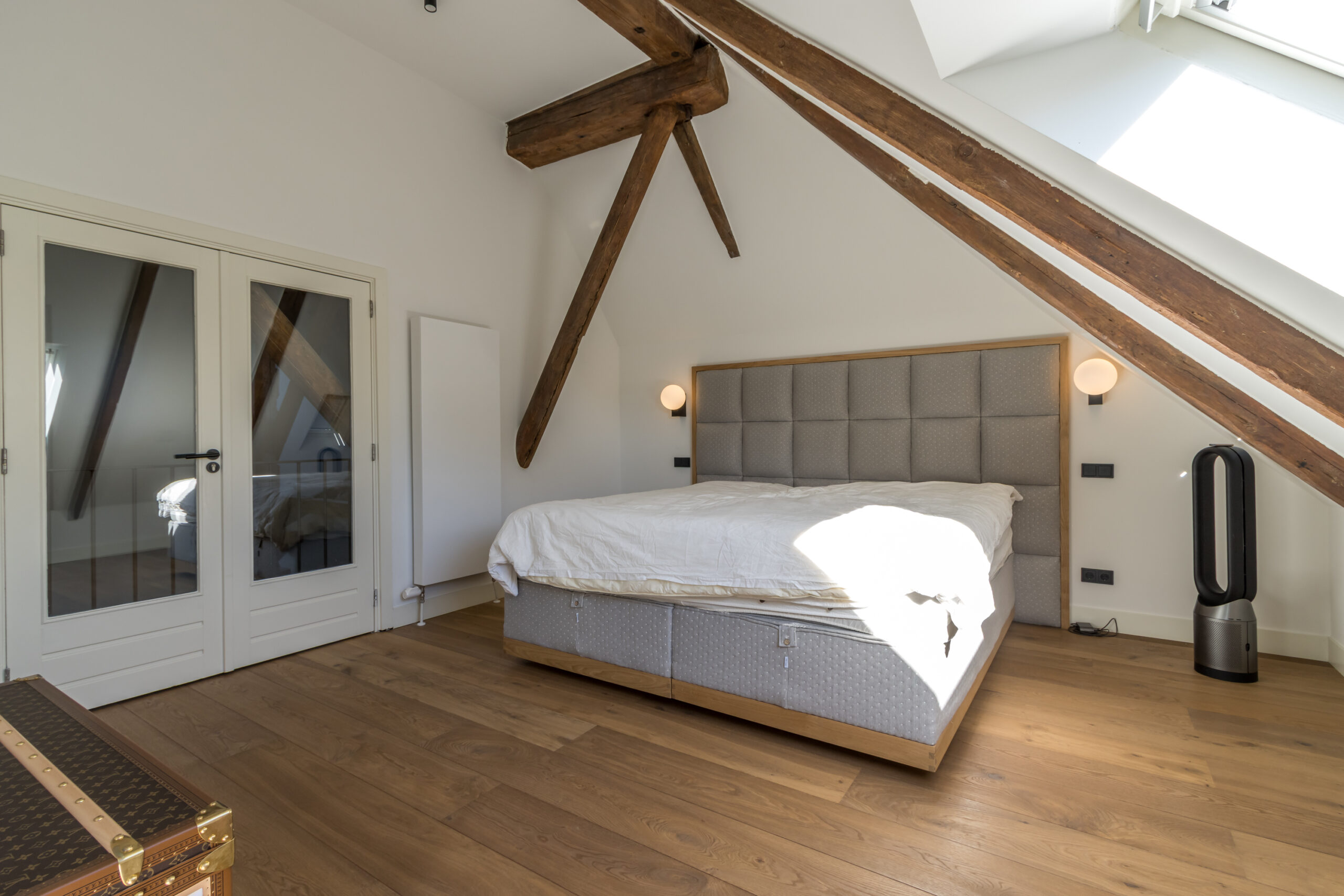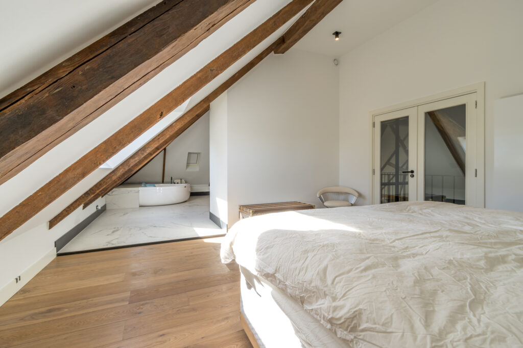 Via een moderne stalen trap bereikt u de verdieping waar de indrukwekkende masterbedroom zich bevindt. Deze royale slaapkamer heeft een eigen badkamer en kijkt via de vide uit over de prachtige leefruimte beneden, wat een bijzonder ruimtelijk effect geeft.