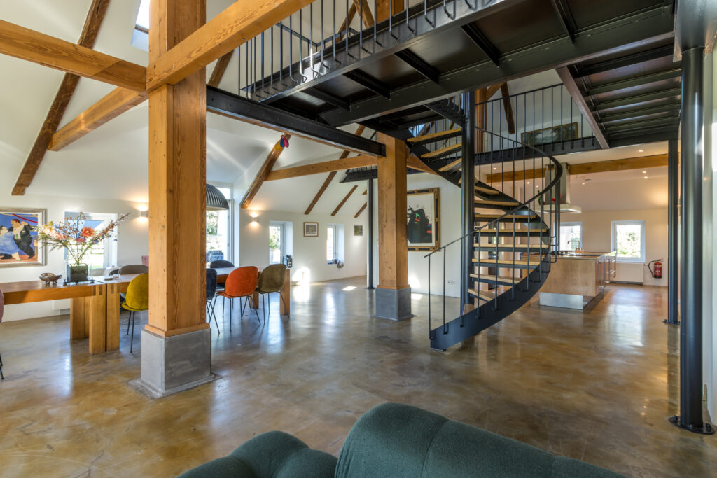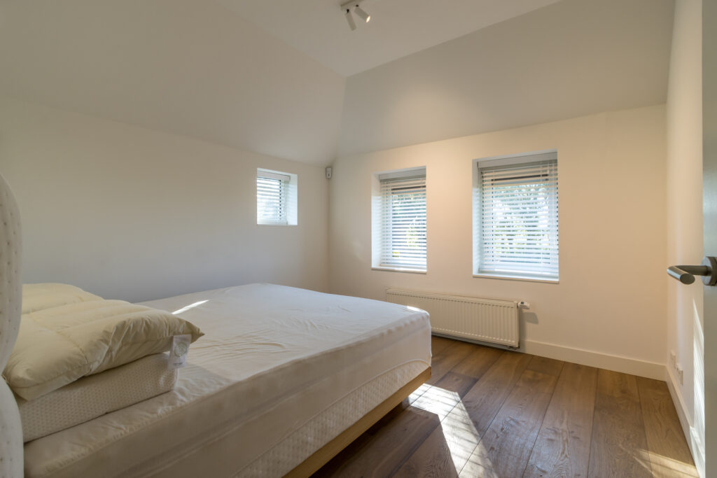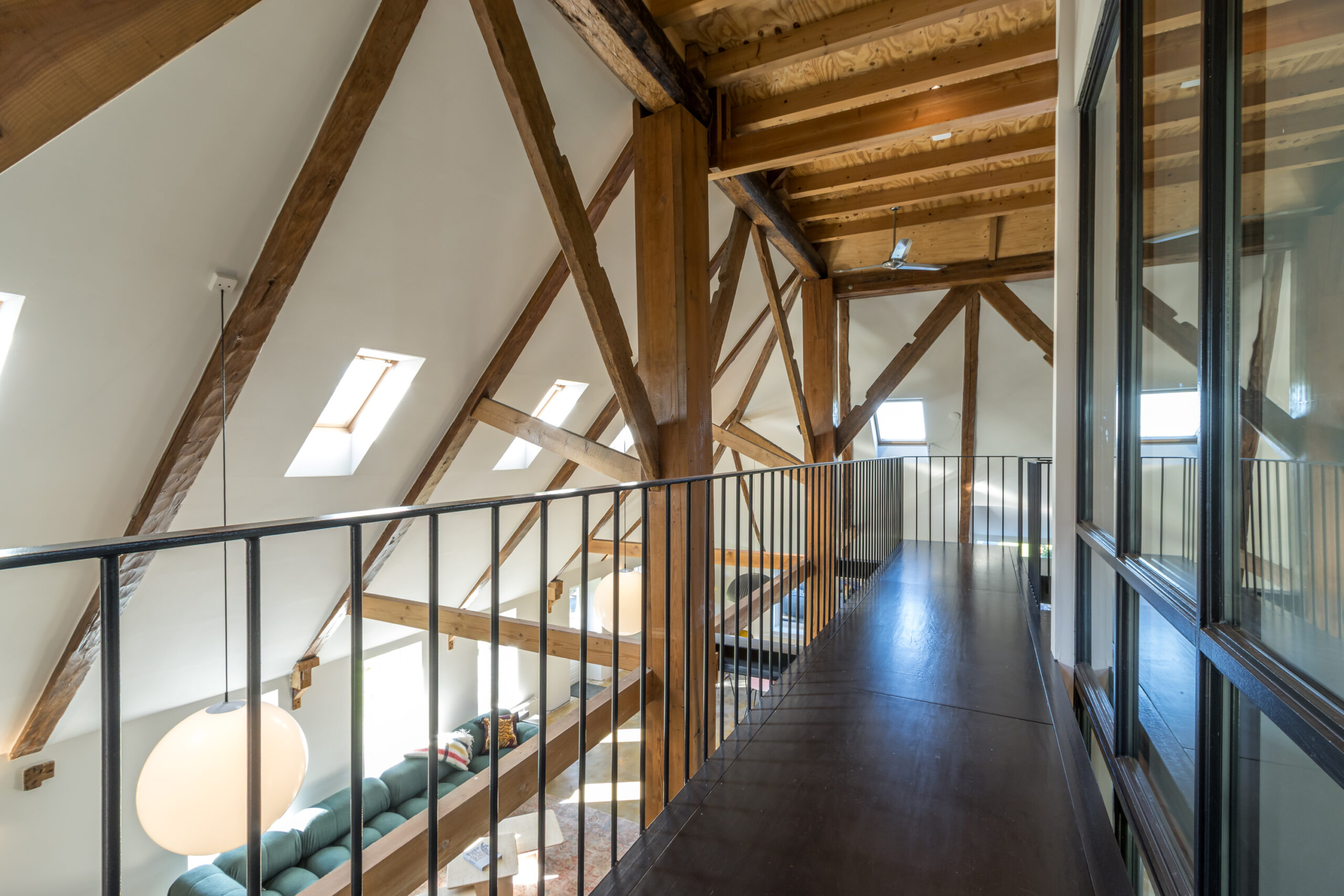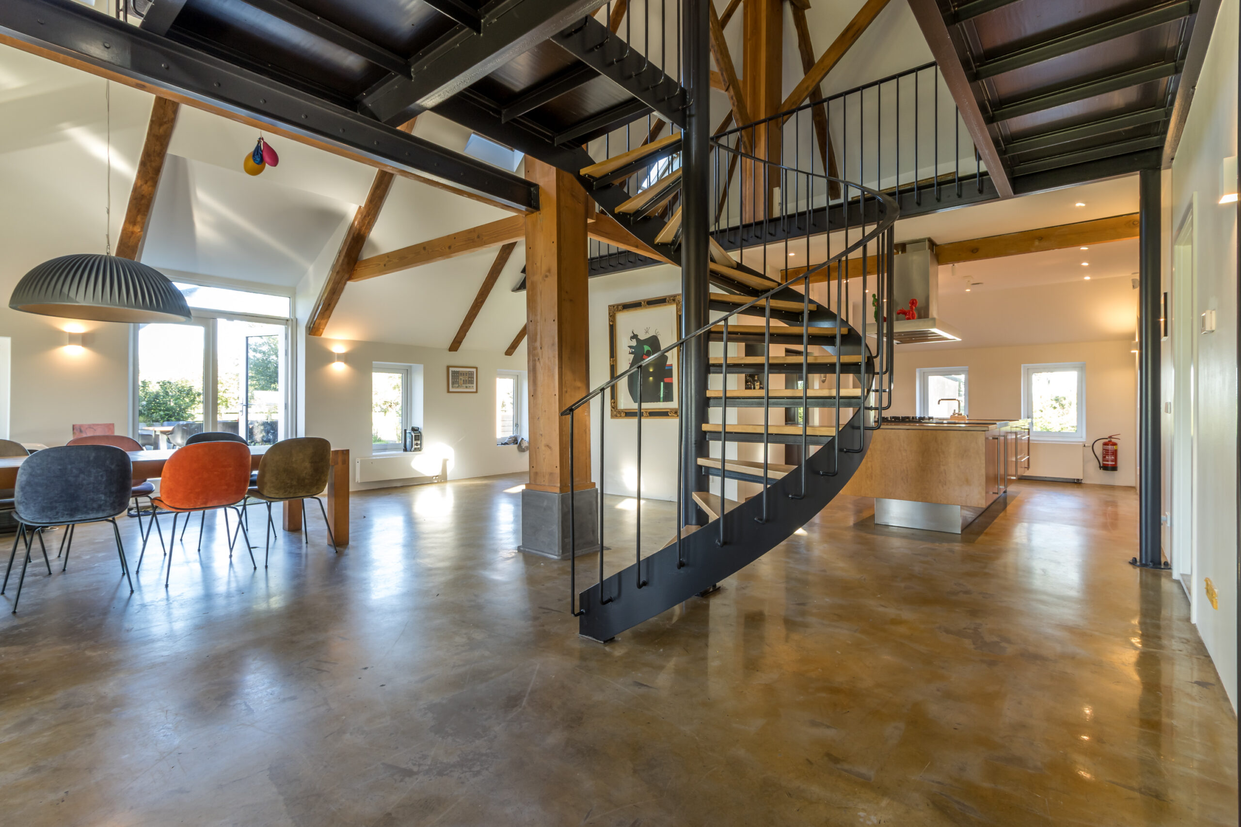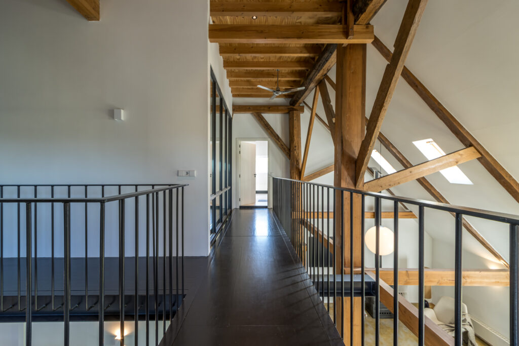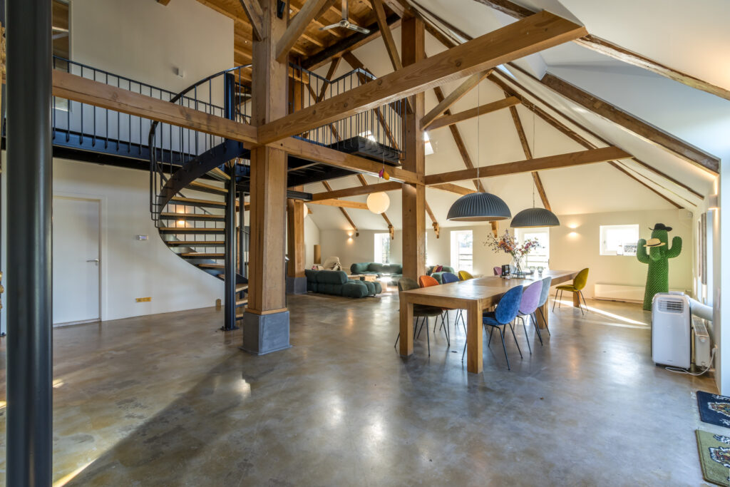 Via een moderne stalen trap bereikt u de verdieping waar de indrukwekkende masterbedroom zich bevindt. Deze royale slaapkamer heeft een eigen badkamer en kijkt via de vide uit over de prachtige leefruimte beneden, wat een bijzonder ruimtelijk effect geeft.