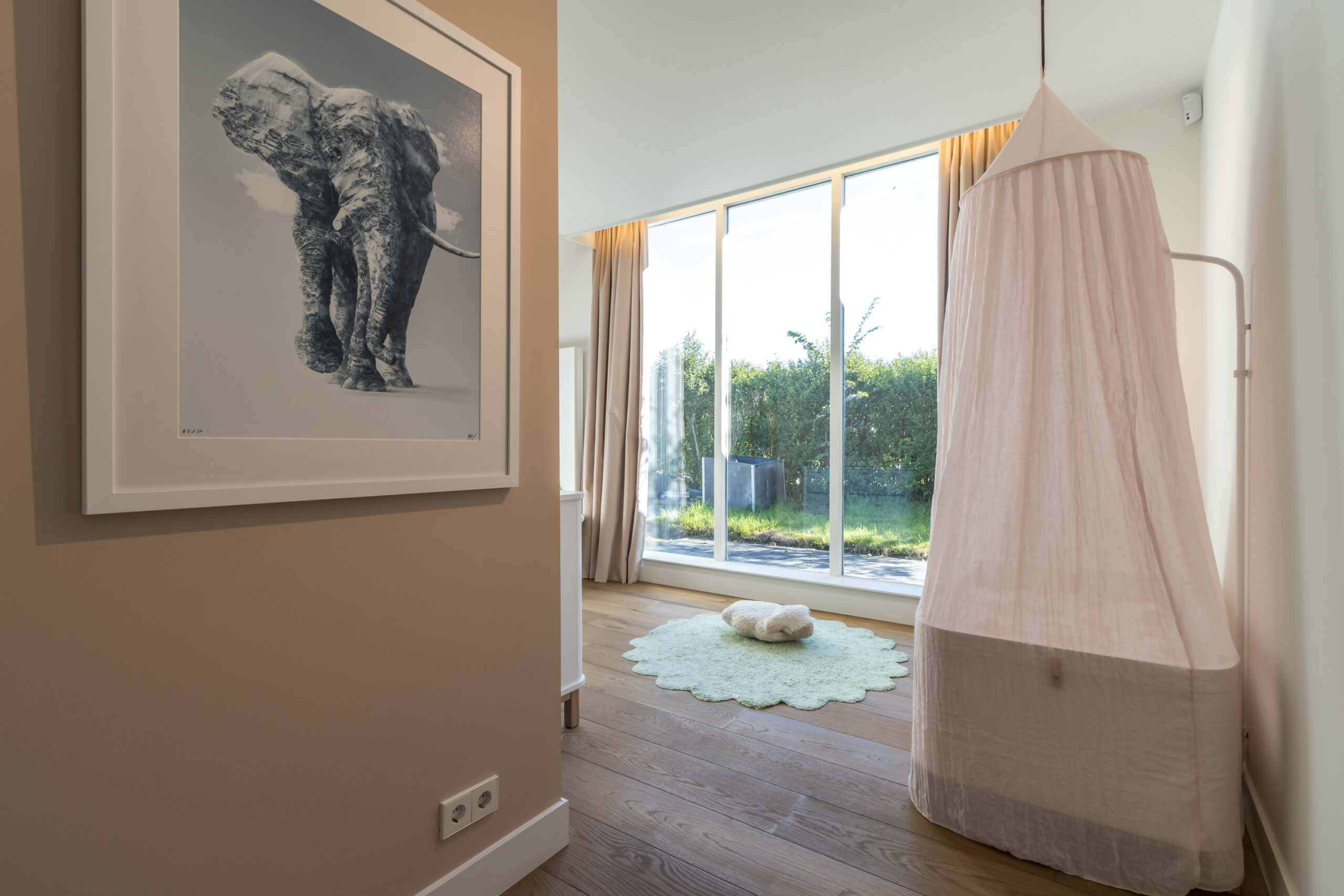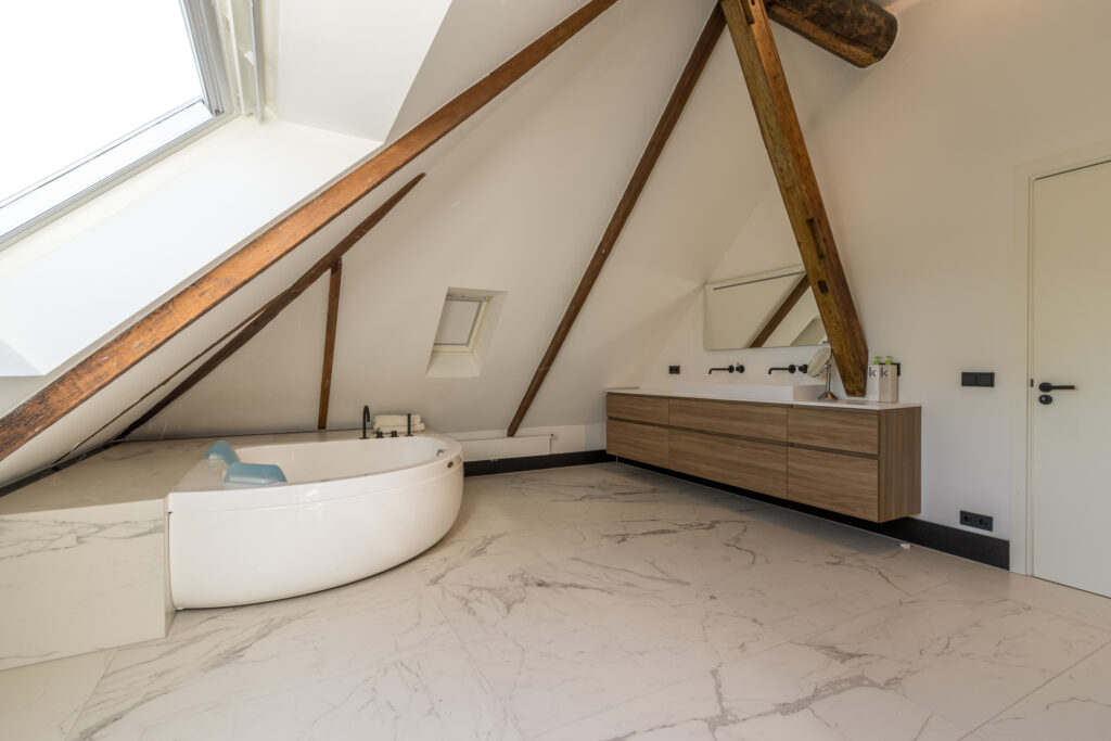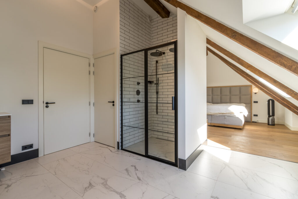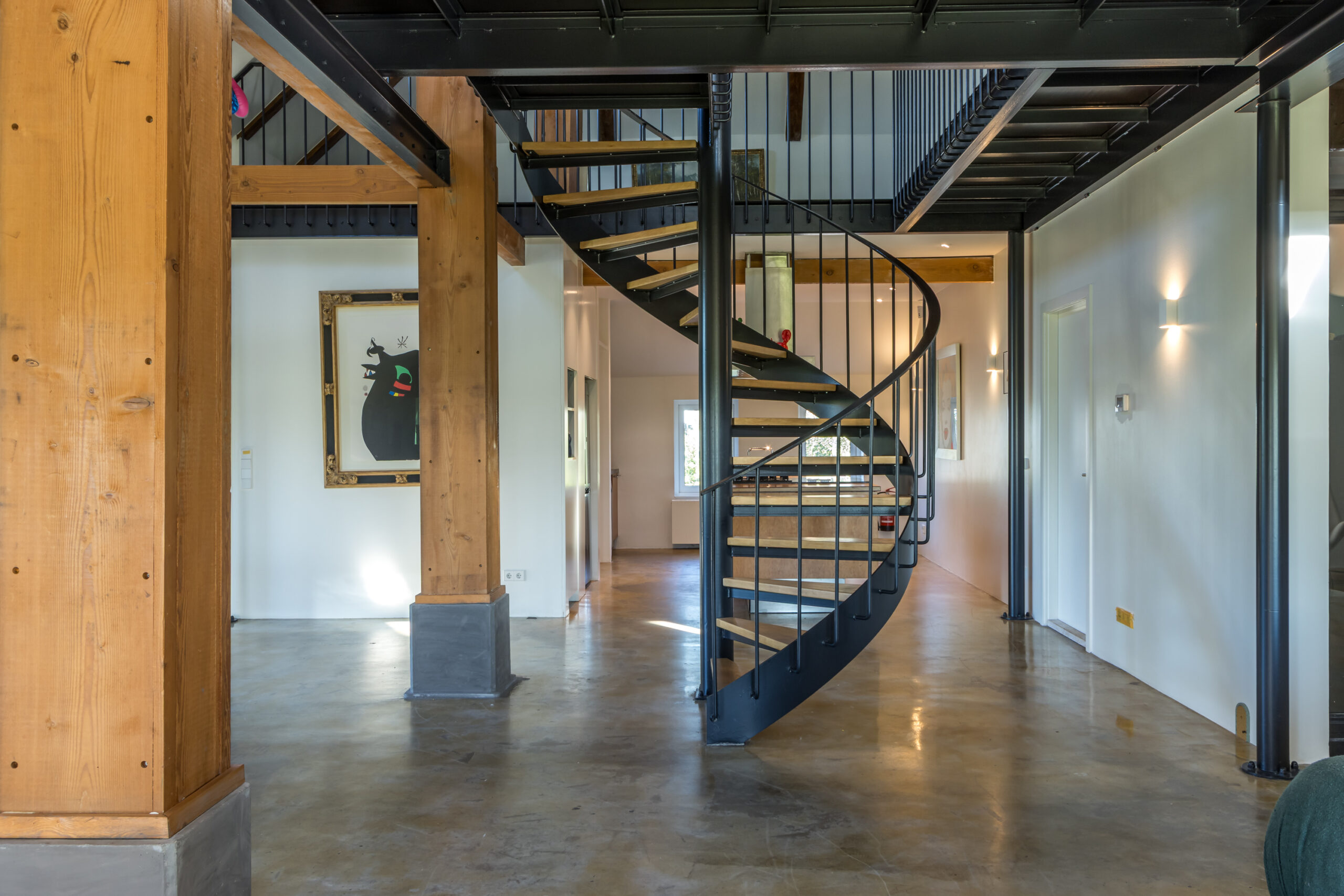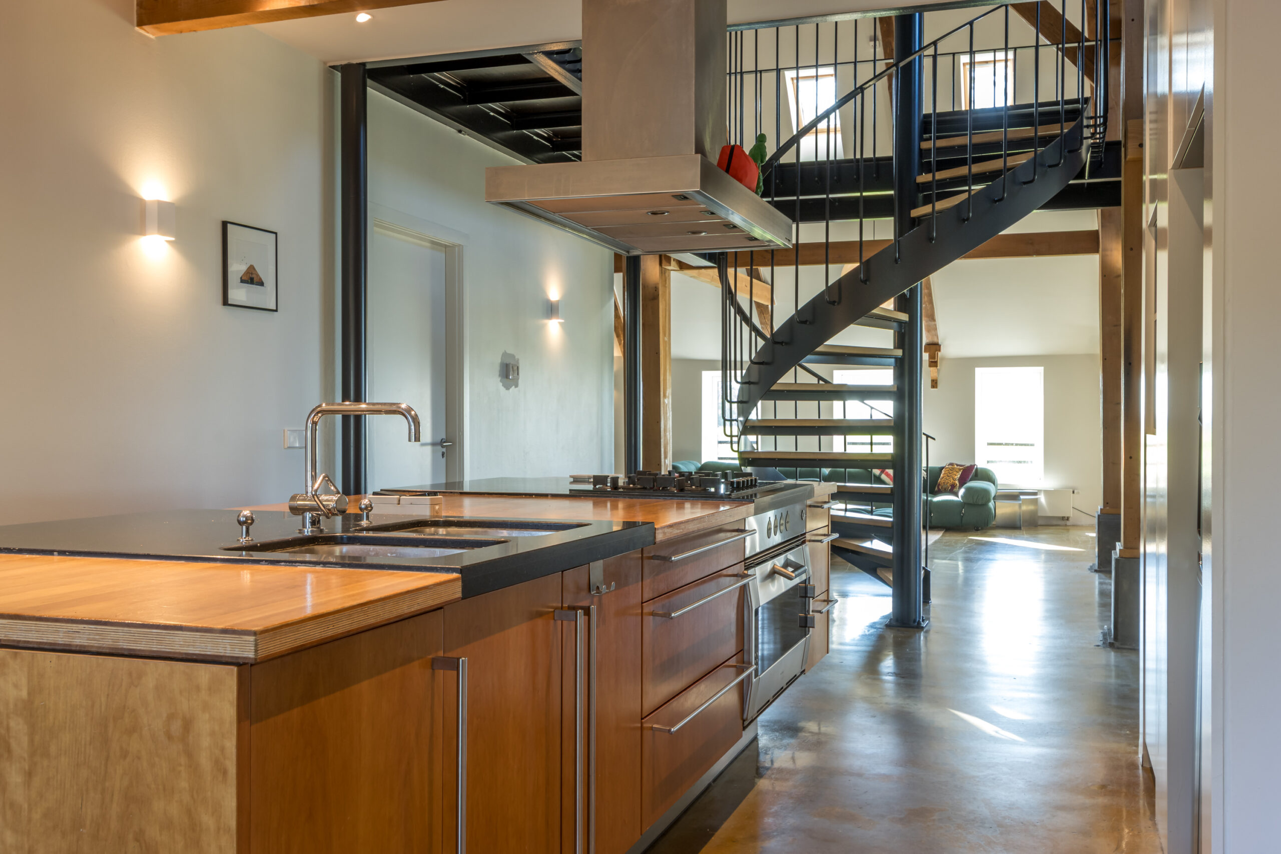 Via een moderne stalen trap bereikt u de verdieping waar de indrukwekkende masterbedroom zich bevindt. Deze royale slaapkamer heeft een eigen badkamer en kijkt via de vide uit over de prachtige leefruimte beneden, wat een bijzonder ruimtelijk effect geeft.
