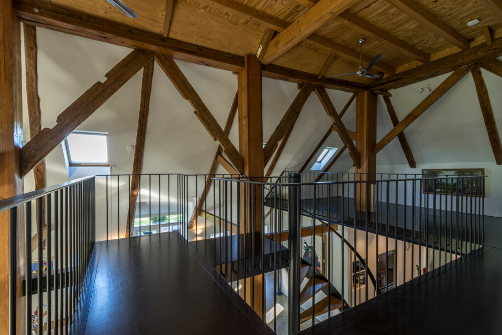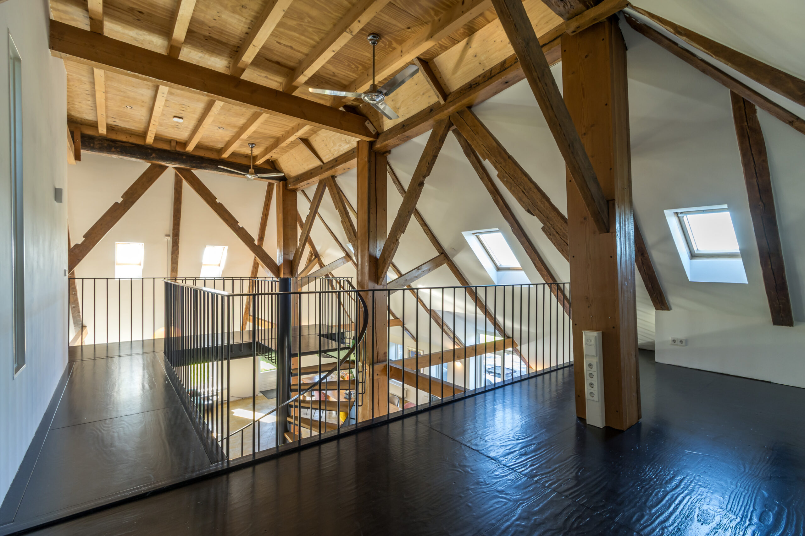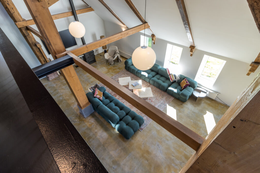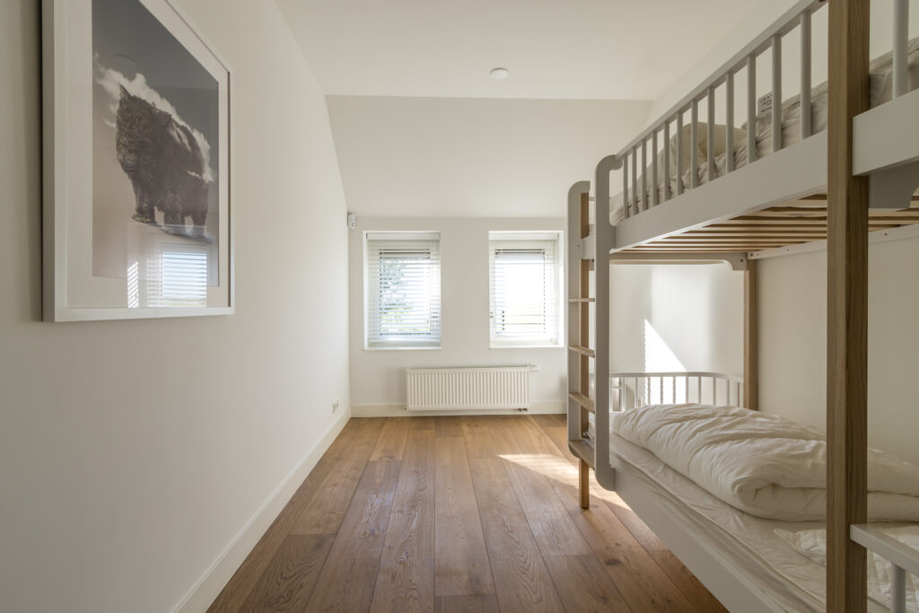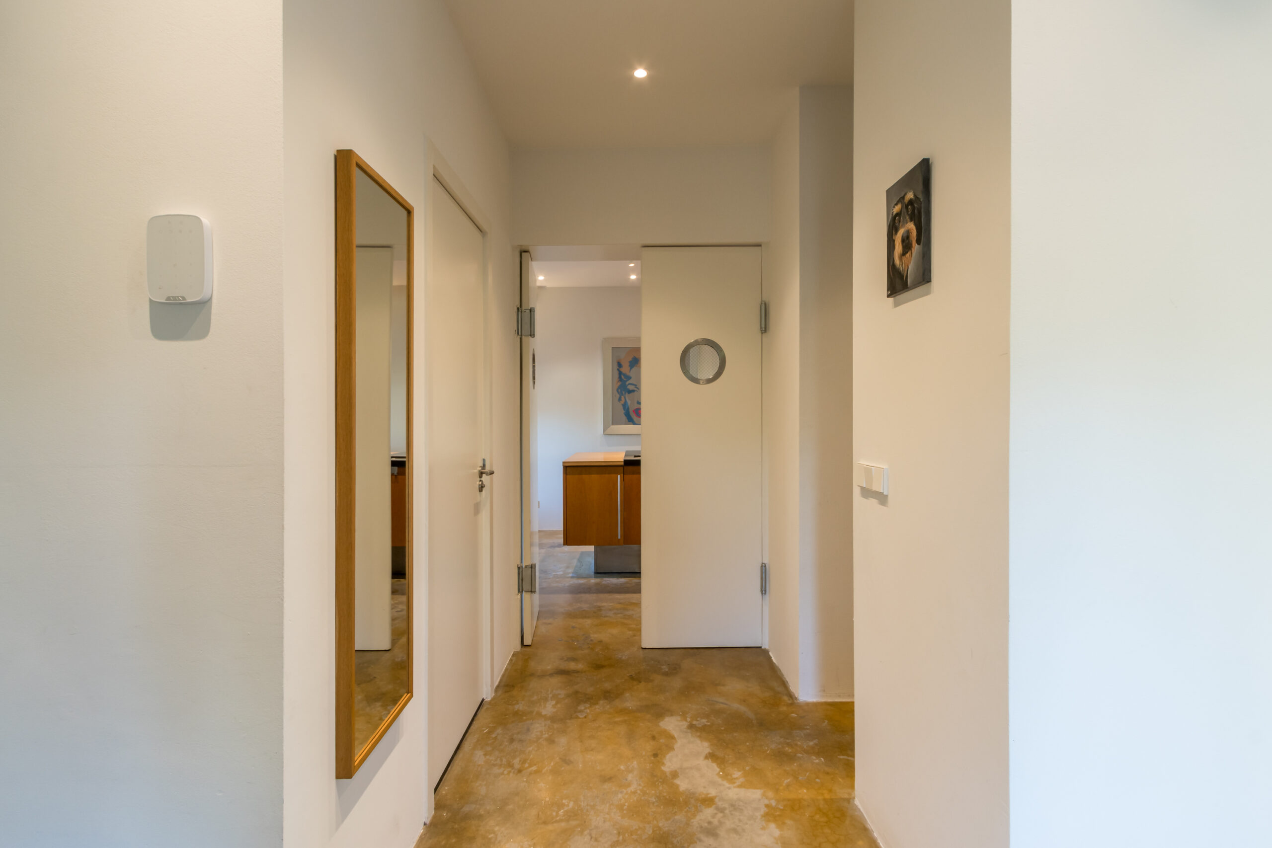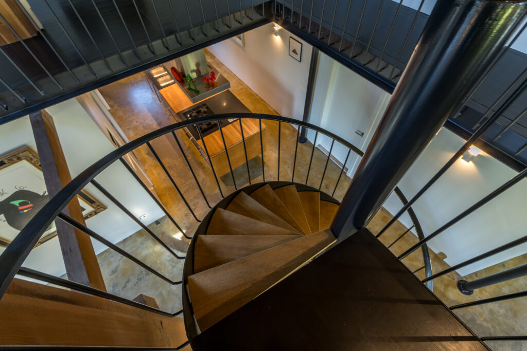 Via een moderne stalen trap bereikt u de verdieping waar de indrukwekkende masterbedroom zich bevindt. Deze royale slaapkamer heeft een eigen badkamer en kijkt via de vide uit over de prachtige leefruimte beneden, wat een bijzonder ruimtelijk effect geeft.