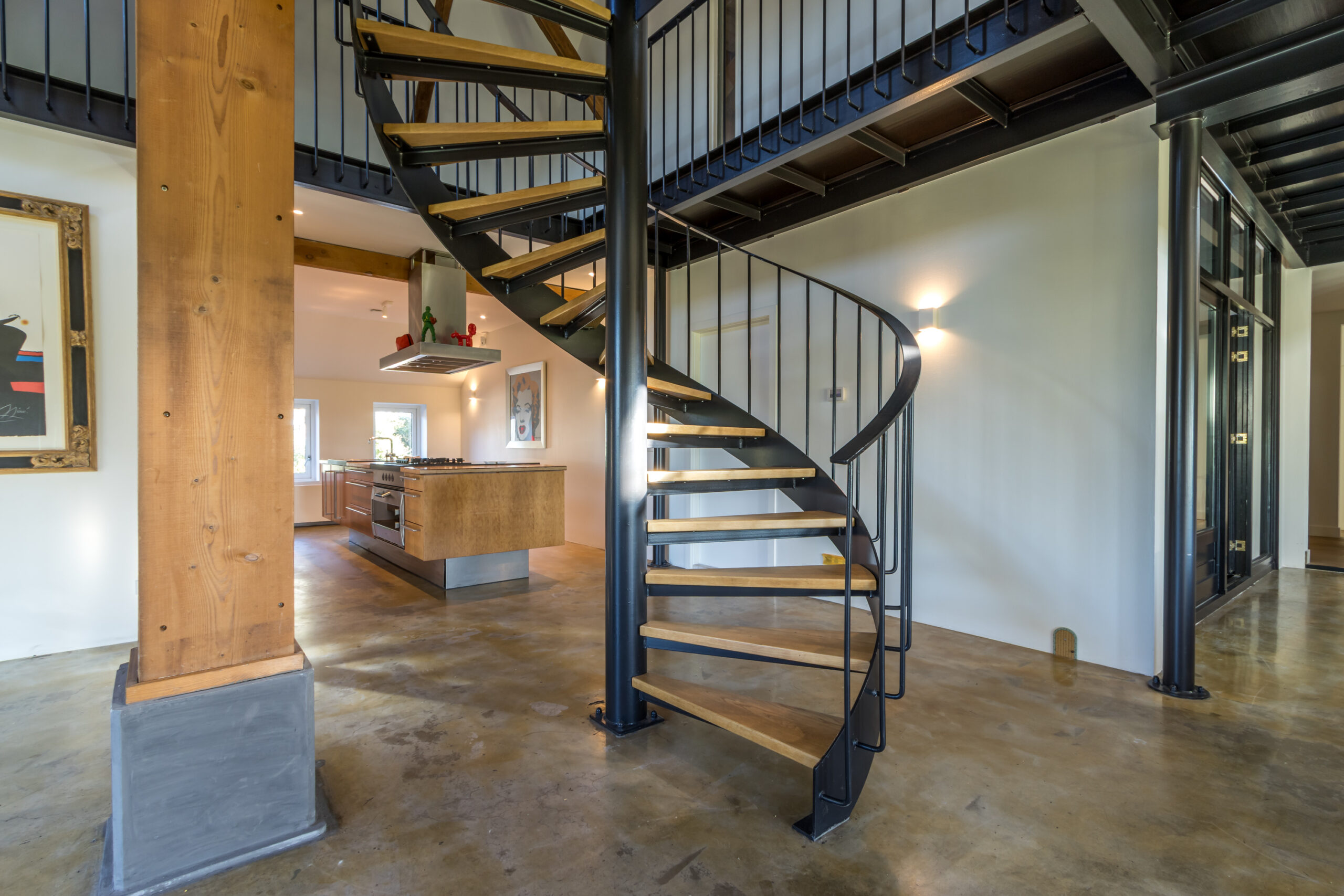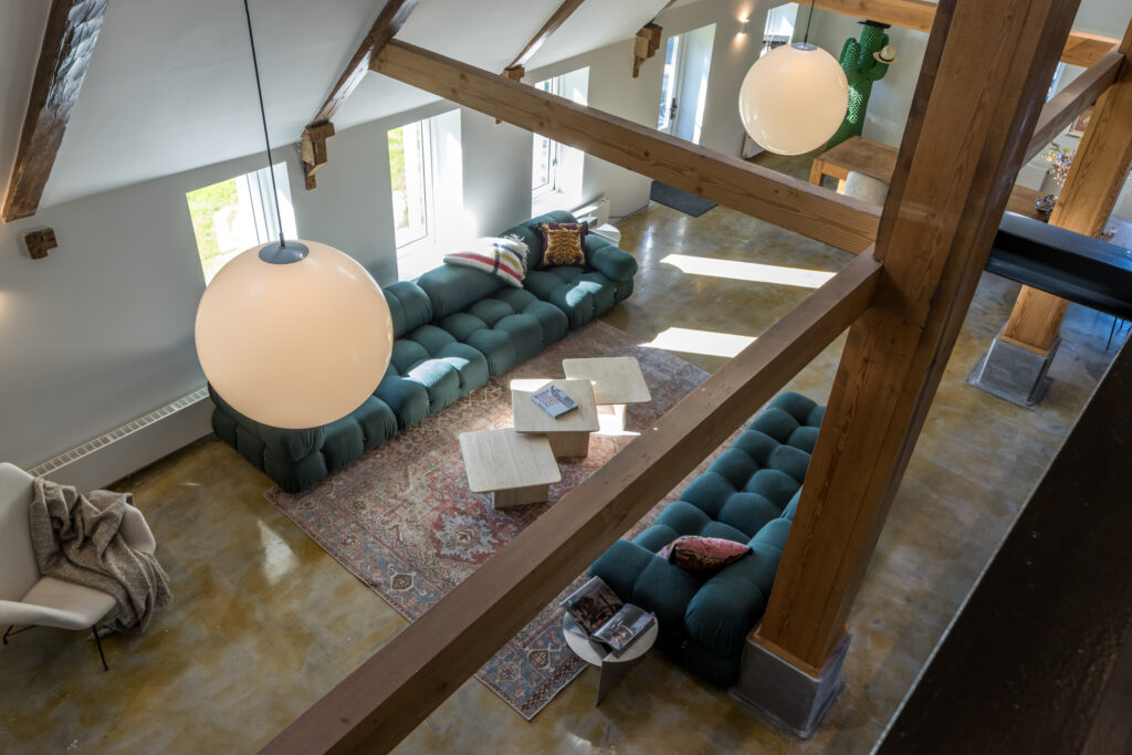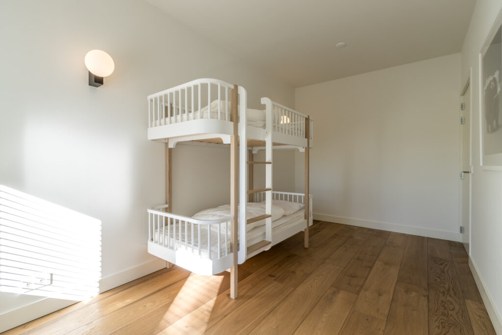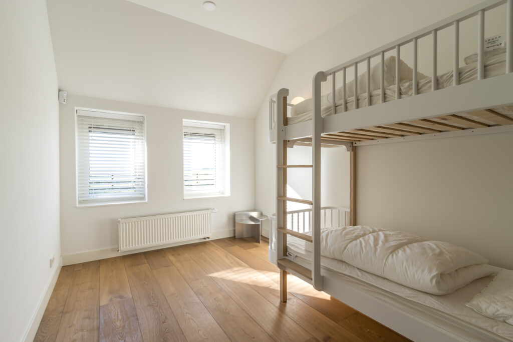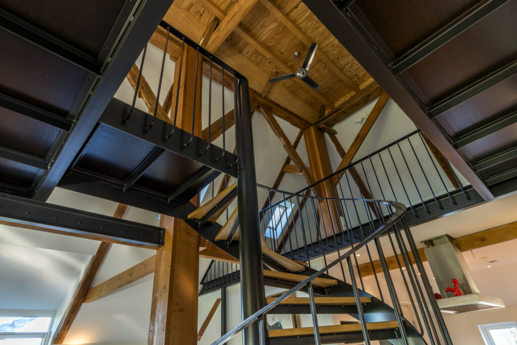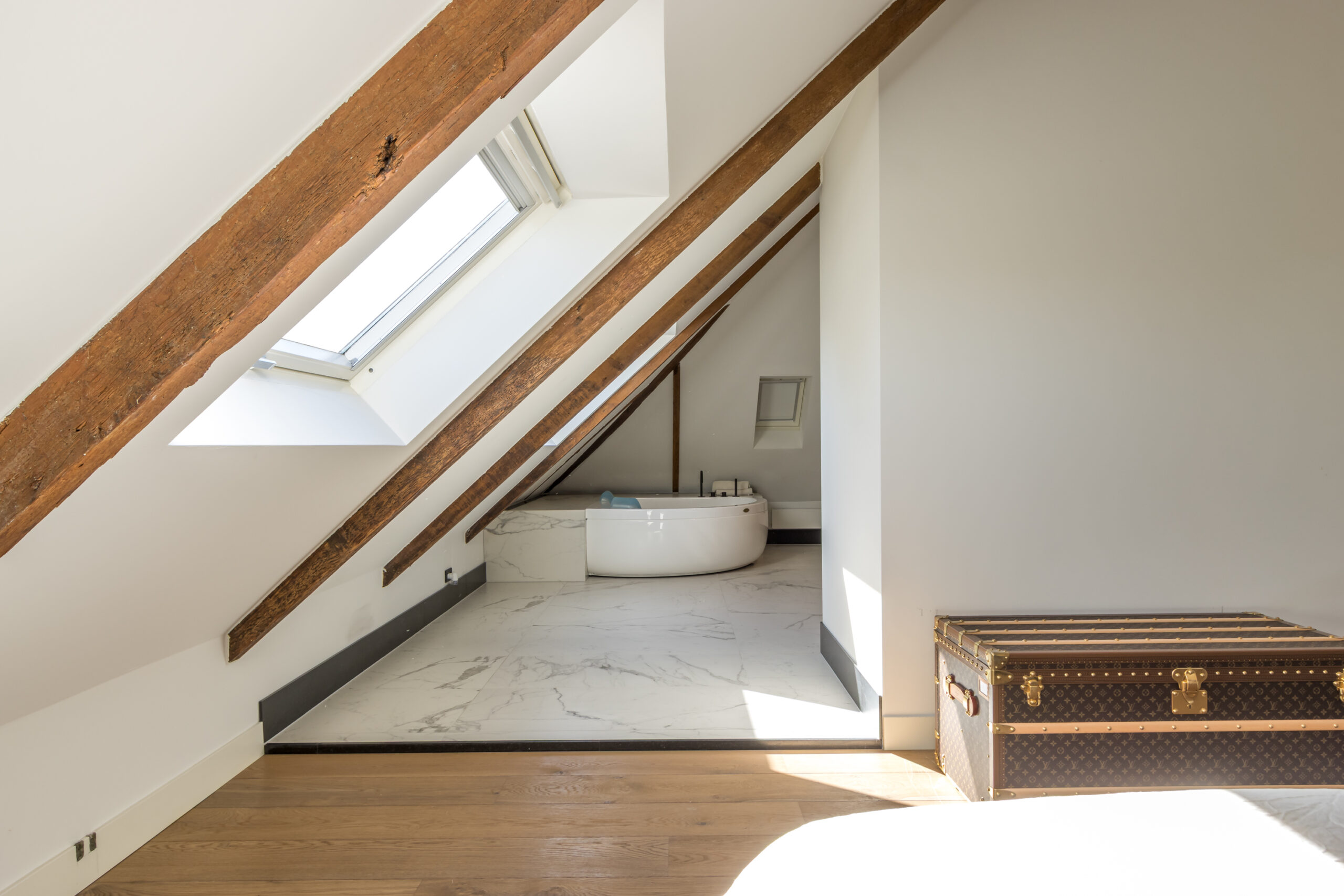 Via een moderne stalen trap bereikt u de verdieping waar de indrukwekkende masterbedroom zich bevindt. Deze royale slaapkamer heeft een eigen badkamer en kijkt via de vide uit over de prachtige leefruimte beneden, wat een bijzonder ruimtelijk effect geeft.
