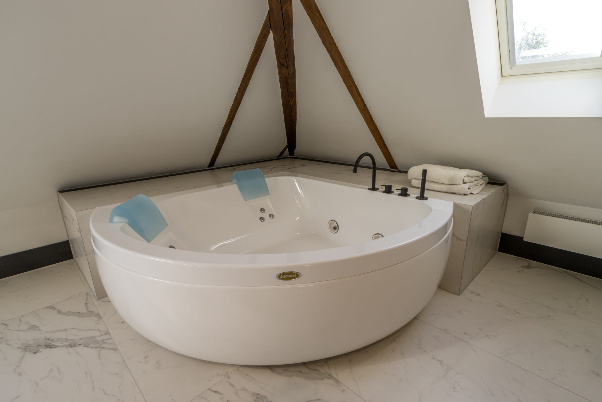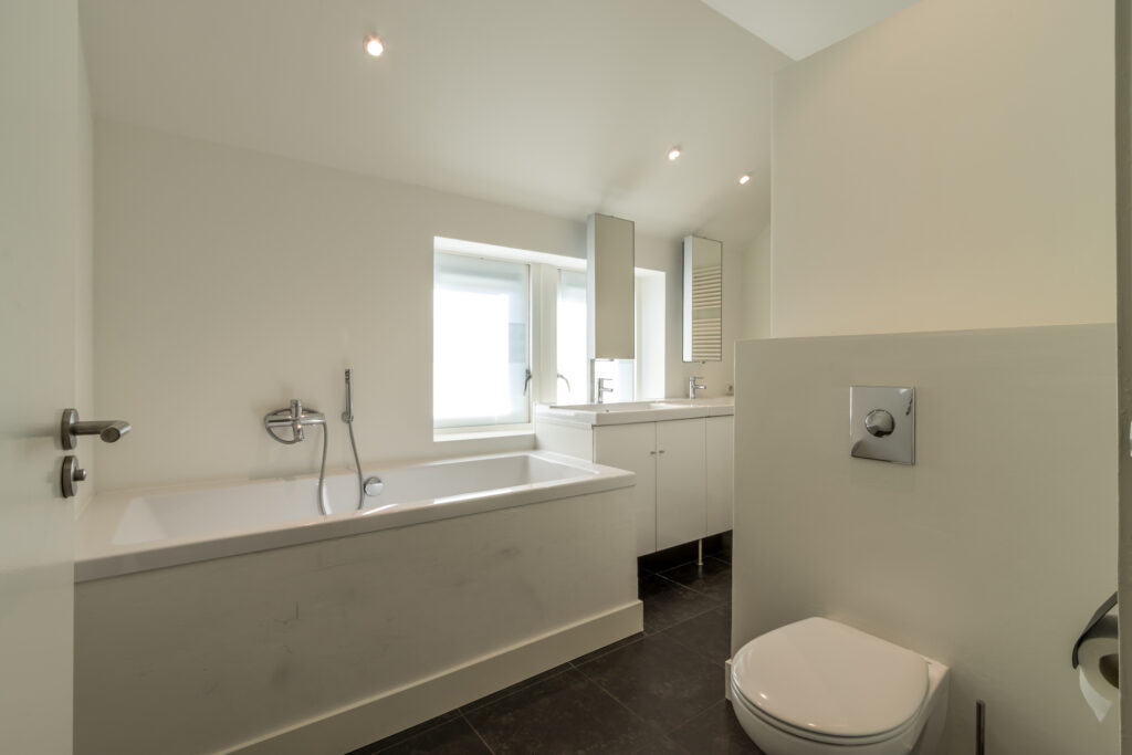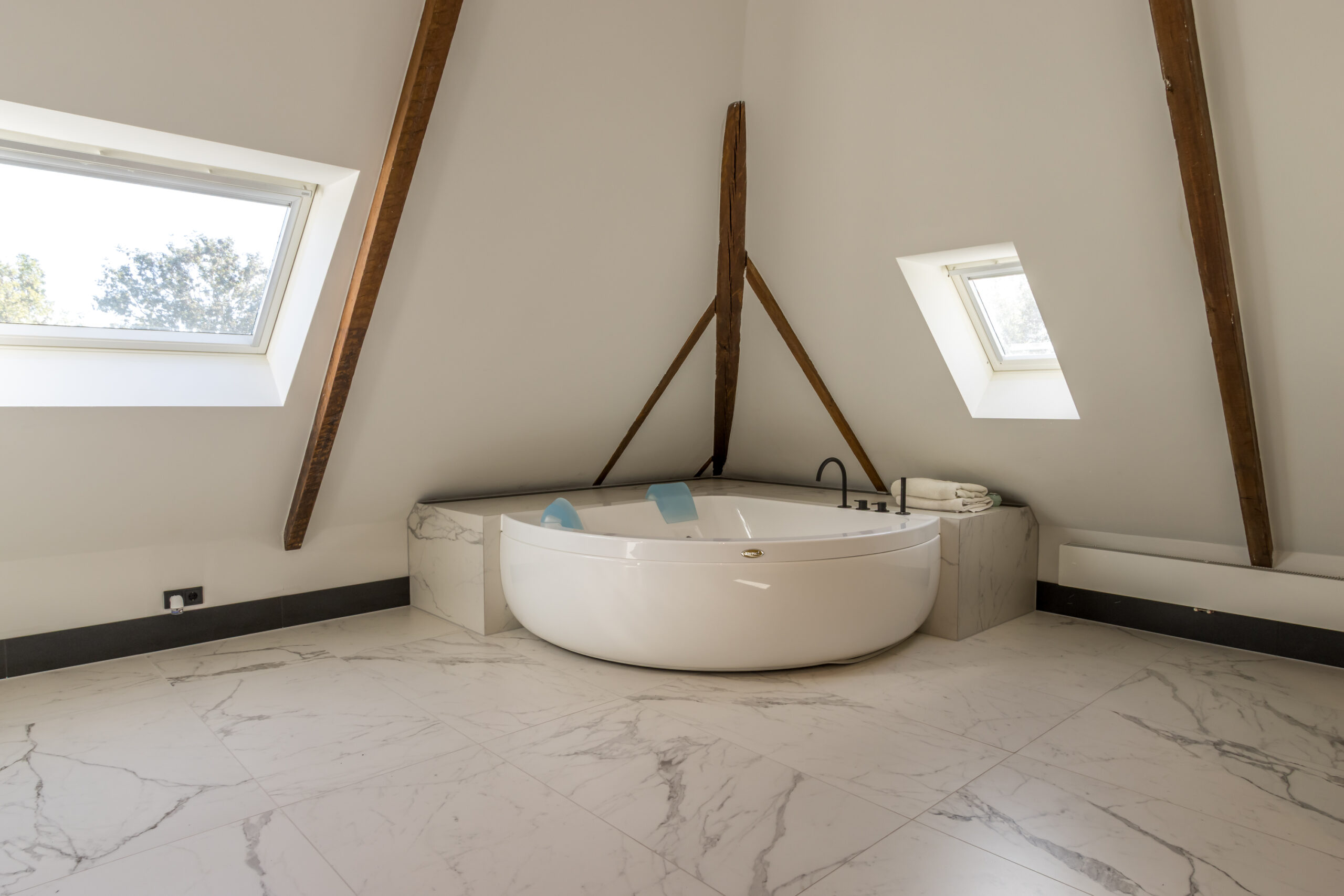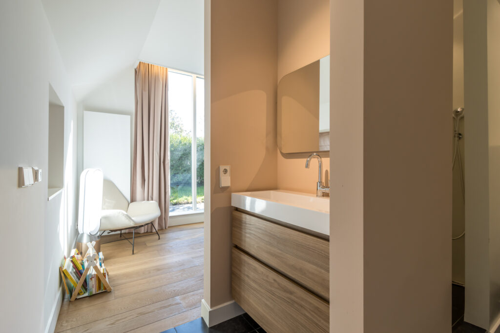 Op dit niveau bevinden zich tevens meerdere comfortabele slaapkamers, waarvan twee met een eigen badkamer, waardoor de woning uitstekend levensloopbestendig is. De badkamers zijn modern en fraai afgewerkt en voorzien van luxe regendouches. Daarnaast zijn er meerdere toiletten en een praktische wasruimte aanwezig. In het hart van de stolp bevindt zich de voormalige stalruimte die tegenwoordig dienstdoet als royale inpandige garage of berging, wat bijdraagt aan het unieke karakter van de woning.