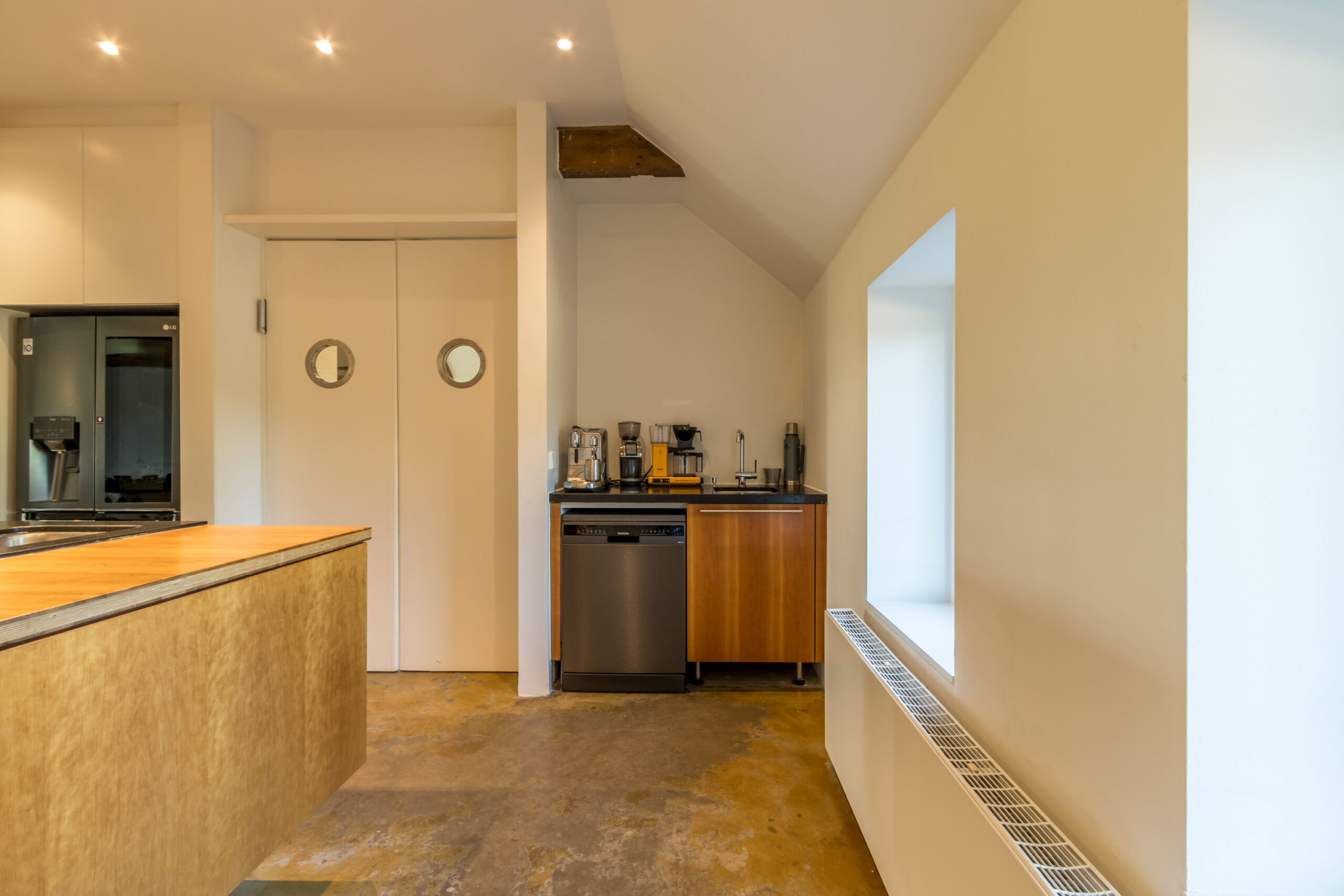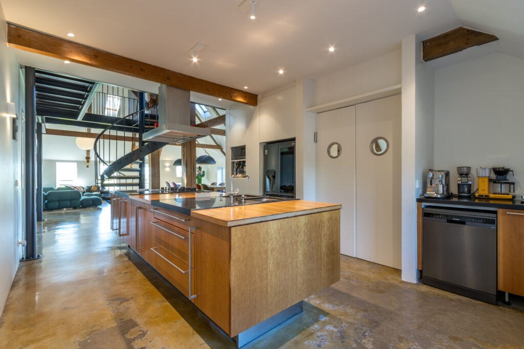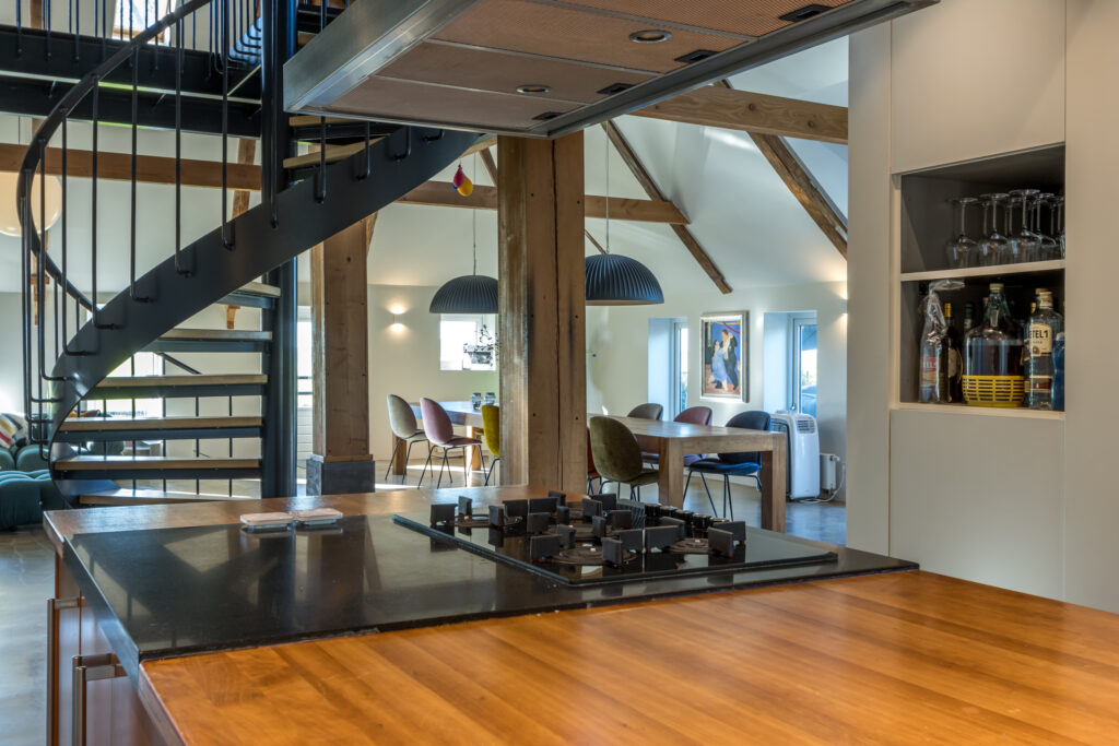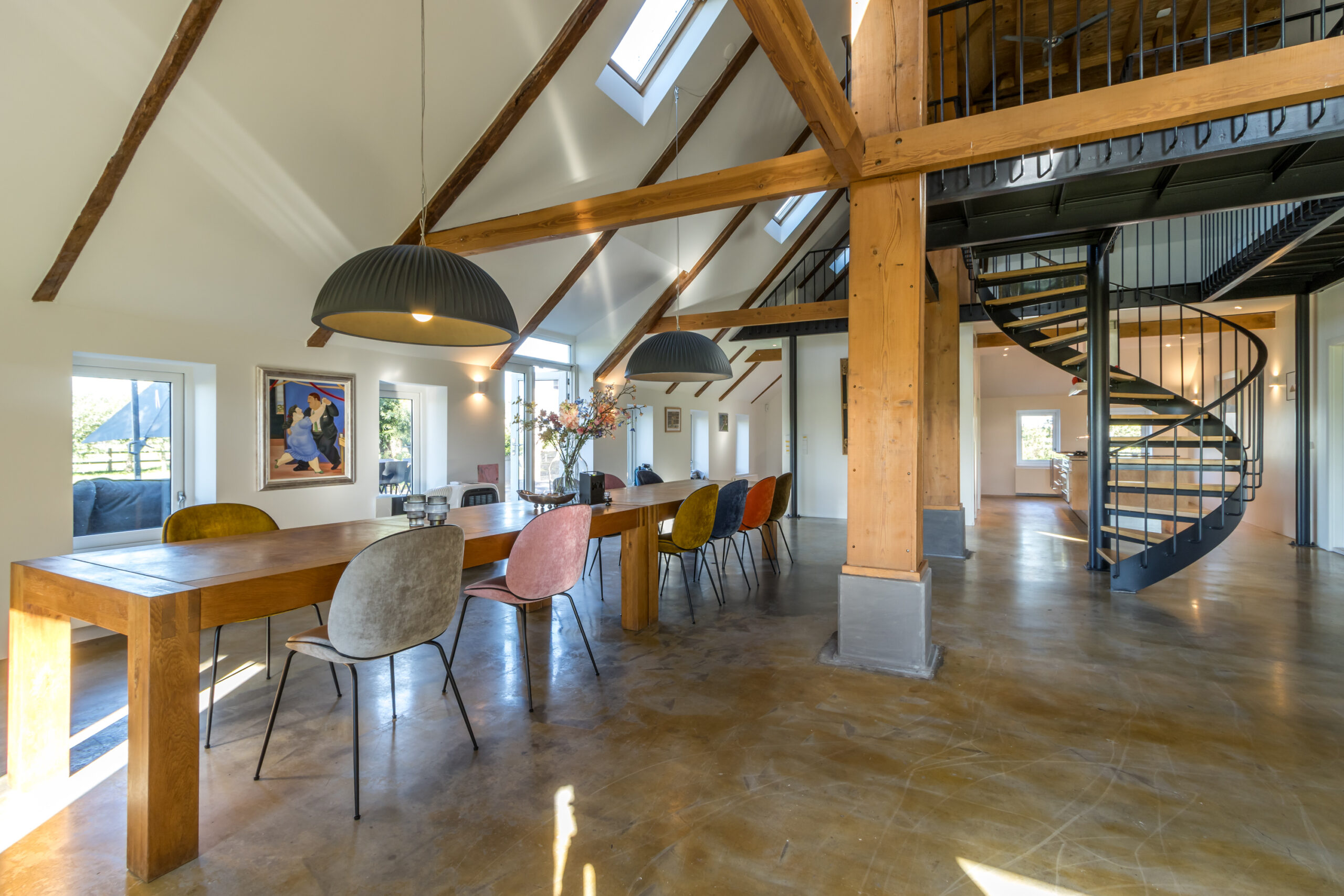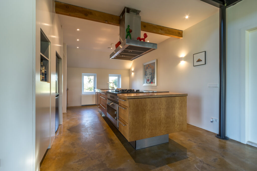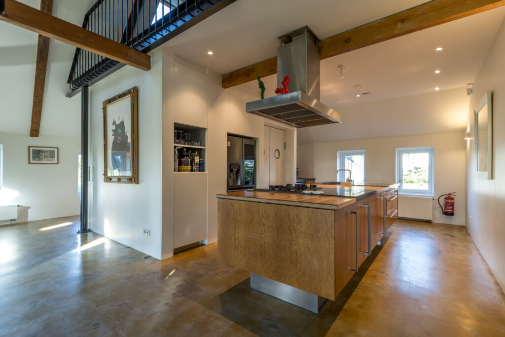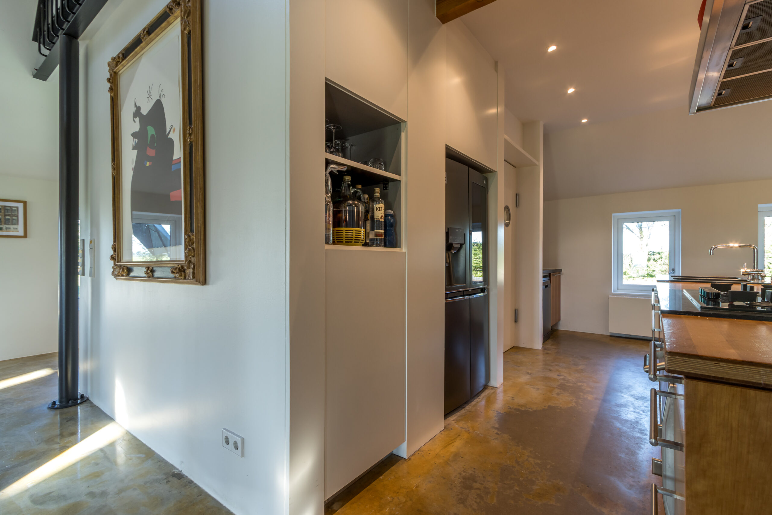 Binnen wordt u verwelkomd in een riante leefruimte waar licht, ruimte en karakter samenkomen. Grote raampartijen rondom zorgen voor een prachtige verbinding met het omliggende landschap en bieden vrij uitzicht over de weilanden tot aan het Noordzeekanaal. De woonkamer straalt warmte en sfeer uit dankzij de nostalgische houten balken, de houtkachel en de robuuste industriële vloer. Vanuit de living loopt de ruimte vloeiend over in de stijlvolle Bulthaup keuken met kookeiland, waar design en functionaliteit perfect samenkomen.
