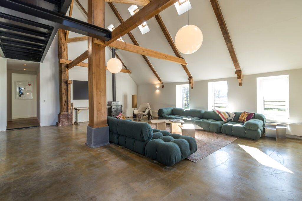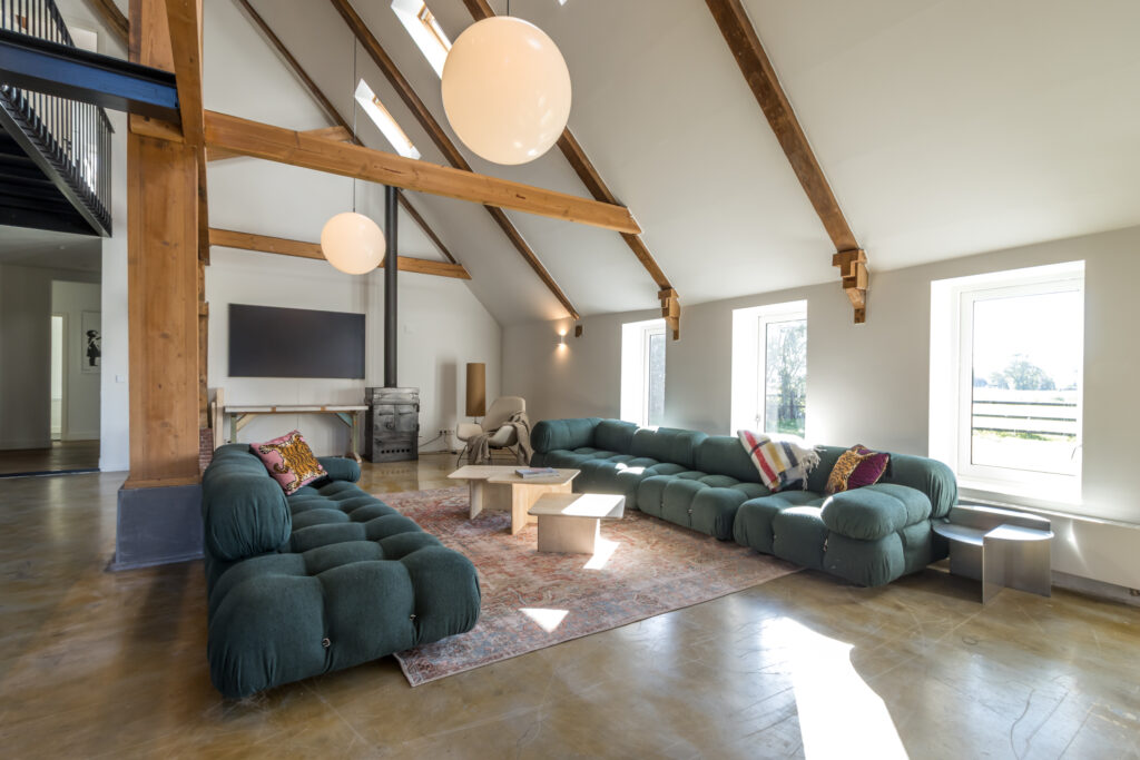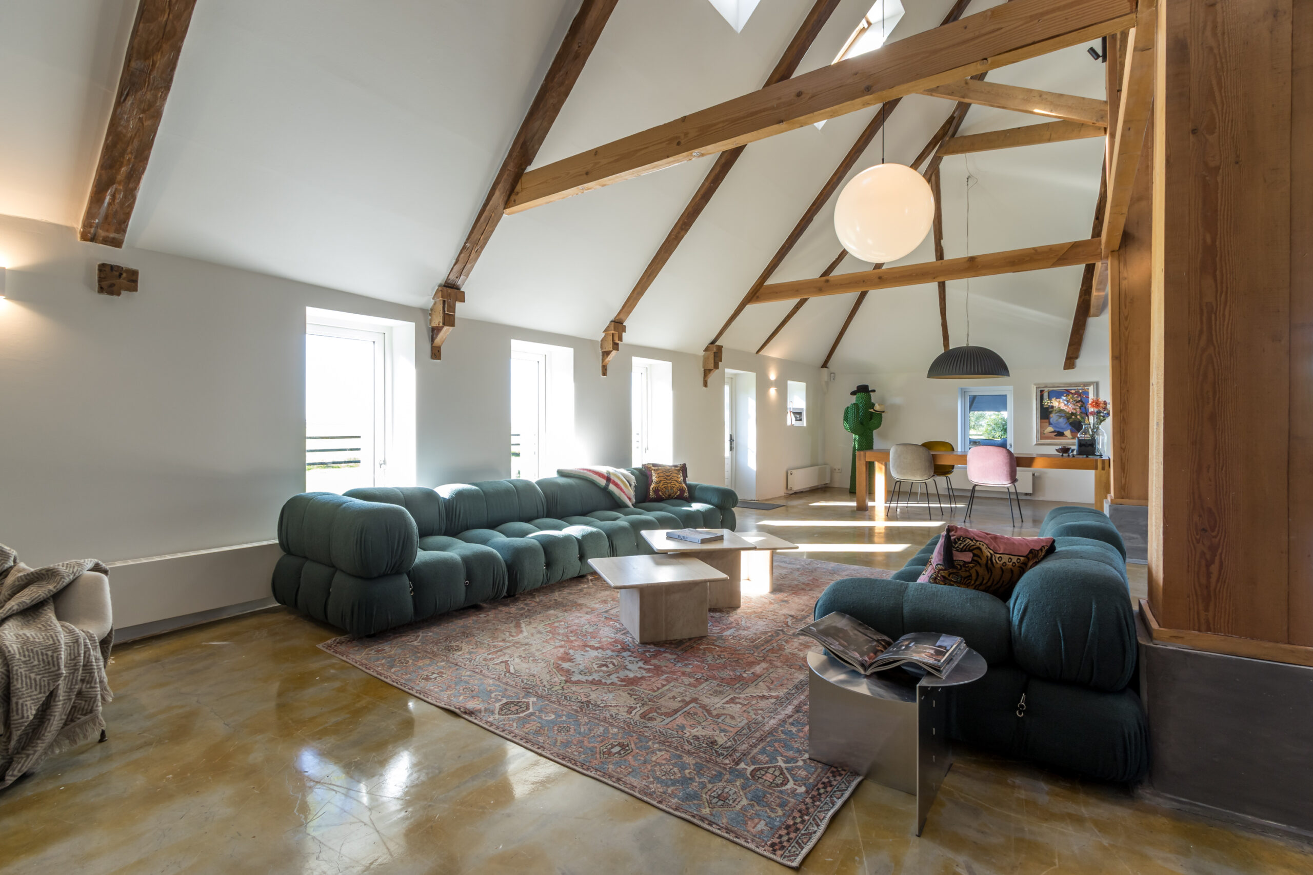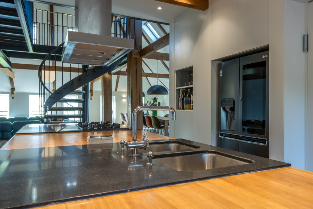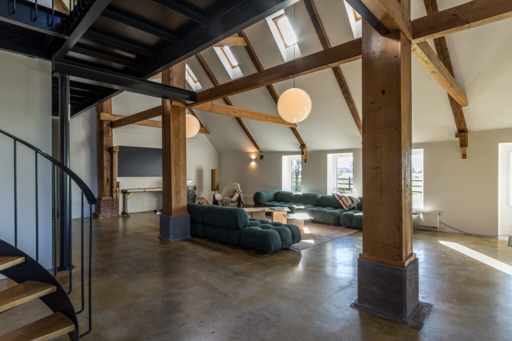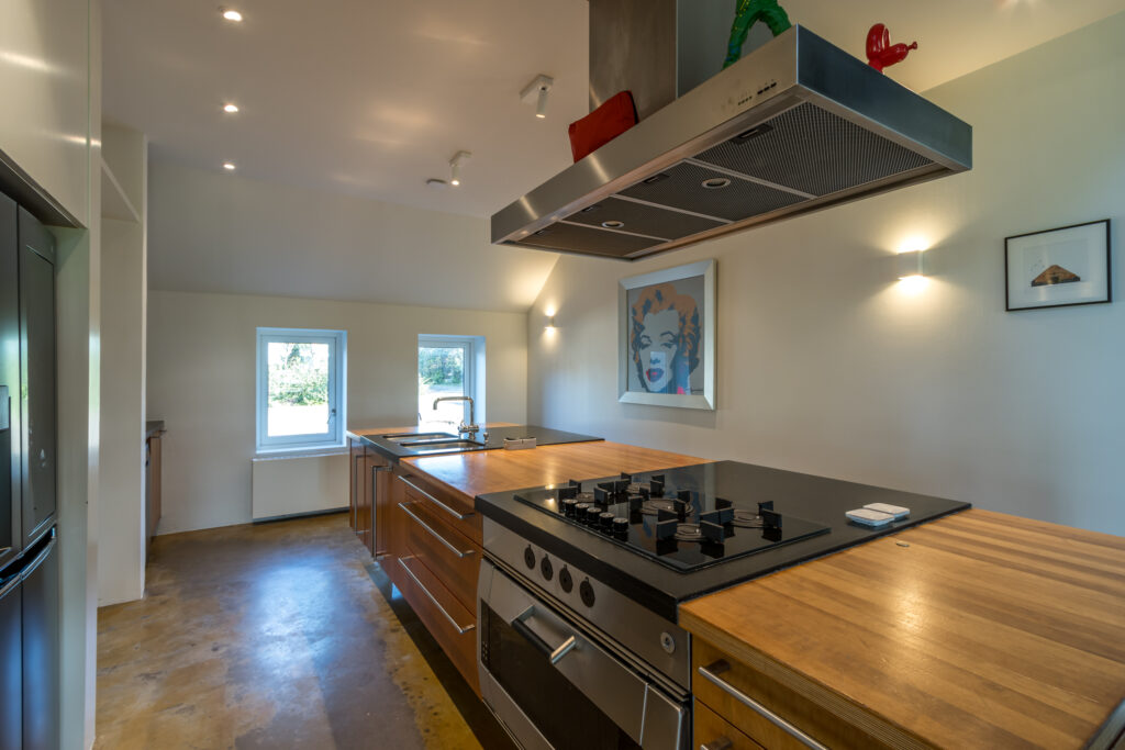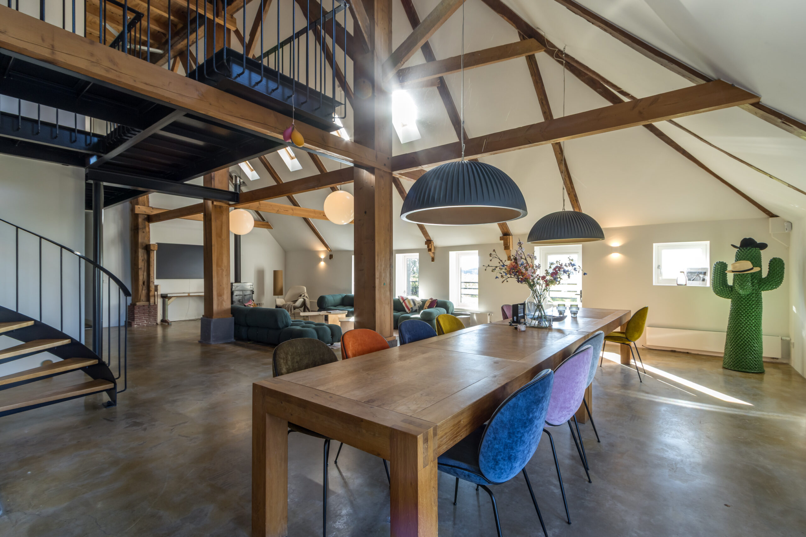 Binnen wordt u verwelkomd in een riante leefruimte waar licht, ruimte en karakter samenkomen. Grote raampartijen rondom zorgen voor een prachtige verbinding met het omliggende landschap en bieden vrij uitzicht over de weilanden tot aan het Noordzeekanaal. De woonkamer straalt warmte en sfeer uit dankzij de nostalgische houten balken, de houtkachel en de robuuste industriële vloer. Vanuit de living loopt de ruimte vloeiend over in de stijlvolle Bulthaup keuken met kookeiland, waar design en functionaliteit perfect samenkomen.
