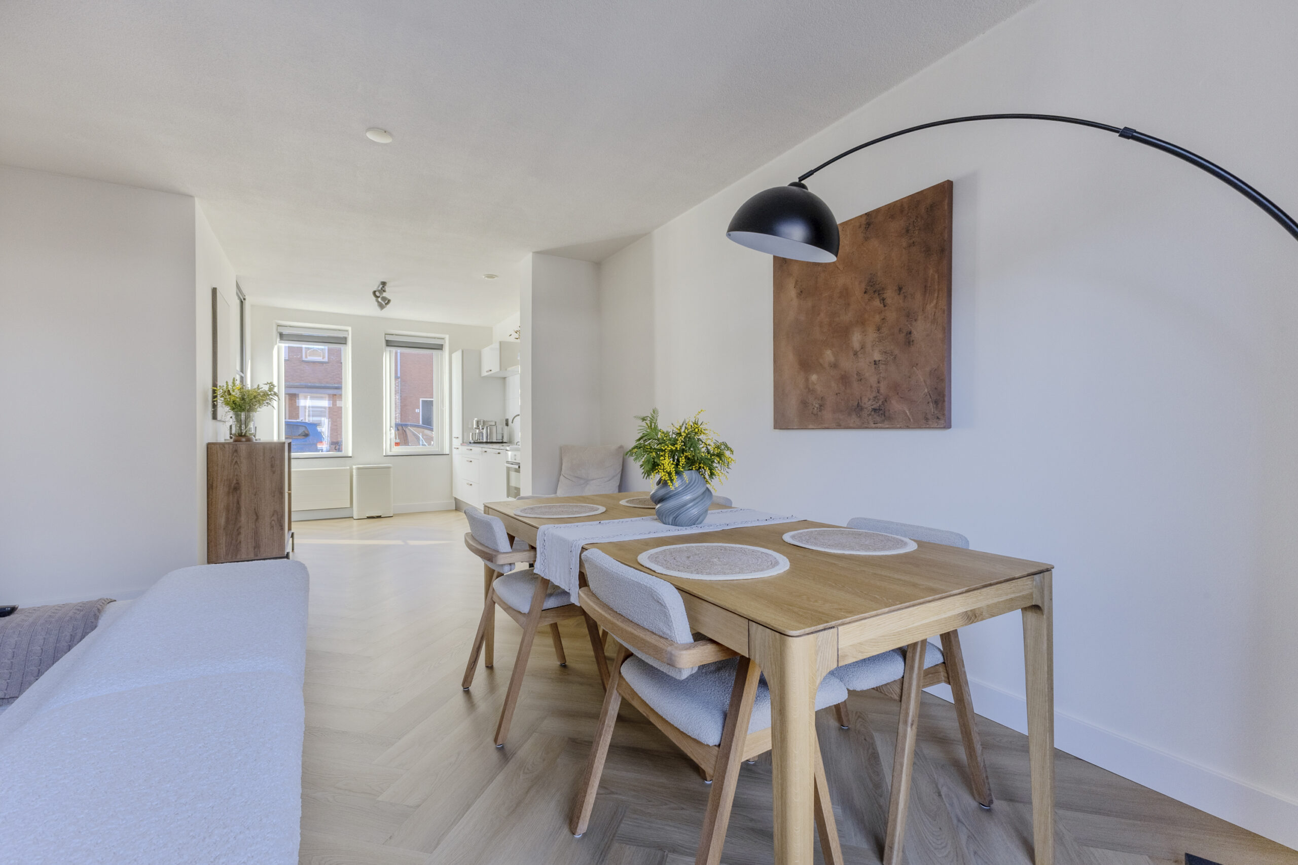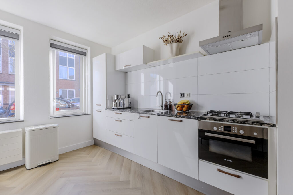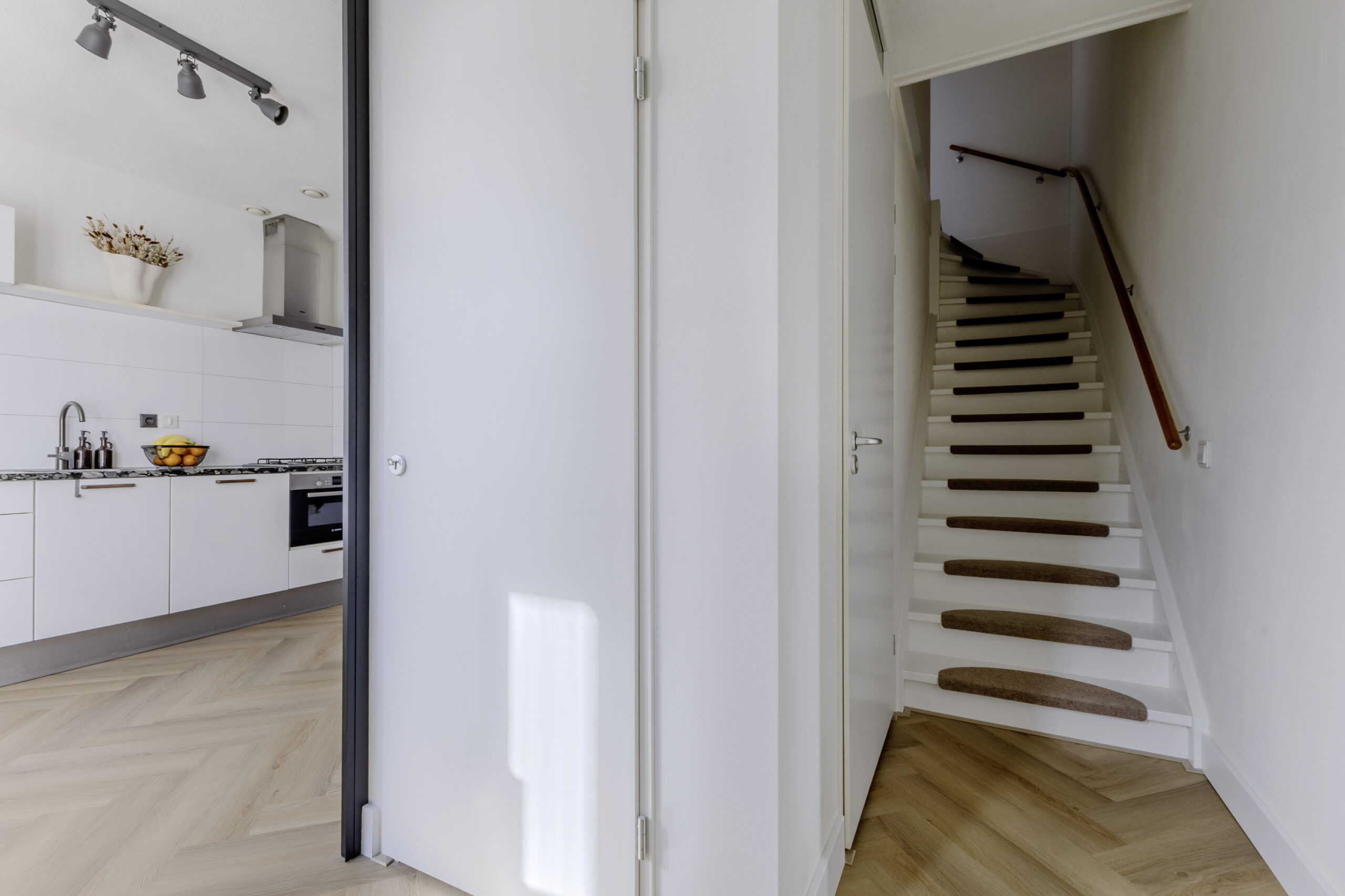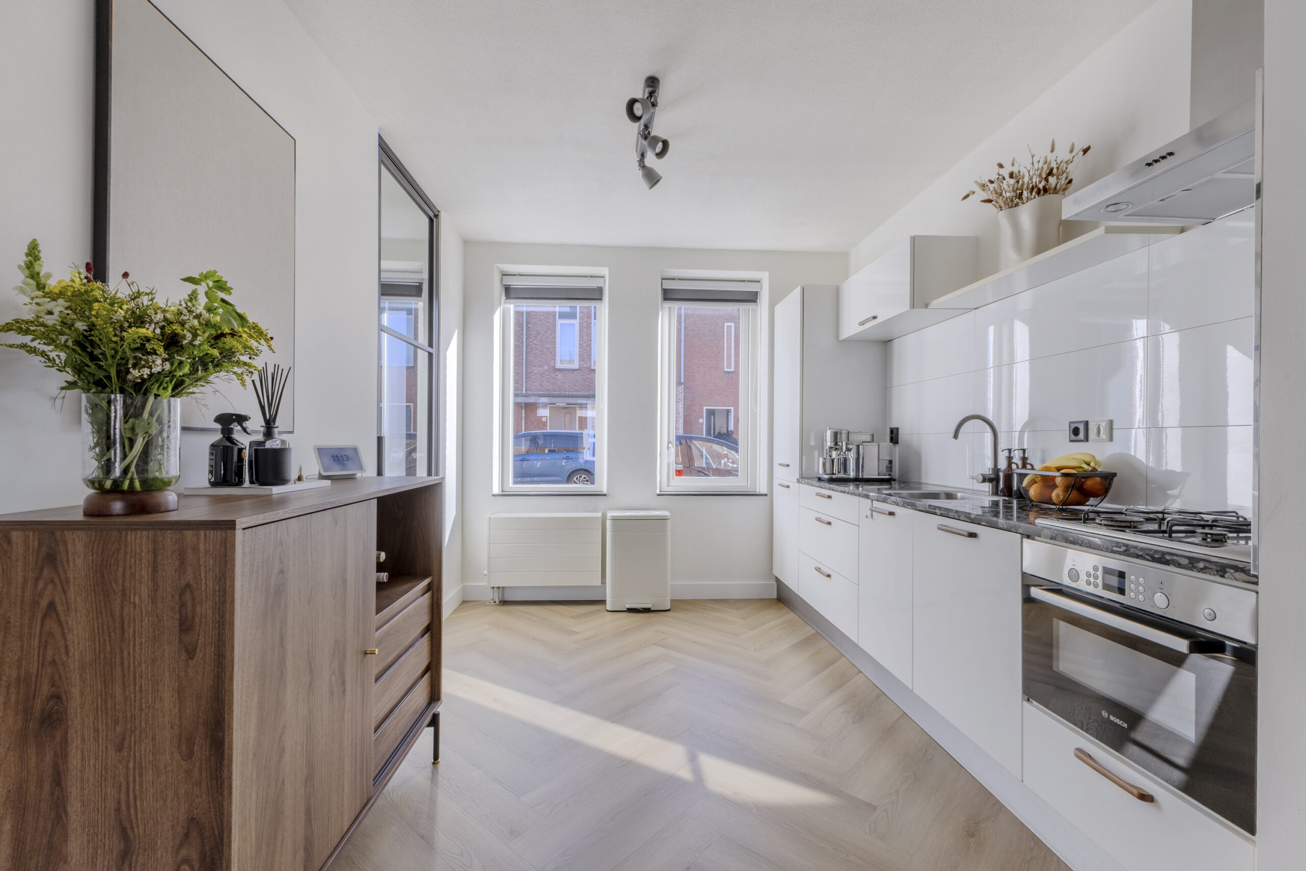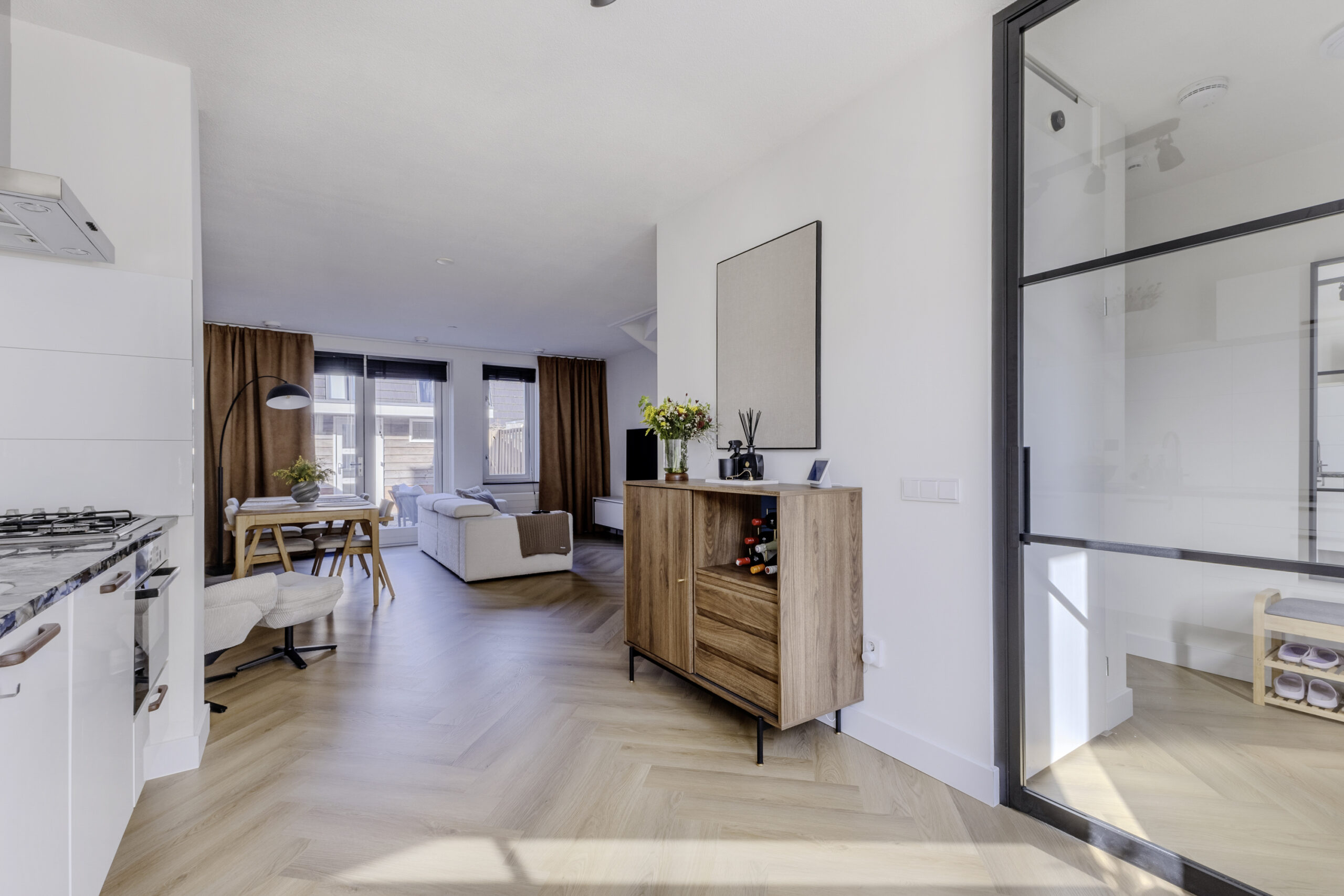 Bij binnenkomst valt direct de verzorgde en sfeervolle uitstraling op. Via de statige tussendeur kom je in de woonkeuken en woonkamer. De begane grond is afgewerkt met een prachtige visgraatvloer, die zorgt voor een warme en luxe uitstraling. De keuken is netjes uitgevoerd en voorzien van diverse inbouwapparatuur, waaronder een vaatwasser, koelkast, vriezer en oven. De woonkamer is ruim opgezet en heeft een prettige indeling met volop plek voor een comfortabele zithoek en een eettafel. Dankzij de grote ramen en de openslaande deuren naar de tuin valt er veel natuurlijk licht naar binnen, waardoor een fijne en open verbinding ontstaat tussen binnen en buiten.