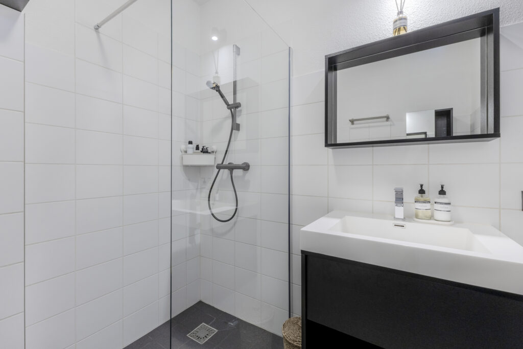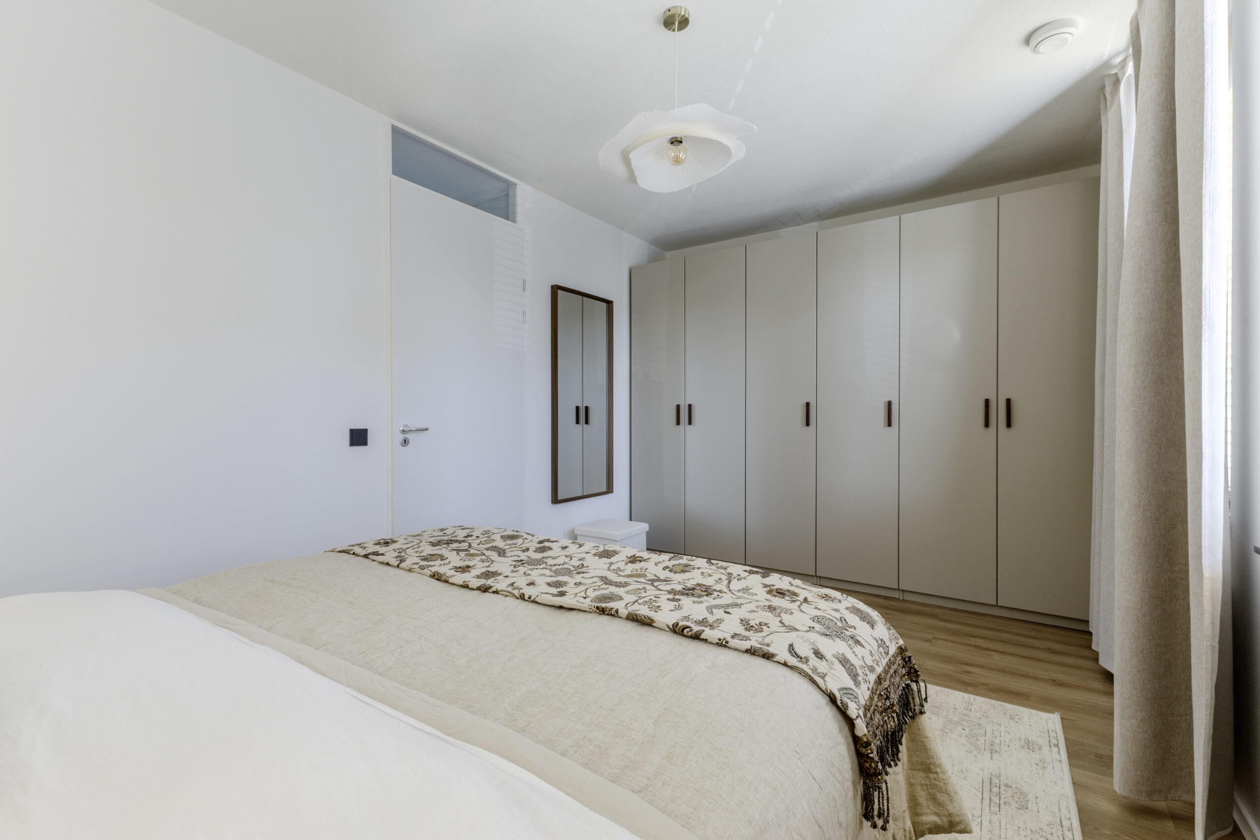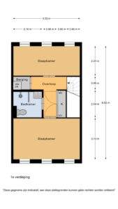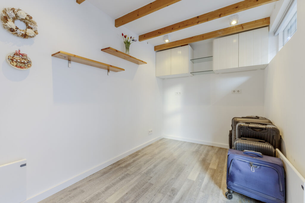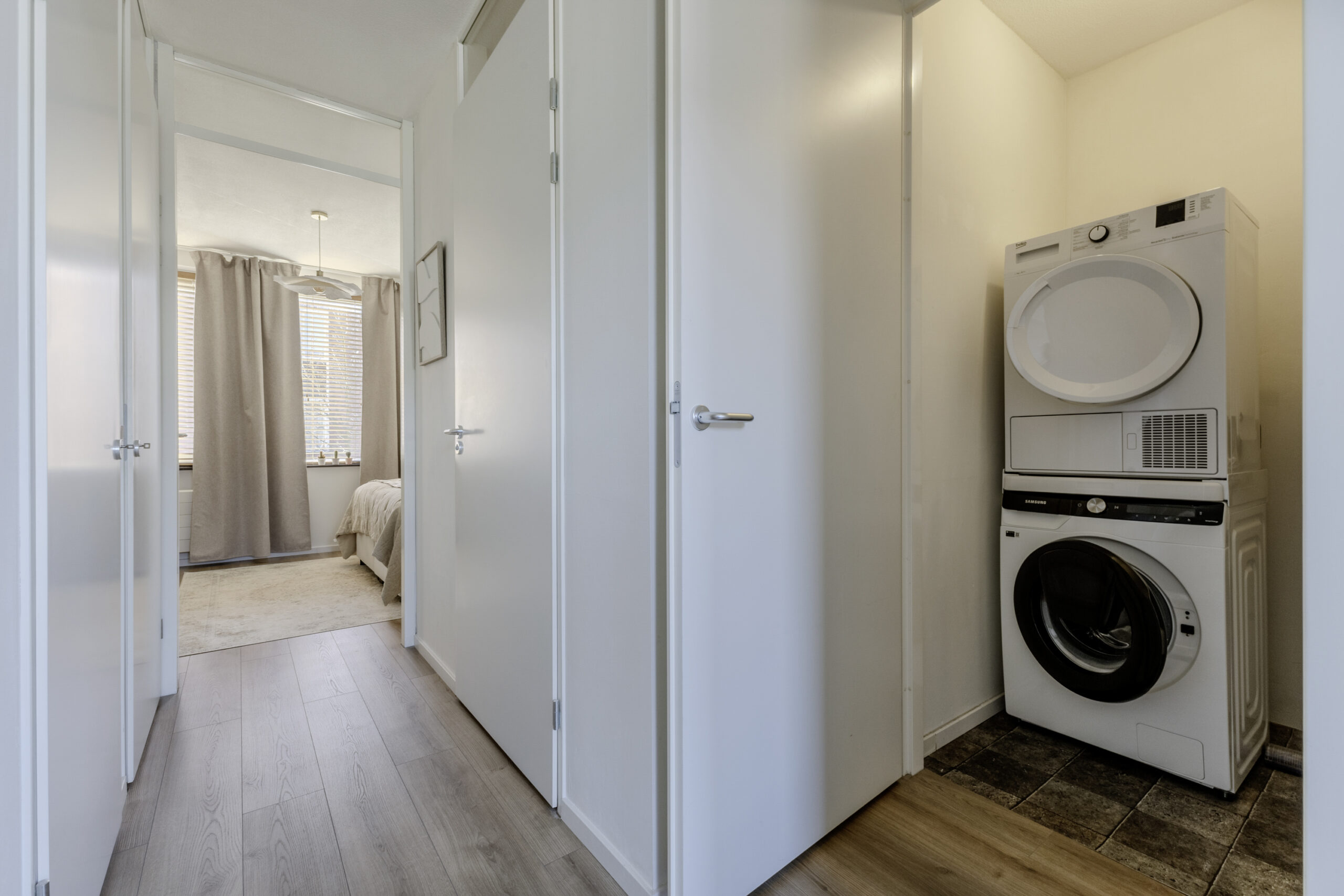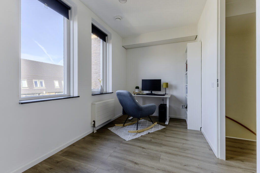 Op de verdieping bevinden zich twee ruime slaapkamers. Beide kamers zijn groot genoeg voor een tweepersoonsbed en bieden daarnaast voldoende ruimte voor kasten. De master bedroom is bijzonder comfortabel van formaat en voelt ruim en rustig aan. Tussen de slaapkamers ligt de badkamer, die is voorzien van een inloopdouche, toilet en wastafel. Daarnaast is er een praktische, separate plek voor de wasmachine en droger. De woning is bovendien uitgerust met een WTW-systeem (warmteterugwinning), wat zorgt voor een prettig en gezond binnenklimaat met continue frisse lucht.