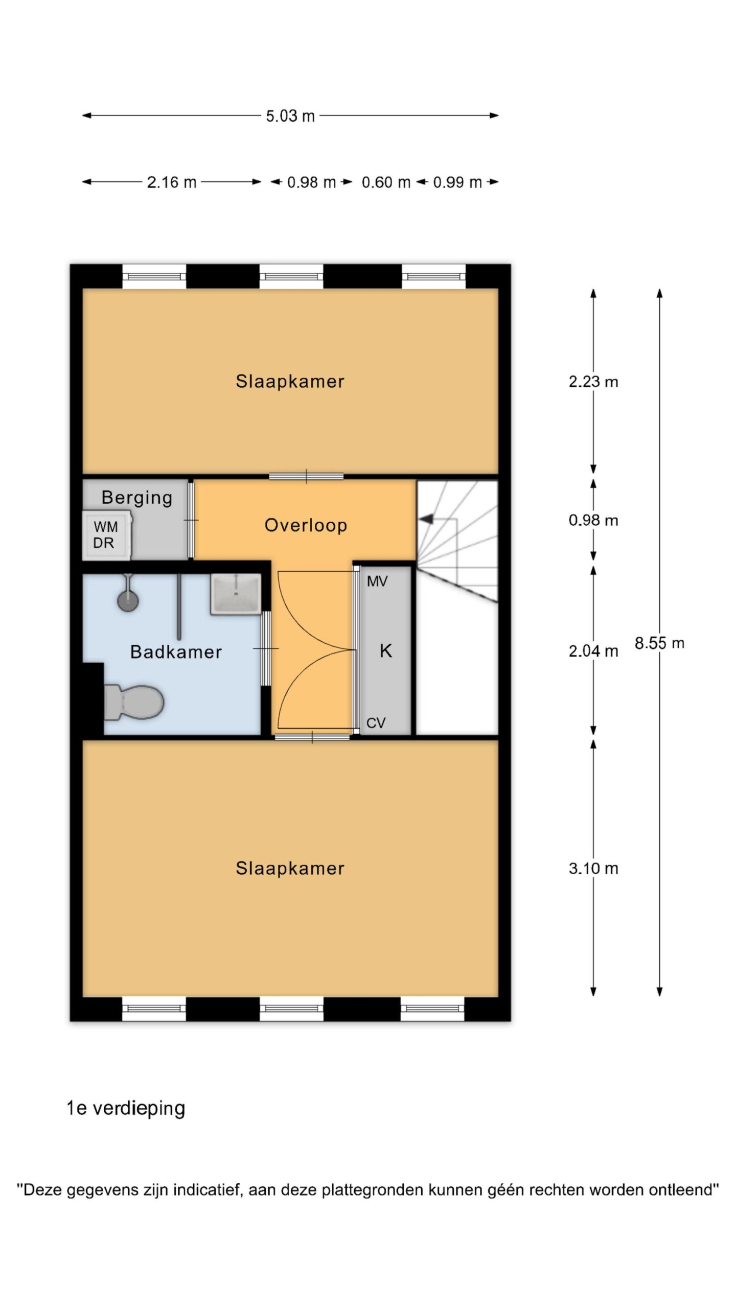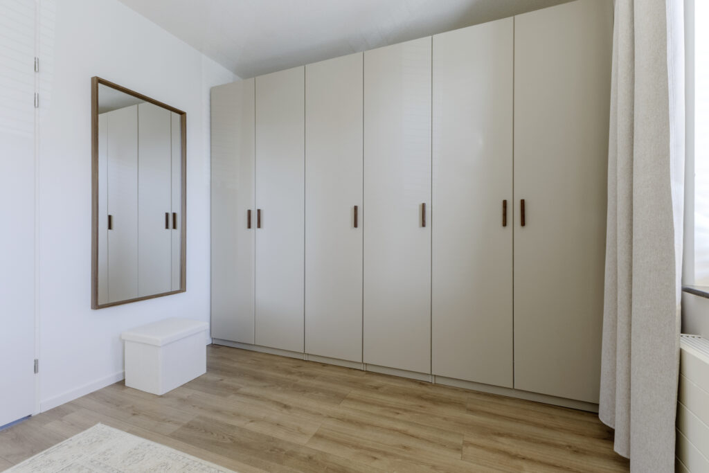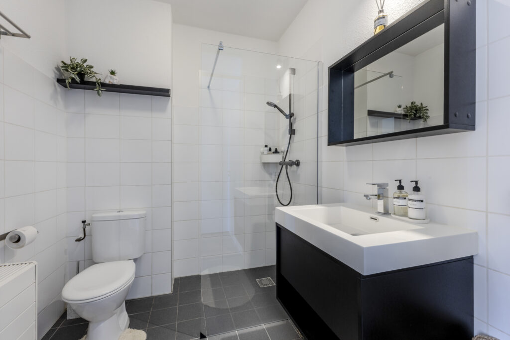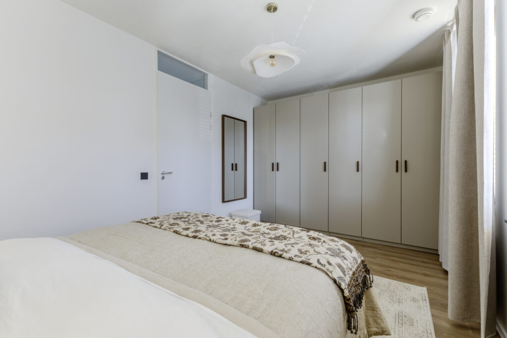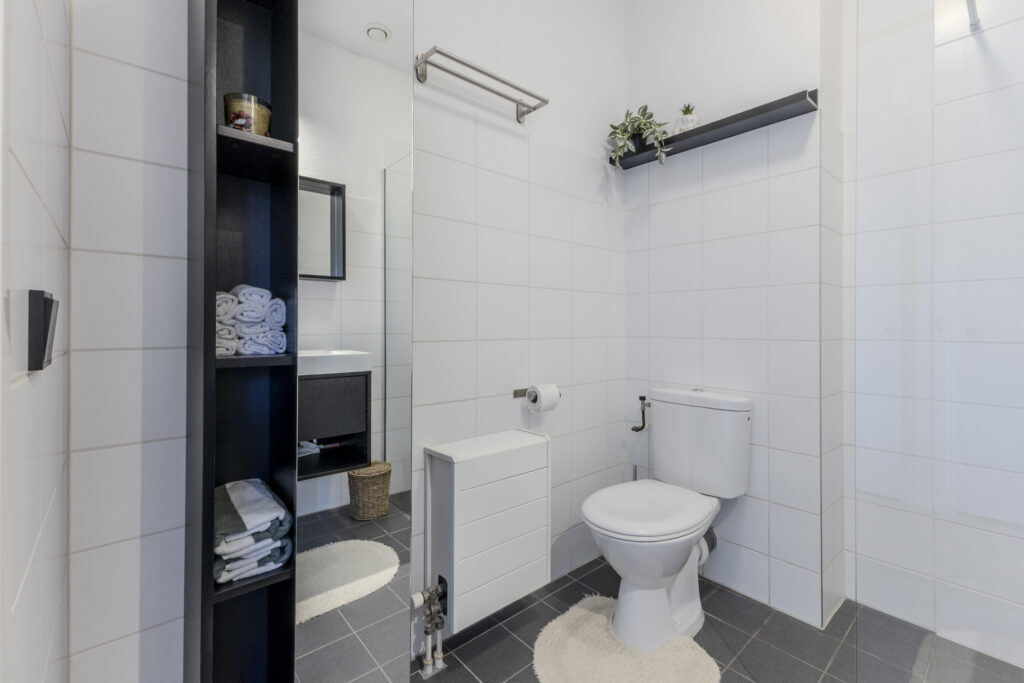 Op de verdieping bevinden zich twee ruime slaapkamers. Beide kamers zijn groot genoeg voor een tweepersoonsbed en bieden daarnaast voldoende ruimte voor kasten. De master bedroom is bijzonder comfortabel van formaat en voelt ruim en rustig aan. Tussen de slaapkamers ligt de badkamer, die is voorzien van een inloopdouche, toilet en wastafel. Daarnaast is er een praktische, separate plek voor de wasmachine en droger. De woning is bovendien uitgerust met een WTW-systeem (warmteterugwinning), wat zorgt voor een prettig en gezond binnenklimaat met continue frisse lucht.