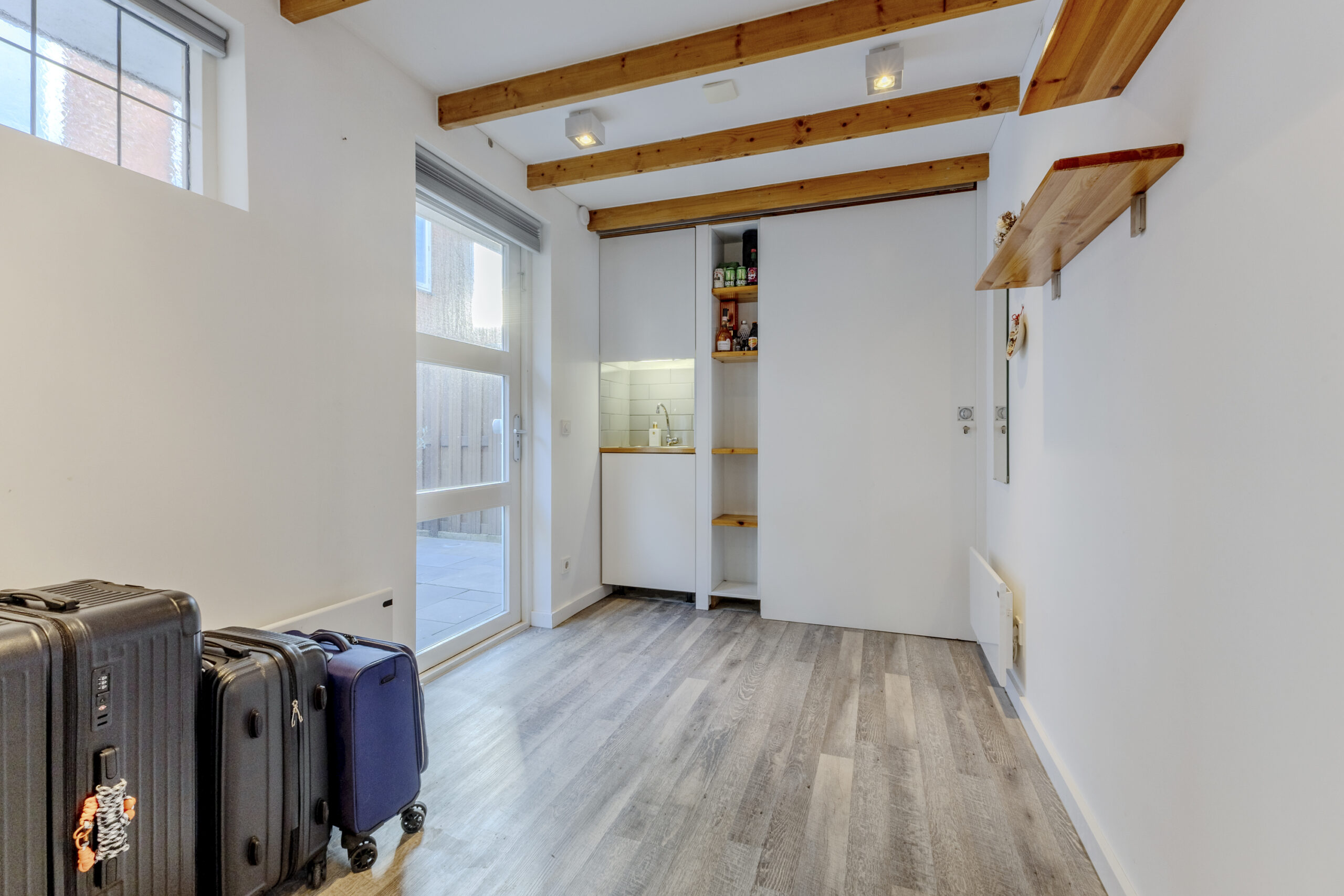 Achterin de tuin bevindt zich een multifunctionele werkruimte. Deze ruimte is volledig geïsoleerd, verwarmd en voorzien van elektra en water. Hierdoor is de ruimte uitermate geschikt als thuiskantoor, praktijkruimte, salon, atelier of hobbyruimte – een ideale plek om wonen en werken op een prettige manier te combineren.