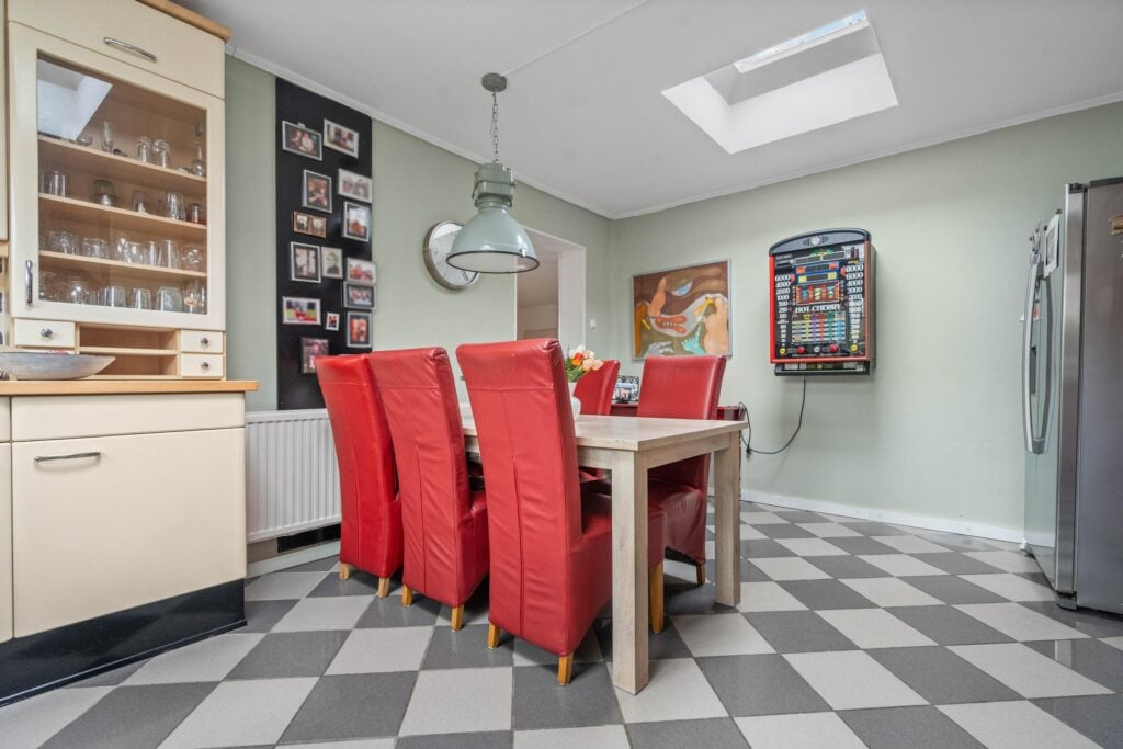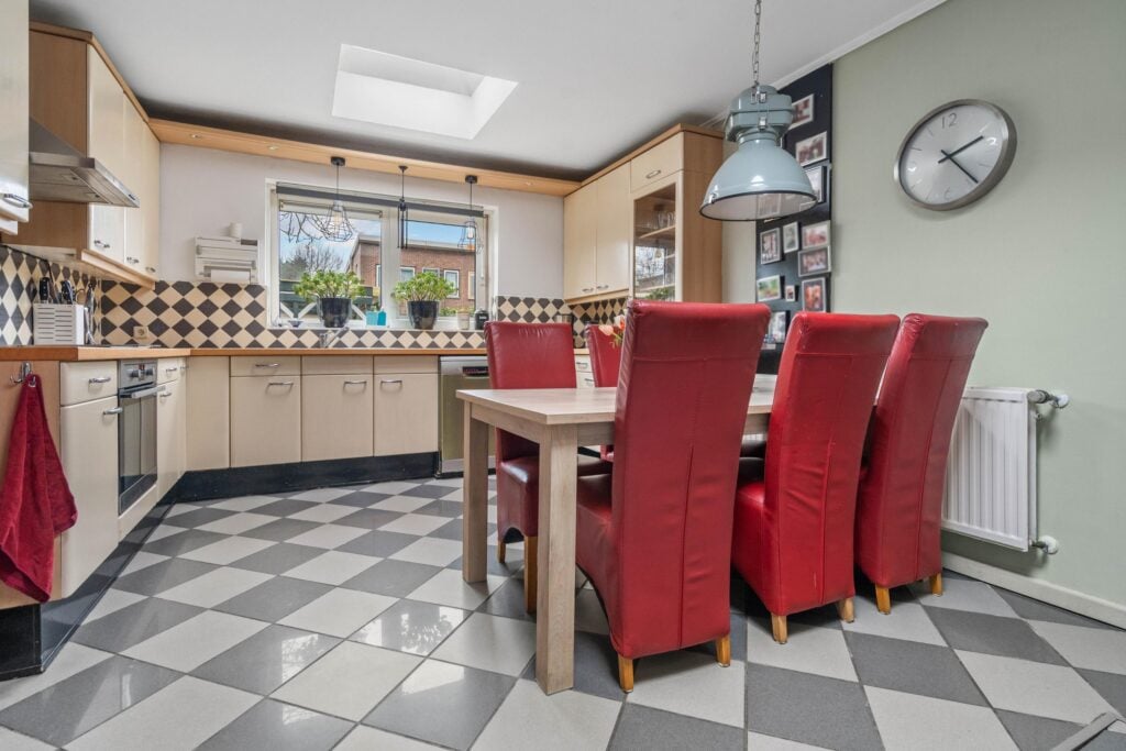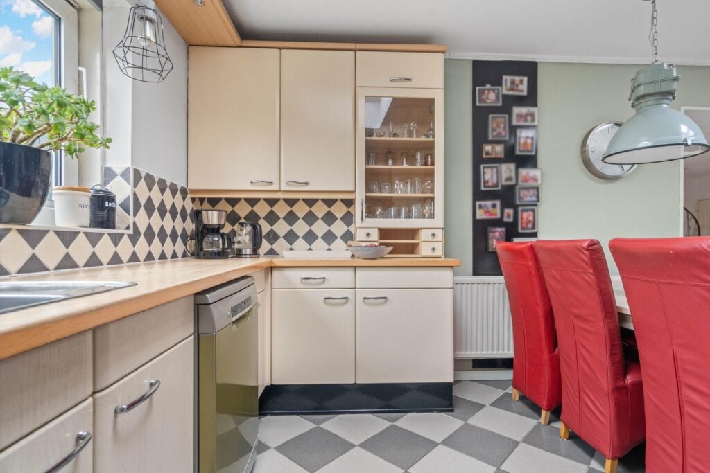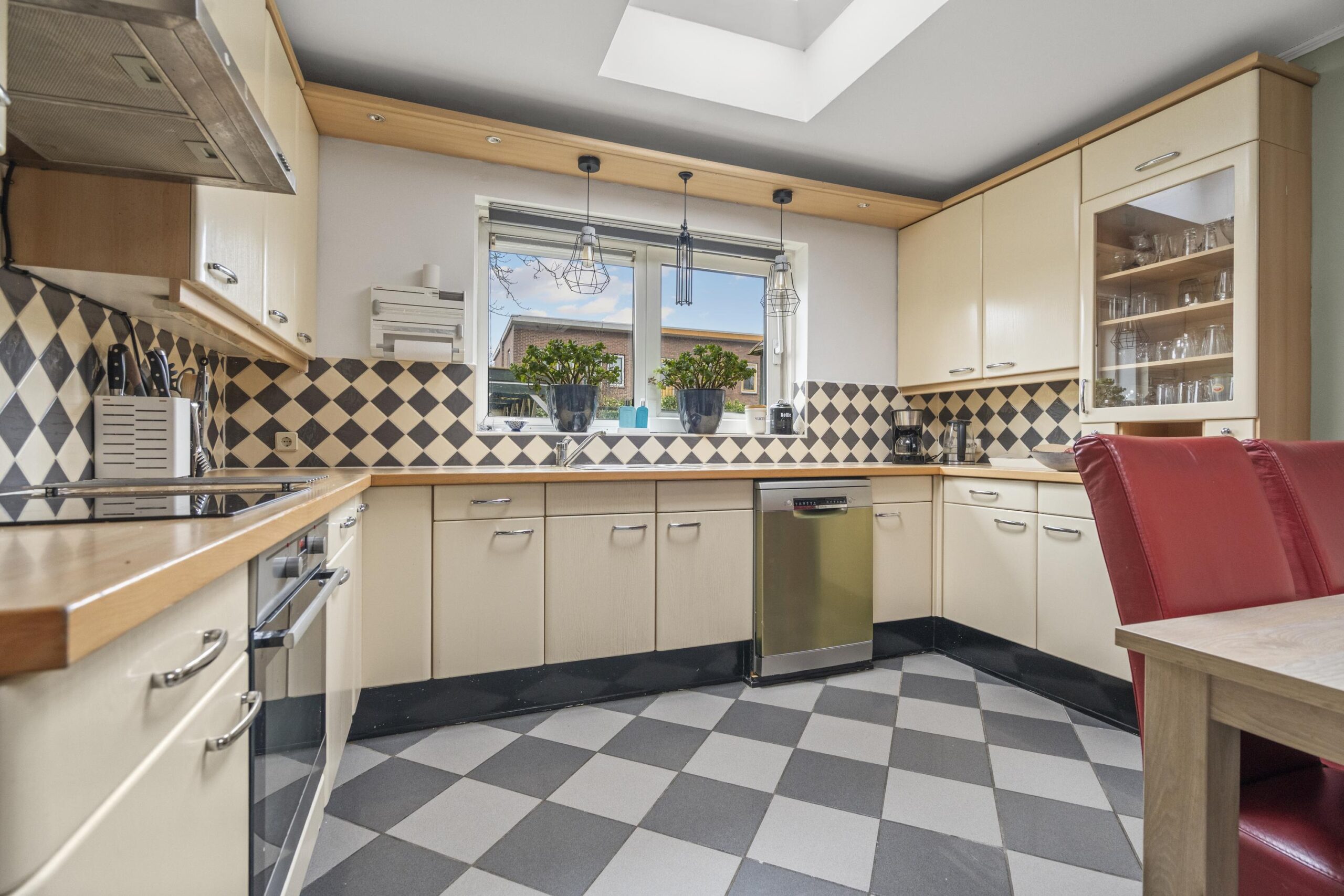 Aan de linkerzijde van de woning bevindt zich de aparte woonkeuken, gerealiseerd middels de aanbouw in 1997. Deze ruimte is royaal van formaat en biedt volop plaats voor een eettafel, waardoor dit echt een leefkeuken is waar je samen kookt en eet. De keukenopstelling dateert uit 1997 en is voorzien van diverse inbouwapparatuur, waaronder een inductiekookplaat uit 2018 en een vaatwasser uit 2024.