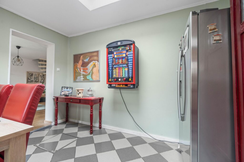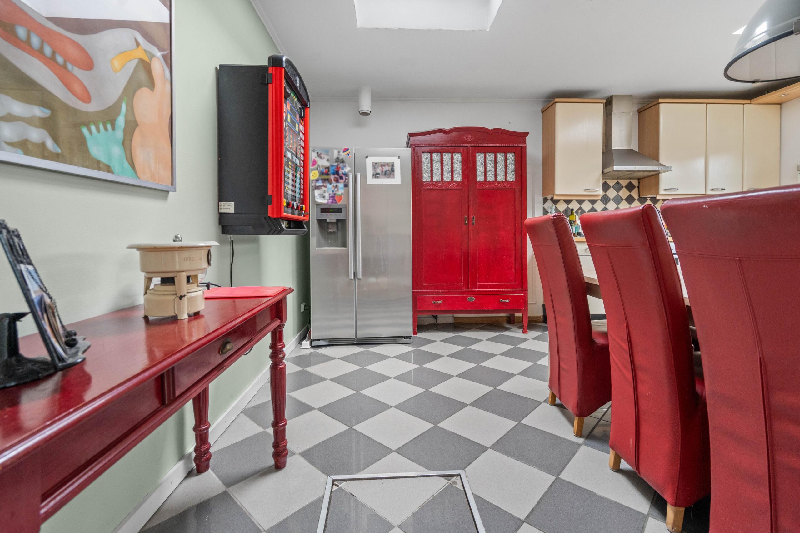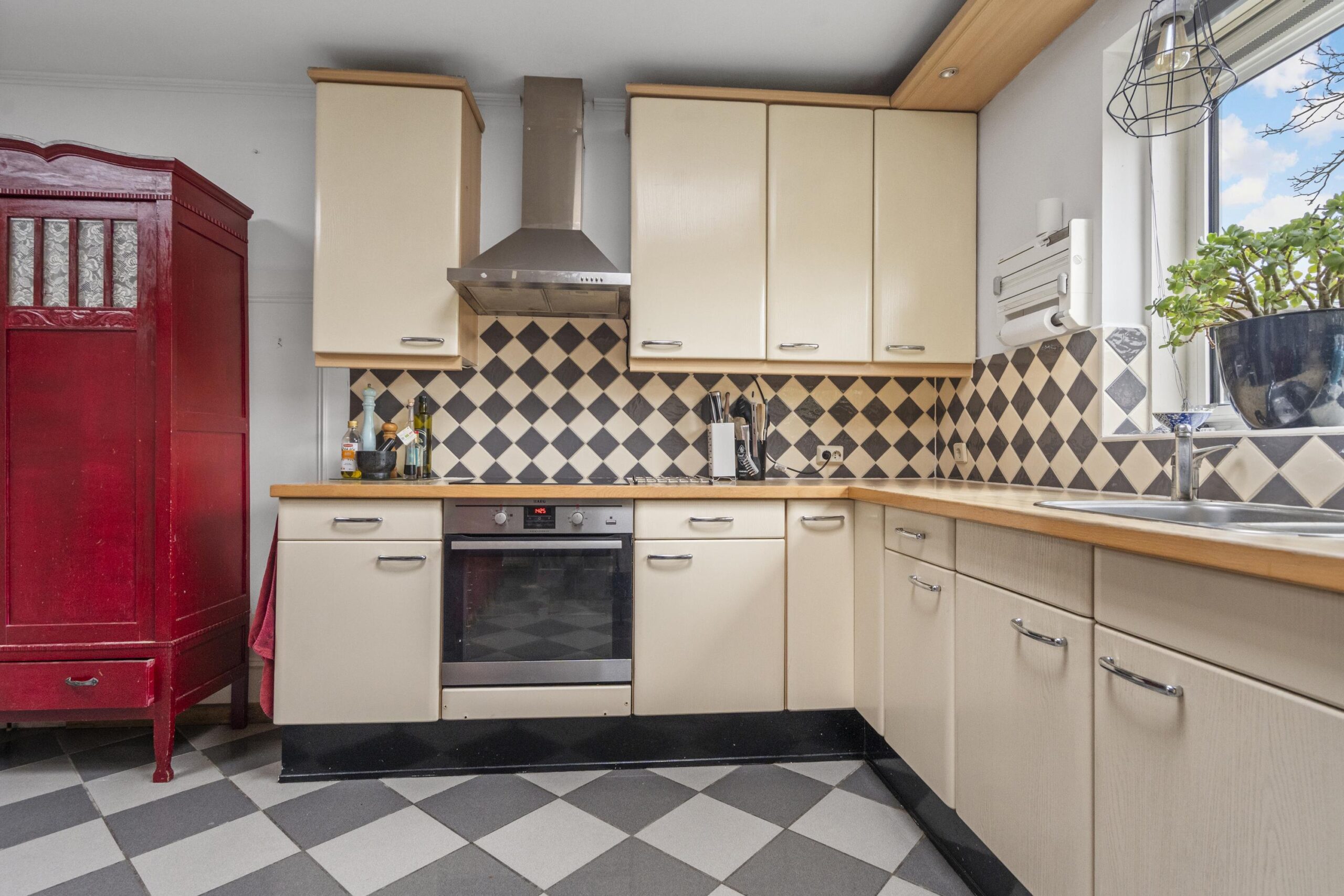 Aan de linkerzijde van de woning bevindt zich de aparte woonkeuken, gerealiseerd middels de aanbouw in 1997. Deze ruimte is royaal van formaat en biedt volop plaats voor een eettafel, waardoor dit echt een leefkeuken is waar je samen kookt en eet. De keukenopstelling dateert uit 1997 en is voorzien van diverse inbouwapparatuur, waaronder een inductiekookplaat uit 2018 en een vaatwasser uit 2024.