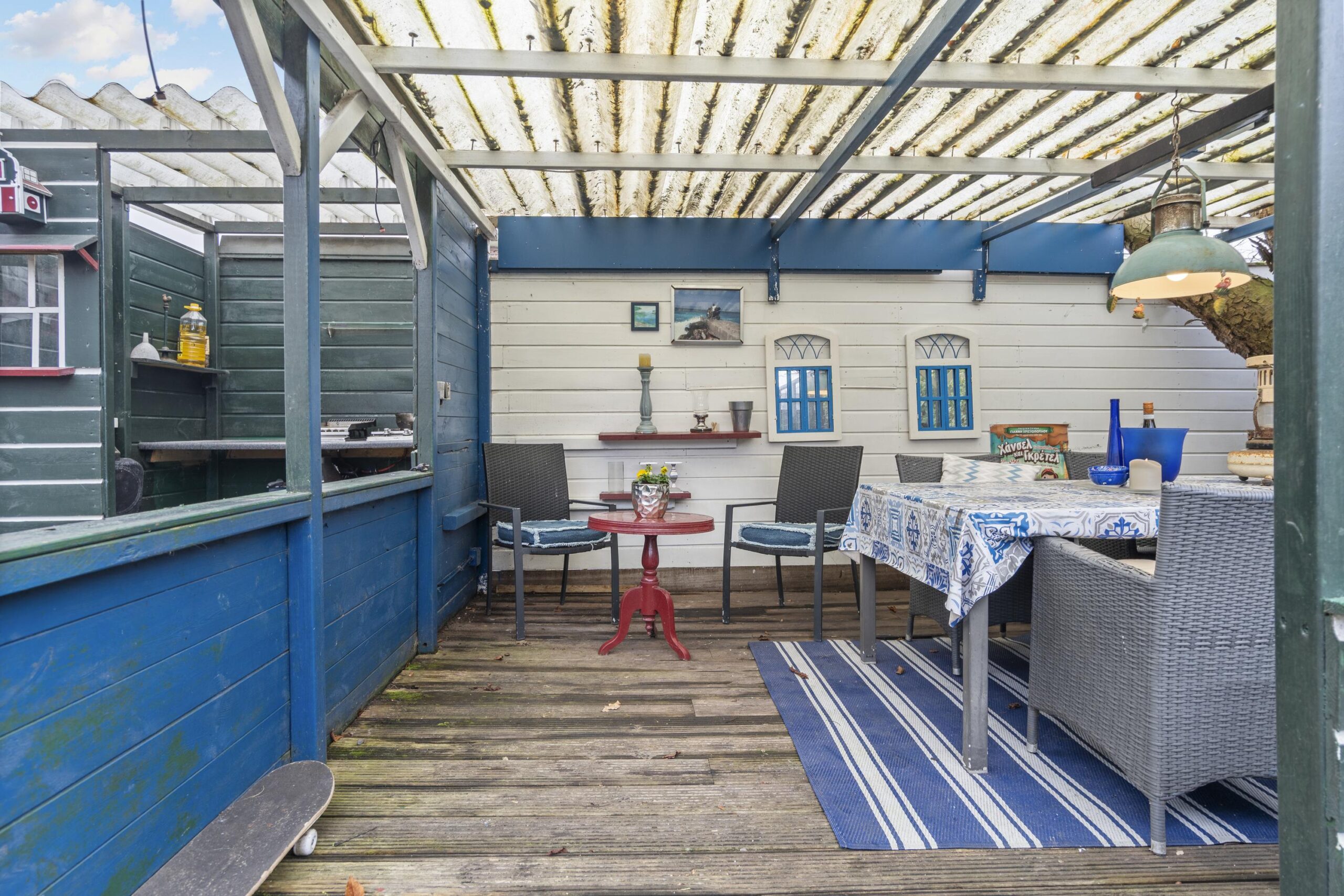 Aan de hoekzijde van de woning is daarnaast een ruime aangebouwde berging gerealiseerd, ideaal voor het stallen van fietsen en motoren of in te richten als praktische klusruimte.