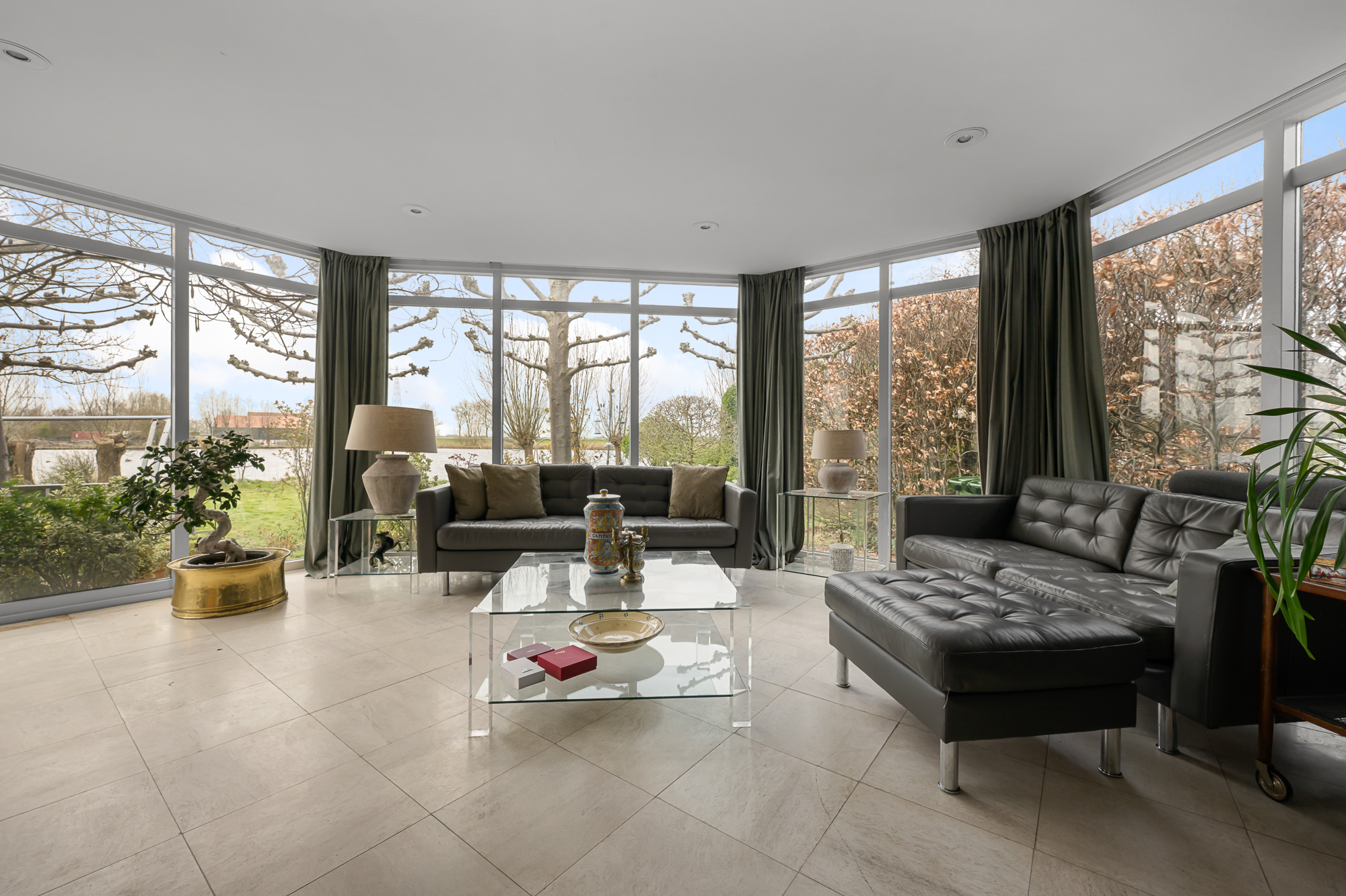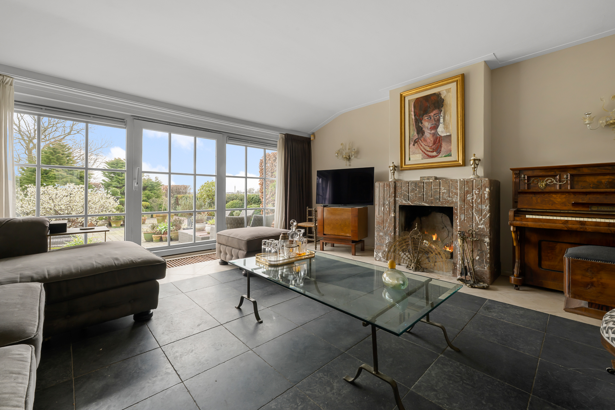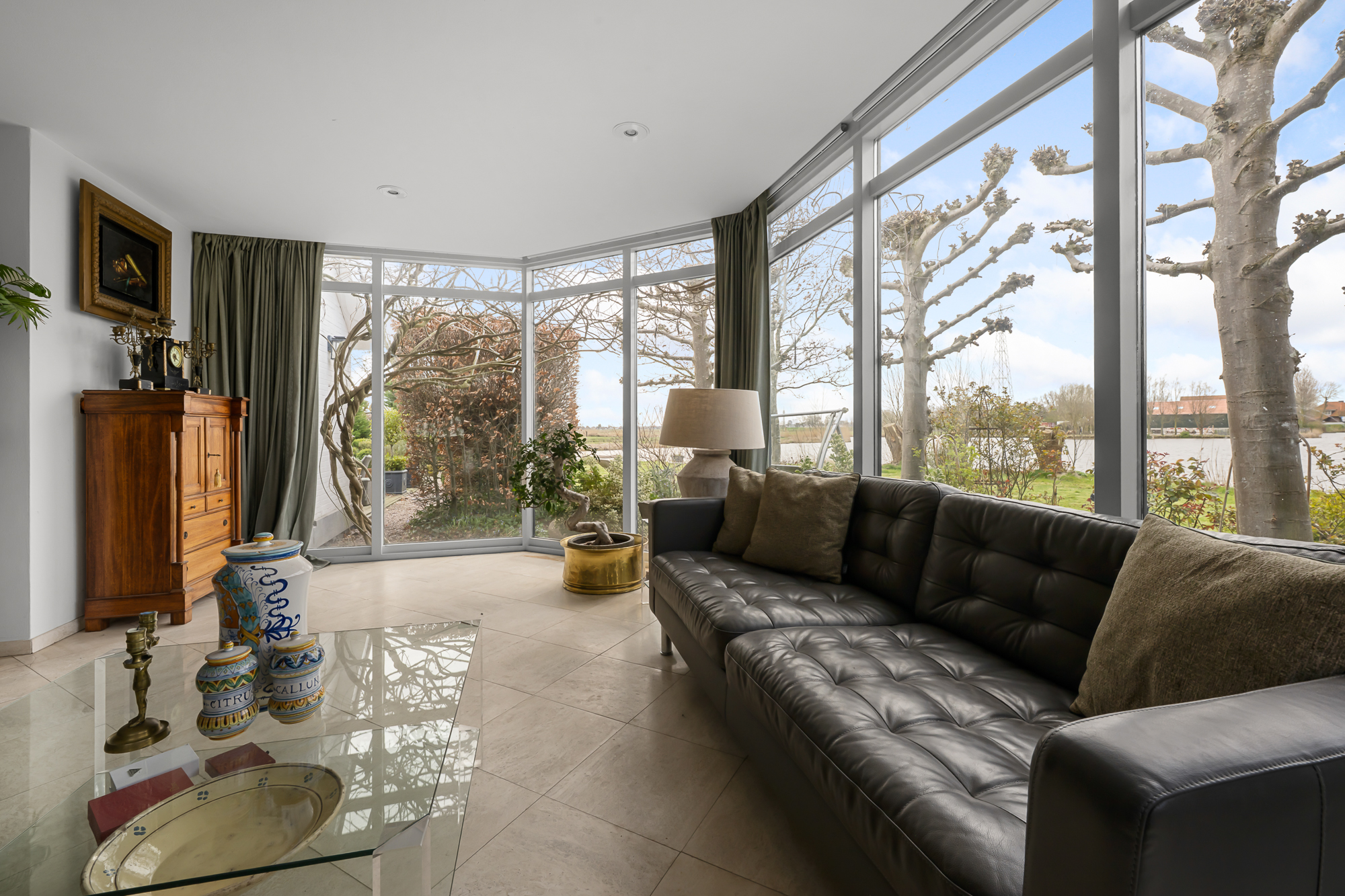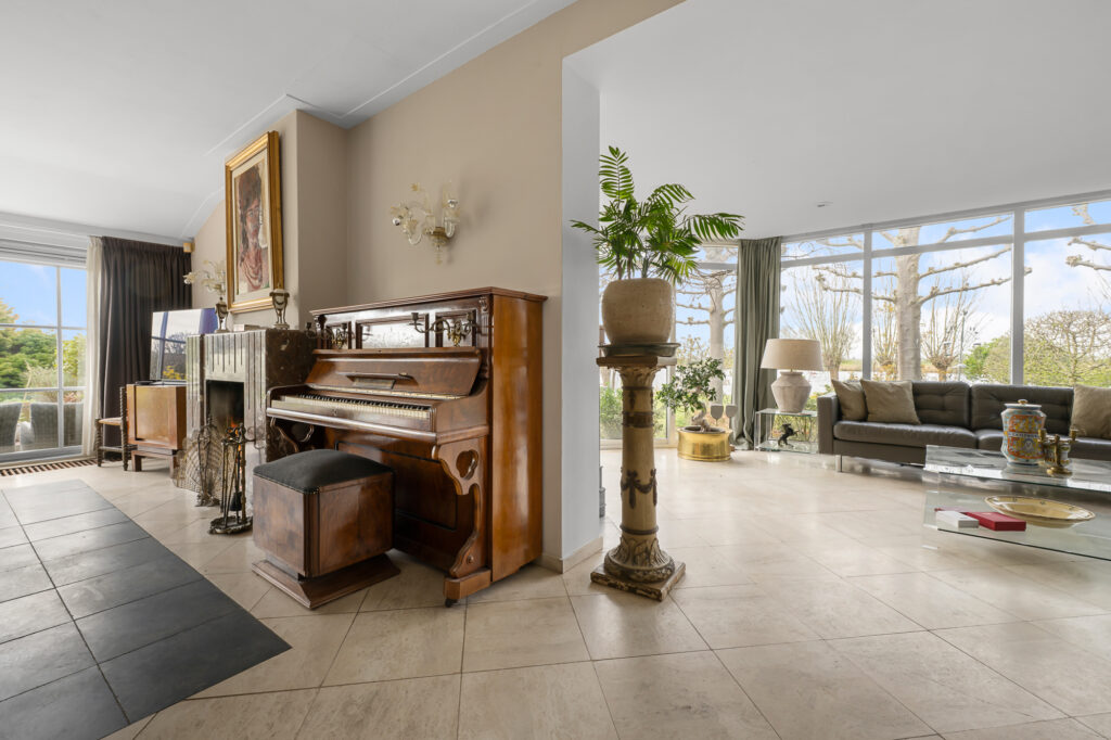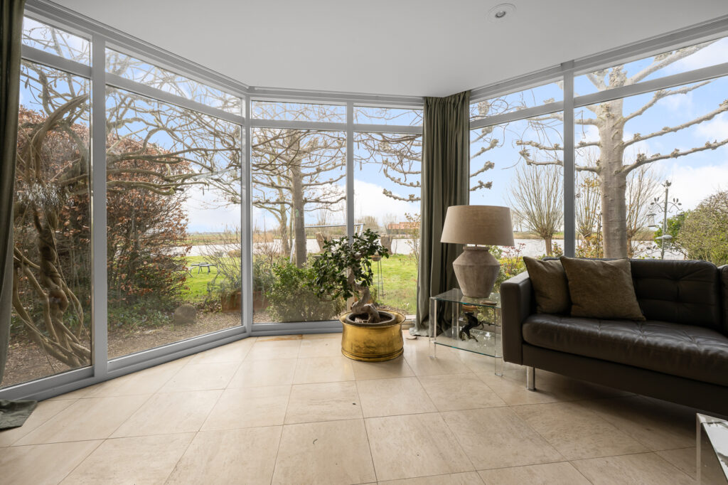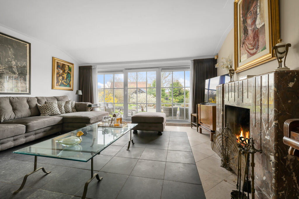 – Royale en lichte woonkamer met grote raampartijen, panoramisch uitzicht en sfeervolle open haard;