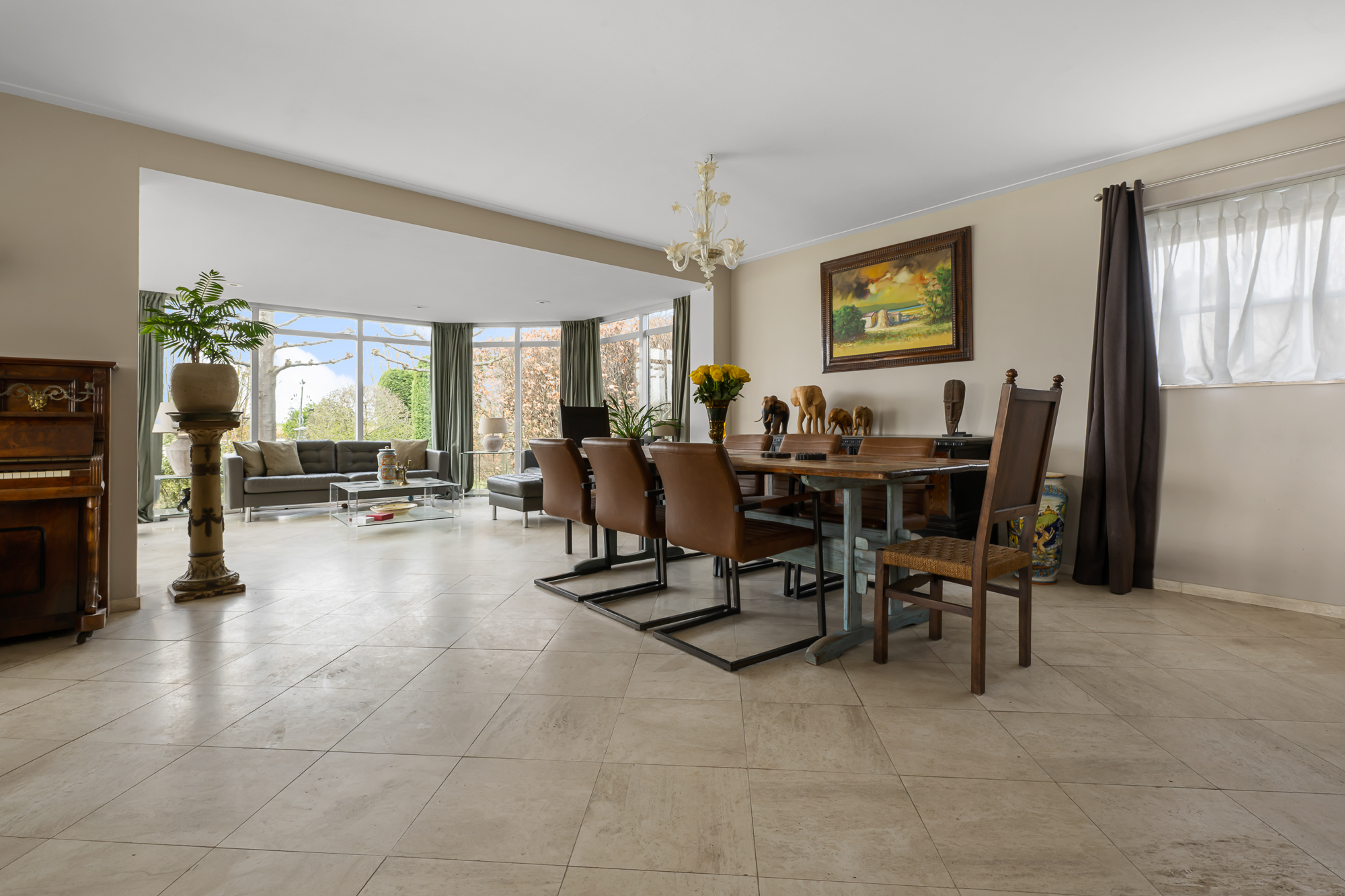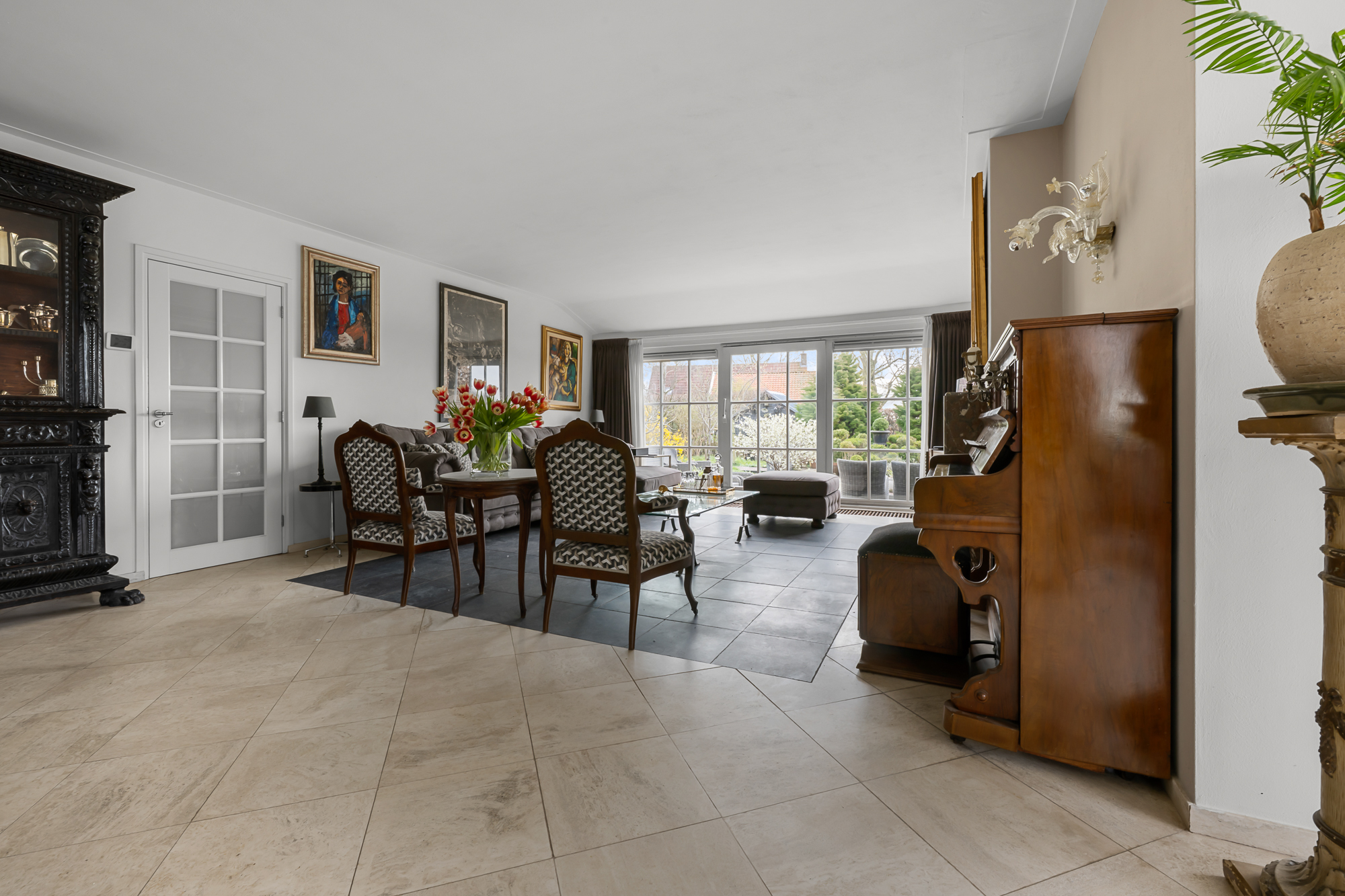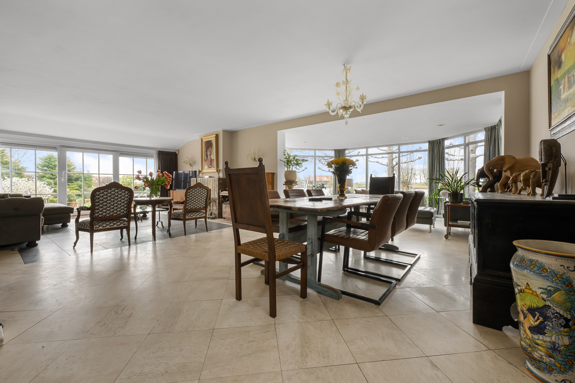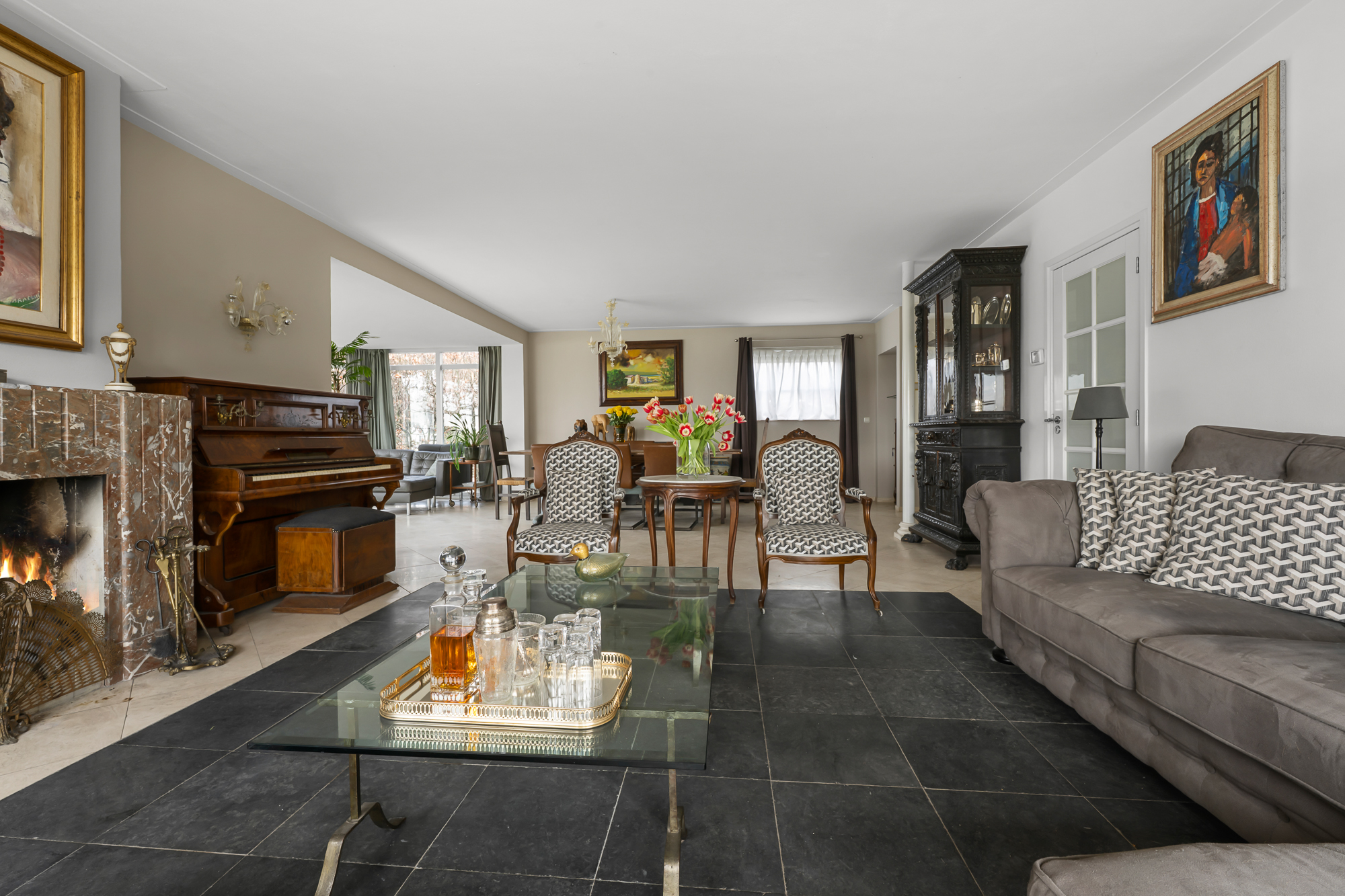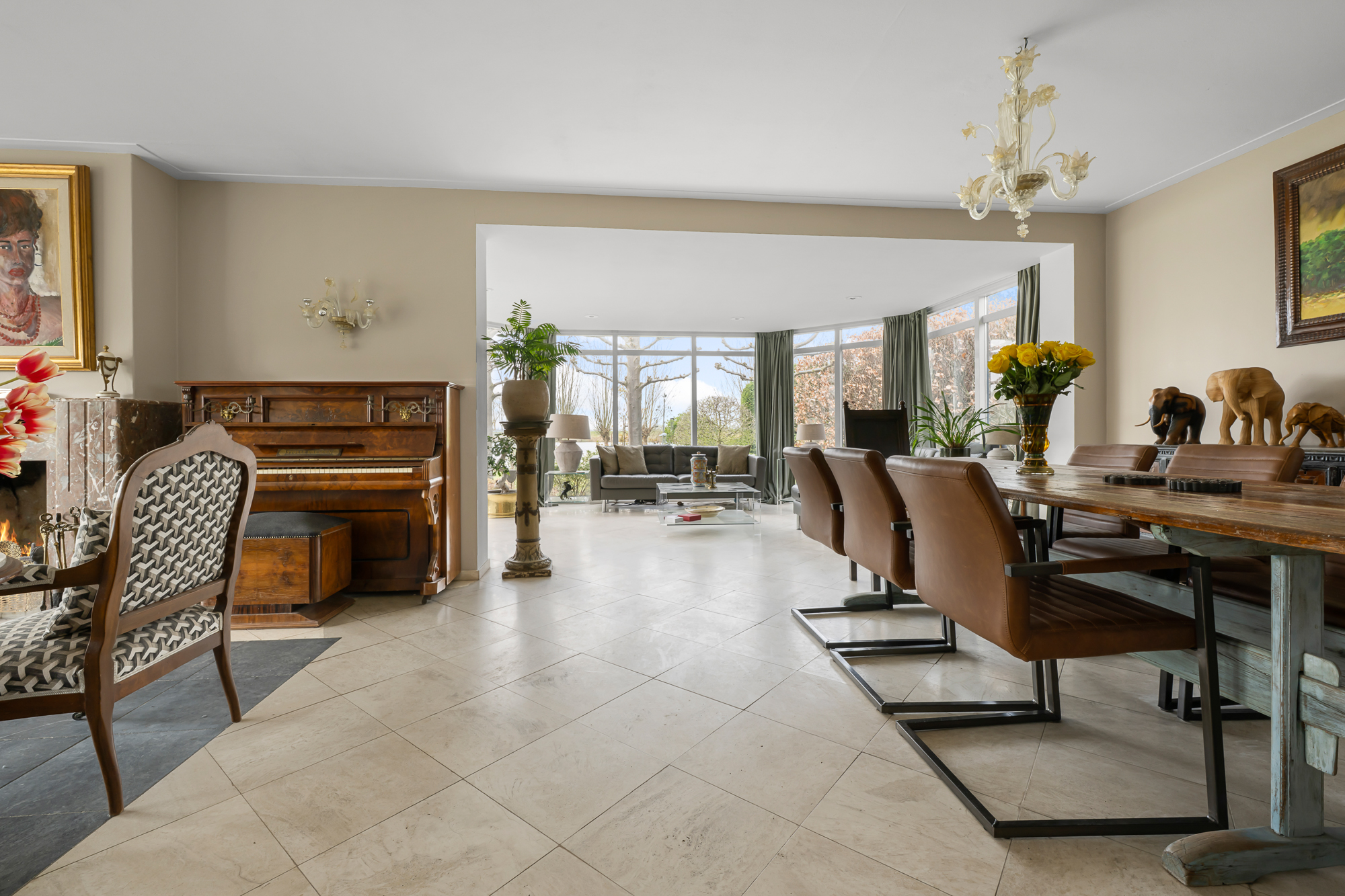 – Royale en lichte woonkamer met grote raampartijen, panoramisch uitzicht en sfeervolle open haard;