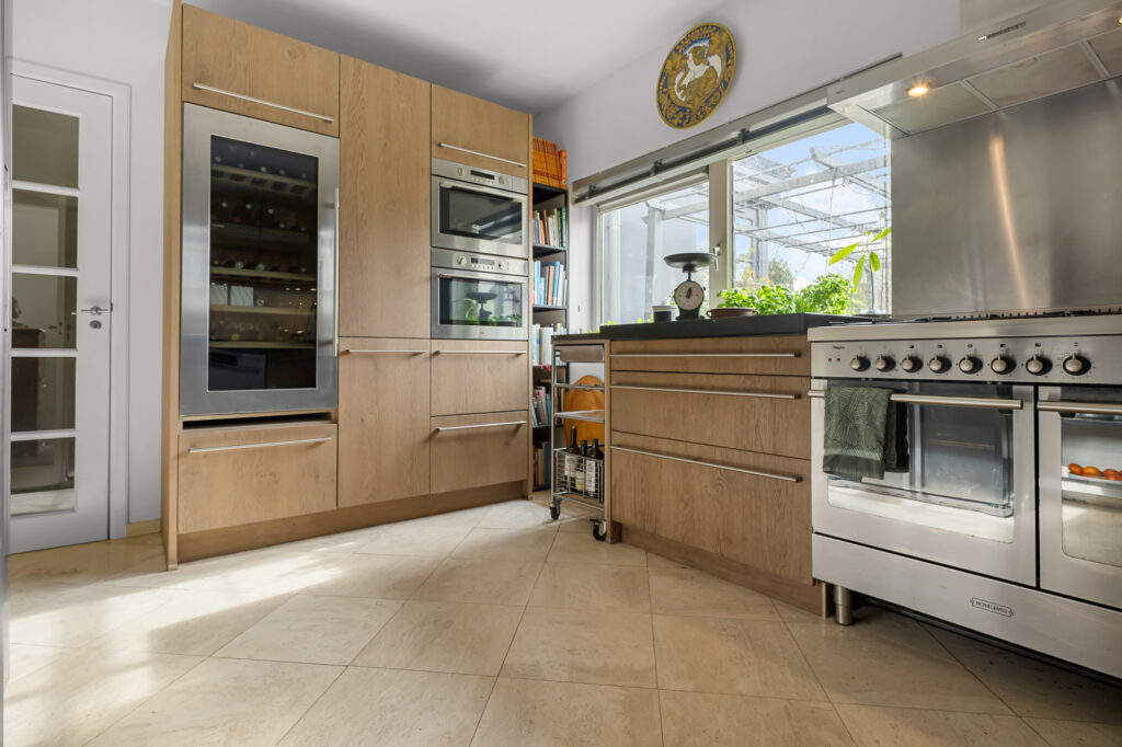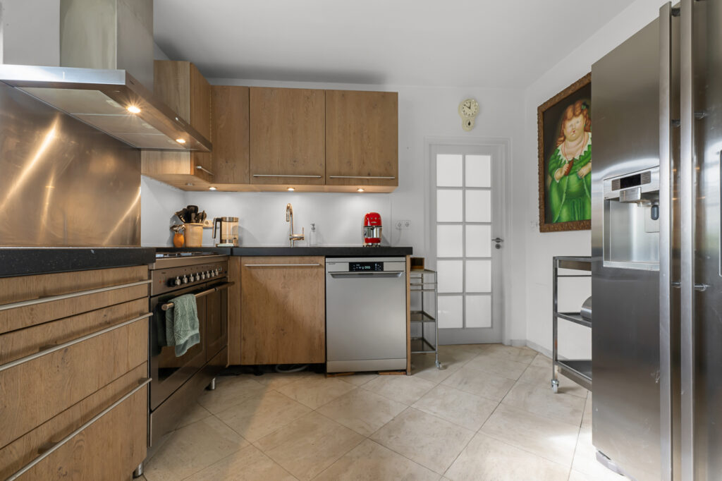 Via de entree stap je de woning binnen in de hal, die je verder leidt naar de woonkamer. Dit is zonder twijfel één van de meest indrukwekkende ruimtes van het huis. Dankzij de grote raampartijen rondom geniet je hier van een panoramisch uitzicht over het ‘Markermeertje’. Het daglicht stroomt rijkelijk naar binnen en geeft de ruimte een open en lichte sfeer. Aan de woonkamer heb je direct toegang tot de veranda, een heerlijke plek waar je kunt zitten en in alle rust kunt genieten van het uitzicht over het water. Hiermee vormt binnen en buiten één geheel en haal je het buitenleven optimaal naar binnen. Er is meer dan genoeg plek voor meerdere zithoeken en met de open haard creëer je hier eenvoudig een warme, gezellige setting. De keuken sluit perfect aan bij de stijl van de woning en is van alle gemakken voorzien. Je beschikt hier over onder andere een grote klimaatkoelkast, vaatwasser en oven. Of je nu uitgebreid wilt koken of snel iets wilt bereiden, je hebt hier alle ruimte en voorzieningen.