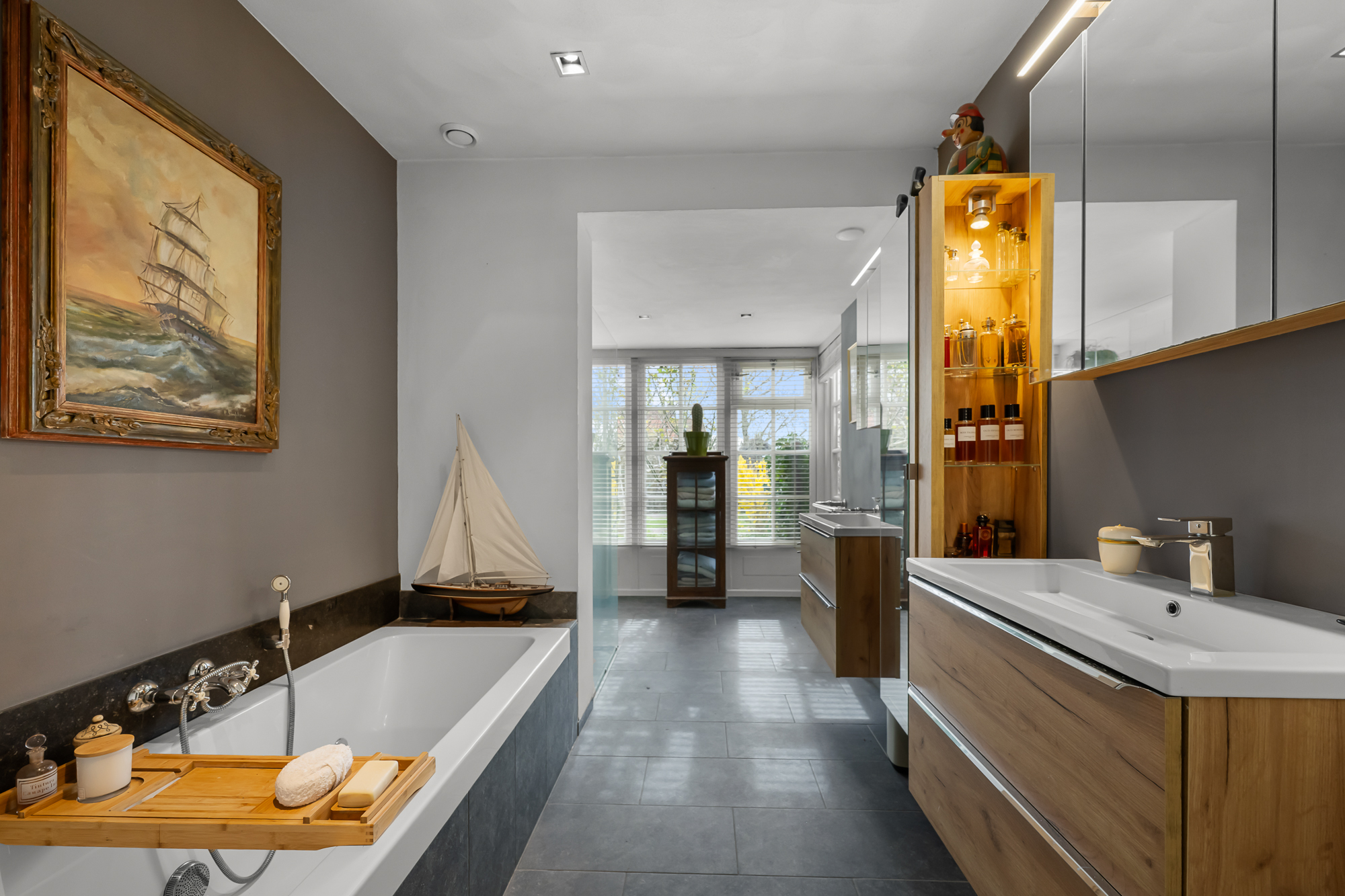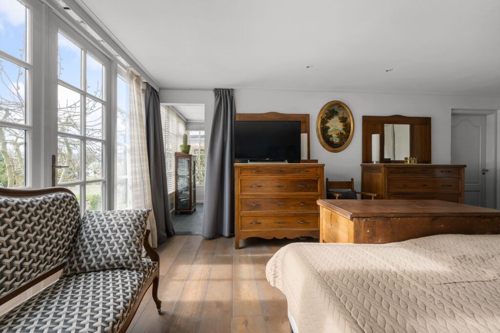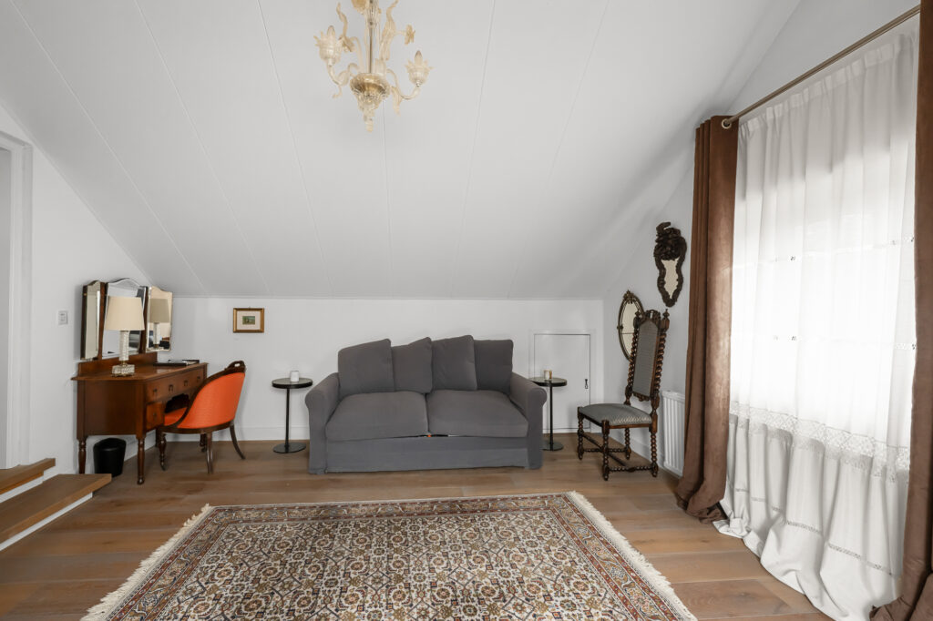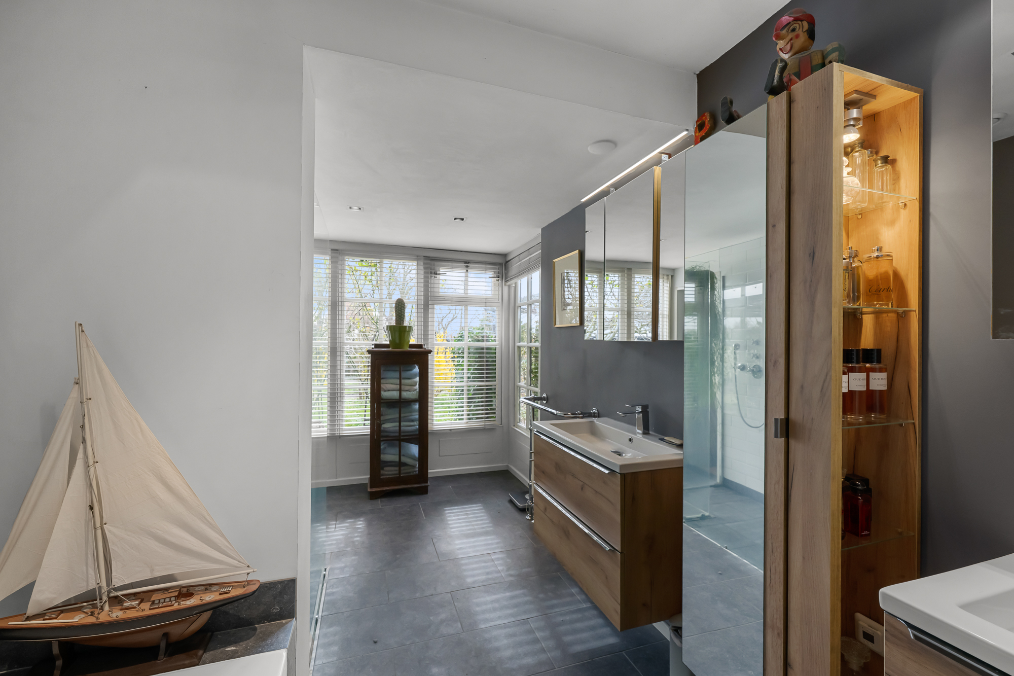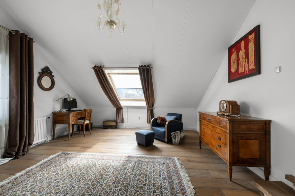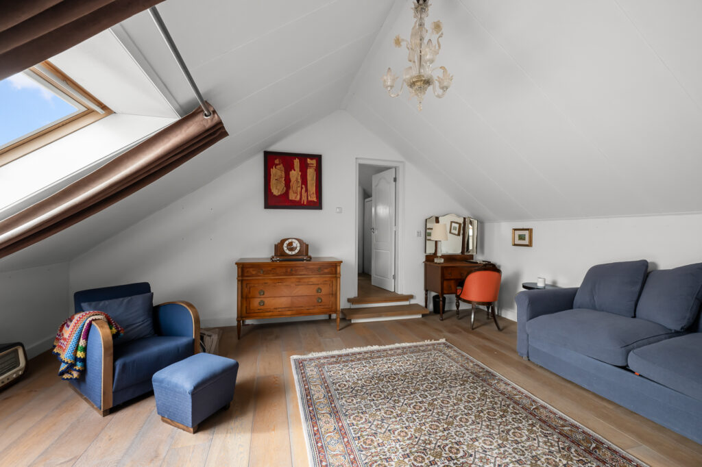 Op de begane grond vind je daarnaast een slaapkamer en een complete badkamer met inloopdouche, ligbad en dubbele wastafel. Dit maakt de woning uitermate geschikt als levensloopbestendige woning. Tegelijkertijd is deze ruimte ook perfect te gebruiken als gastenverblijf of bijvoorbeeld een kantoor aan huis.