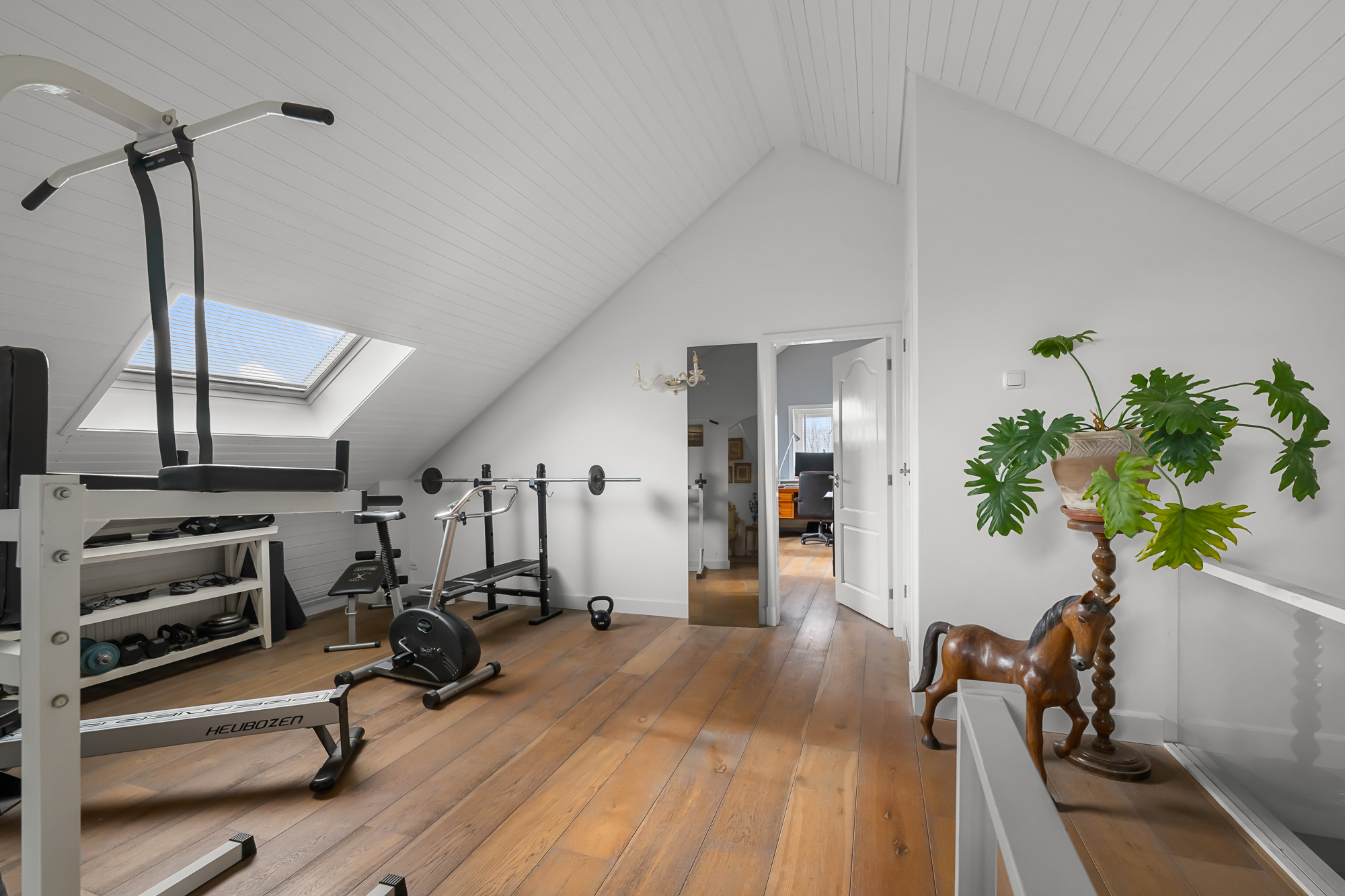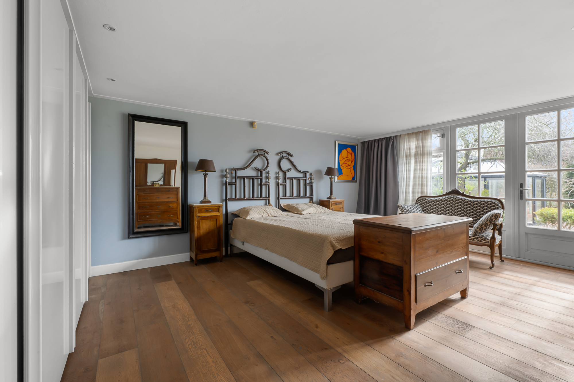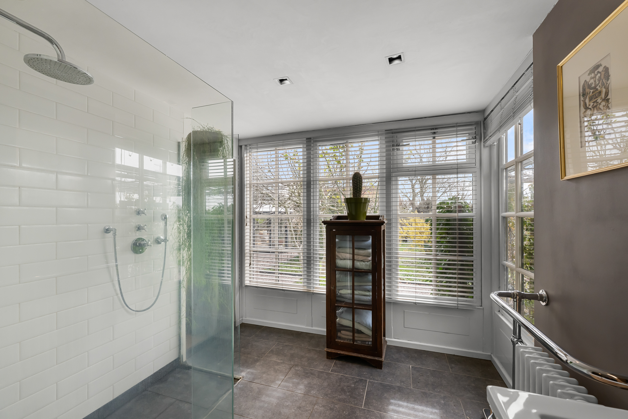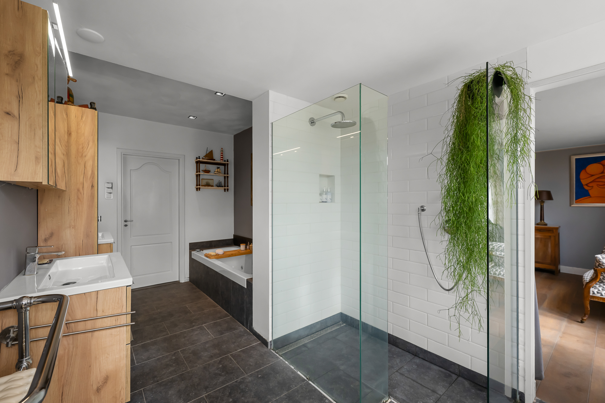 Op de begane grond vind je daarnaast een slaapkamer en een complete badkamer met inloopdouche, ligbad en dubbele wastafel. Dit maakt de woning uitermate geschikt als levensloopbestendige woning. Tegelijkertijd is deze ruimte ook perfect te gebruiken als gastenverblijf of bijvoorbeeld een kantoor aan huis.