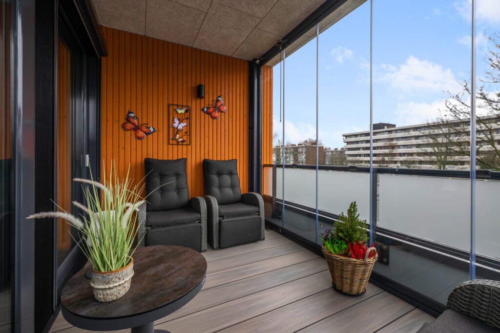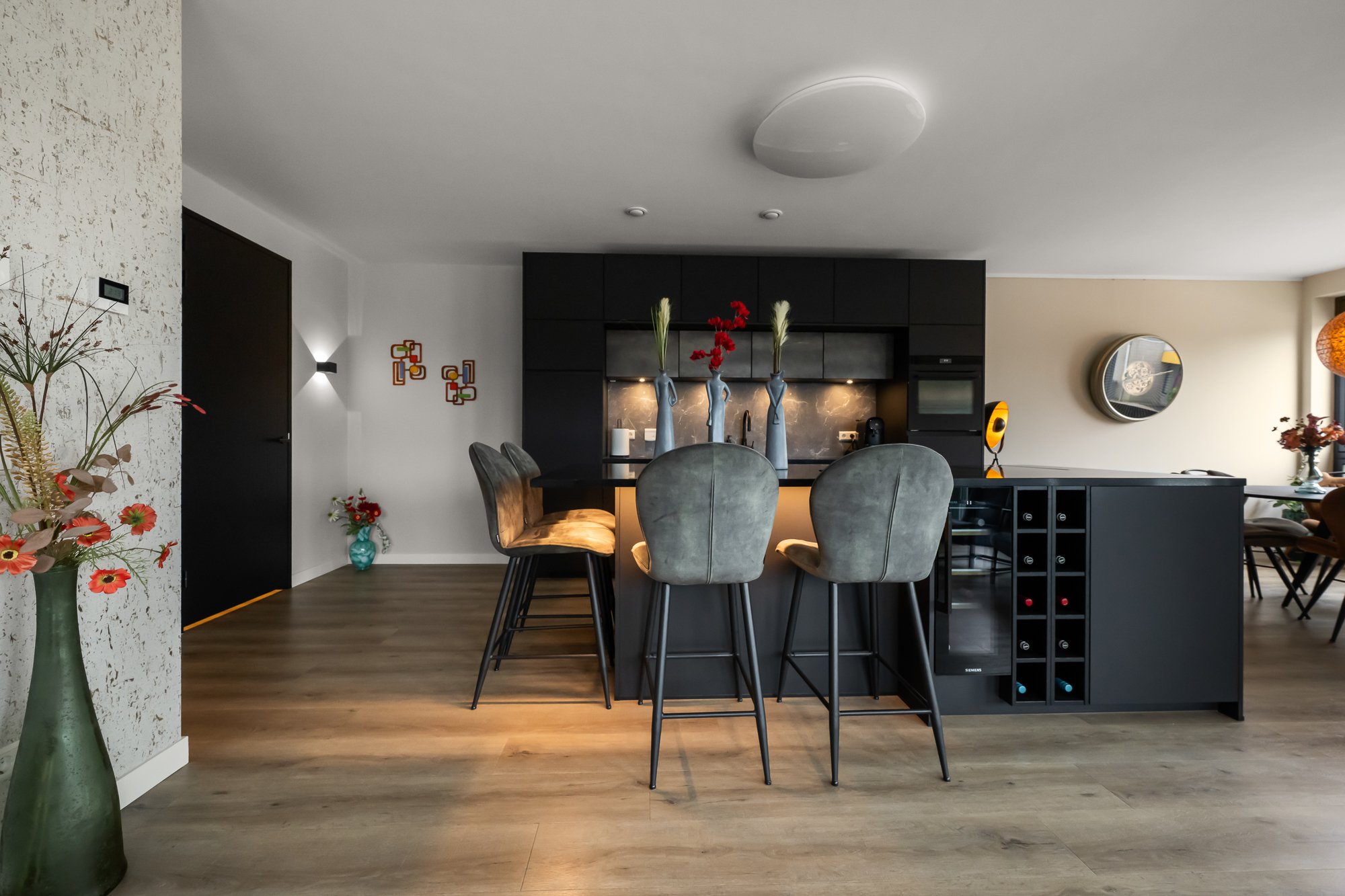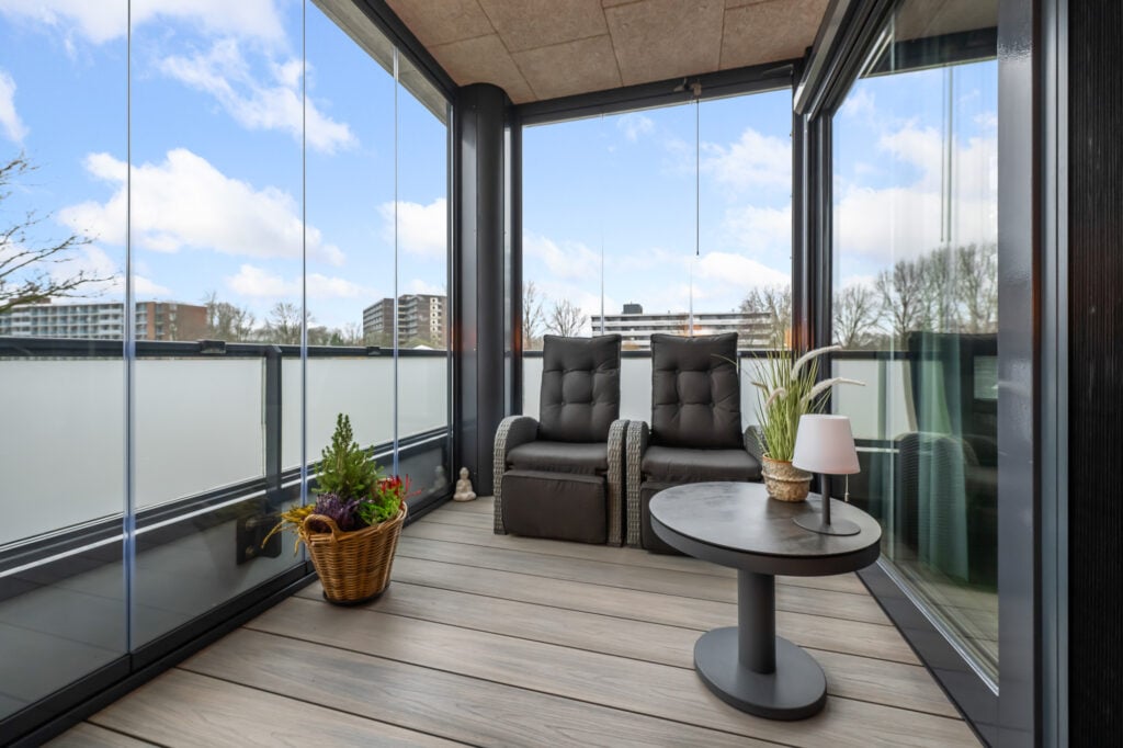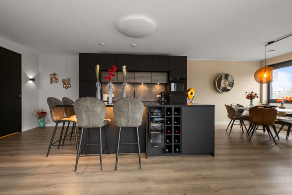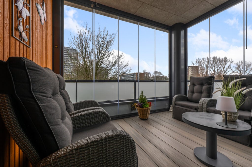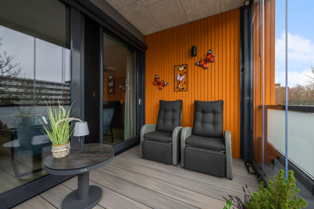 Mocht je nog niet enthousiast zijn geworden, dan hebben we het beste voor het laatste bewaard. De woonkamer met open keuken en balkon zijn een echte eyecatcher. Het centrale middelpunt van de ruimte is het kookeiland met inductie kookplaat en ingebouwde afzuiging, bargedeelte en klimaatkast. Daarnaast heb je een kastenwand met aanrecht waar de overige installatie in zijn verwerkt. Vanuit de woonkamer, met zonnescreens, is het ruime en zonnige balkon te bereiken. De huidige eigenaren hebben ook deze ruimte volledig afgewerkt met balkon beglazing en een composiet vlonder.