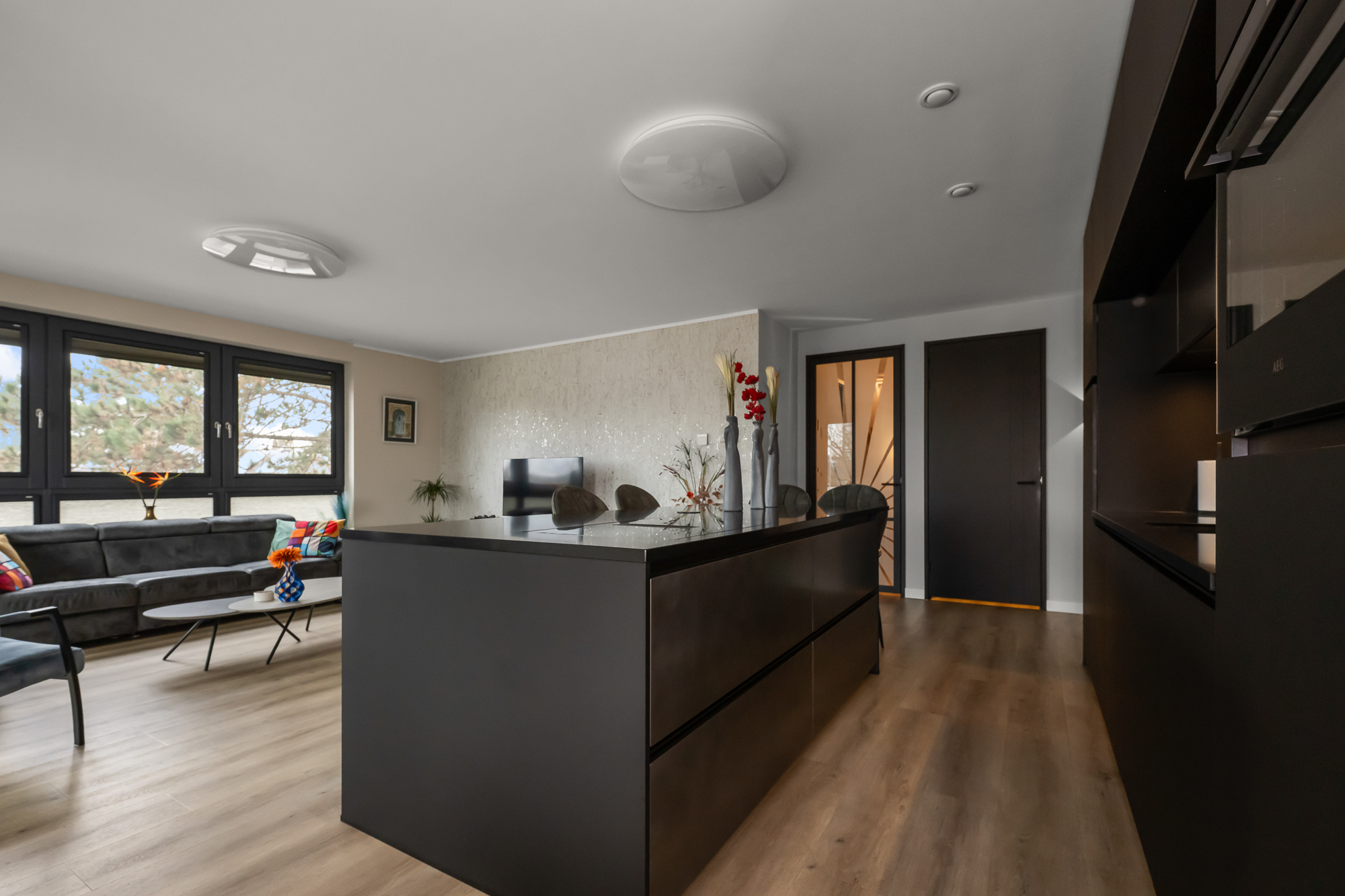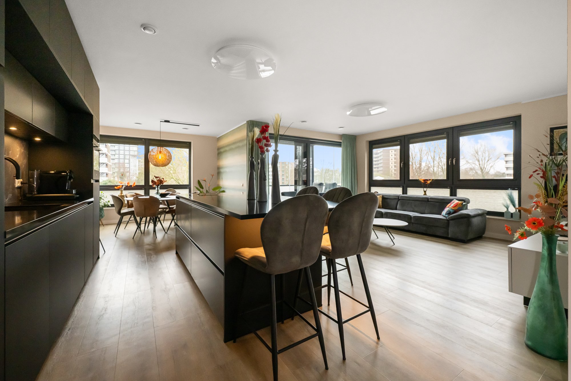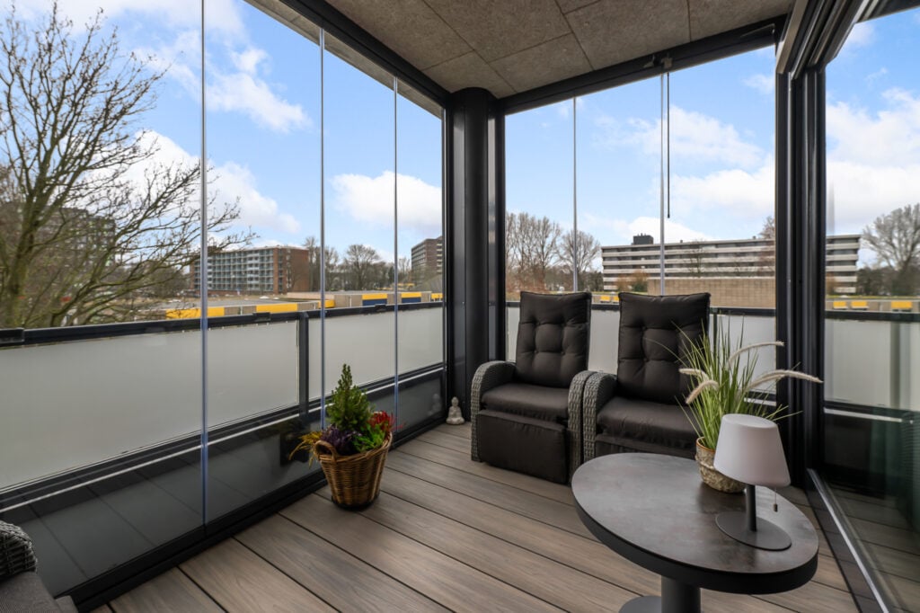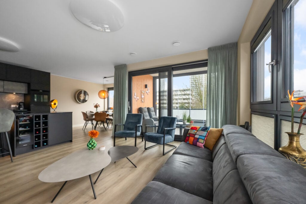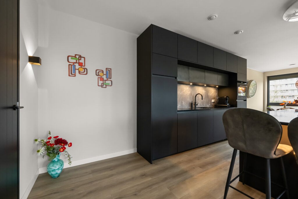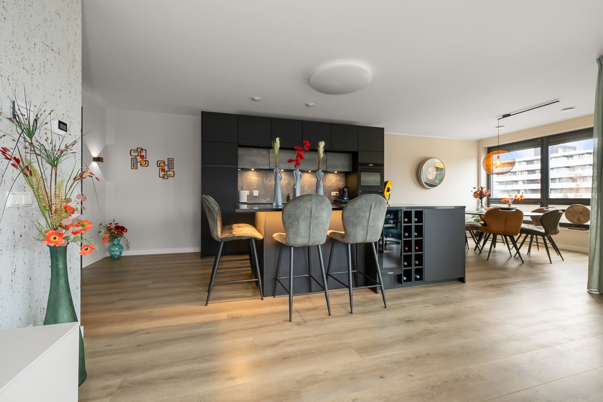 Mocht je nog niet enthousiast zijn geworden, dan hebben we het beste voor het laatste bewaard. De woonkamer met open keuken en balkon zijn een echte eyecatcher. Het centrale middelpunt van de ruimte is het kookeiland met inductie kookplaat en ingebouwde afzuiging, bargedeelte en klimaatkast. Daarnaast heb je een kastenwand met aanrecht waar de overige installatie in zijn verwerkt. Vanuit de woonkamer, met zonnescreens, is het ruime en zonnige balkon te bereiken. De huidige eigenaren hebben ook deze ruimte volledig afgewerkt met balkon beglazing en een composiet vlonder.
