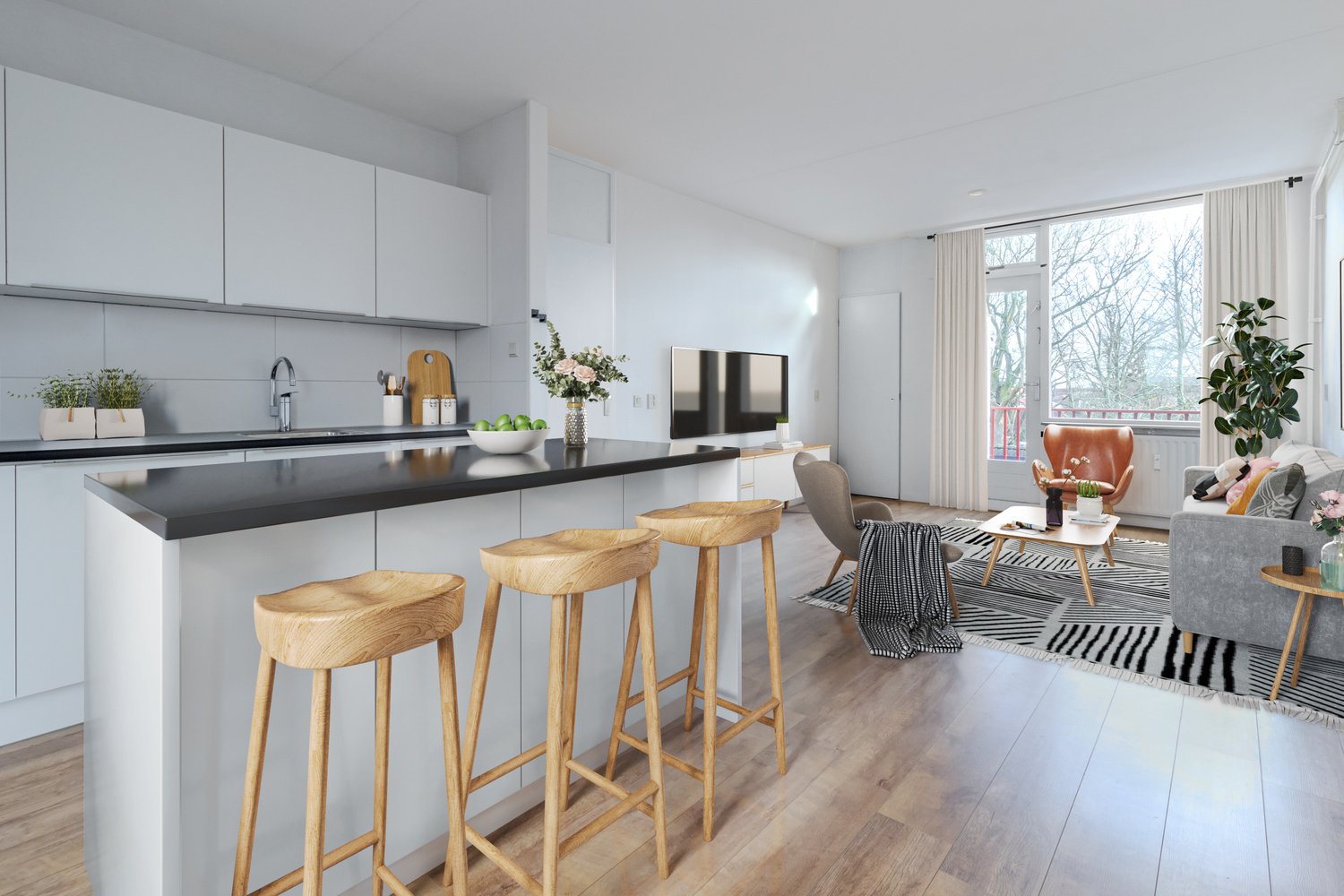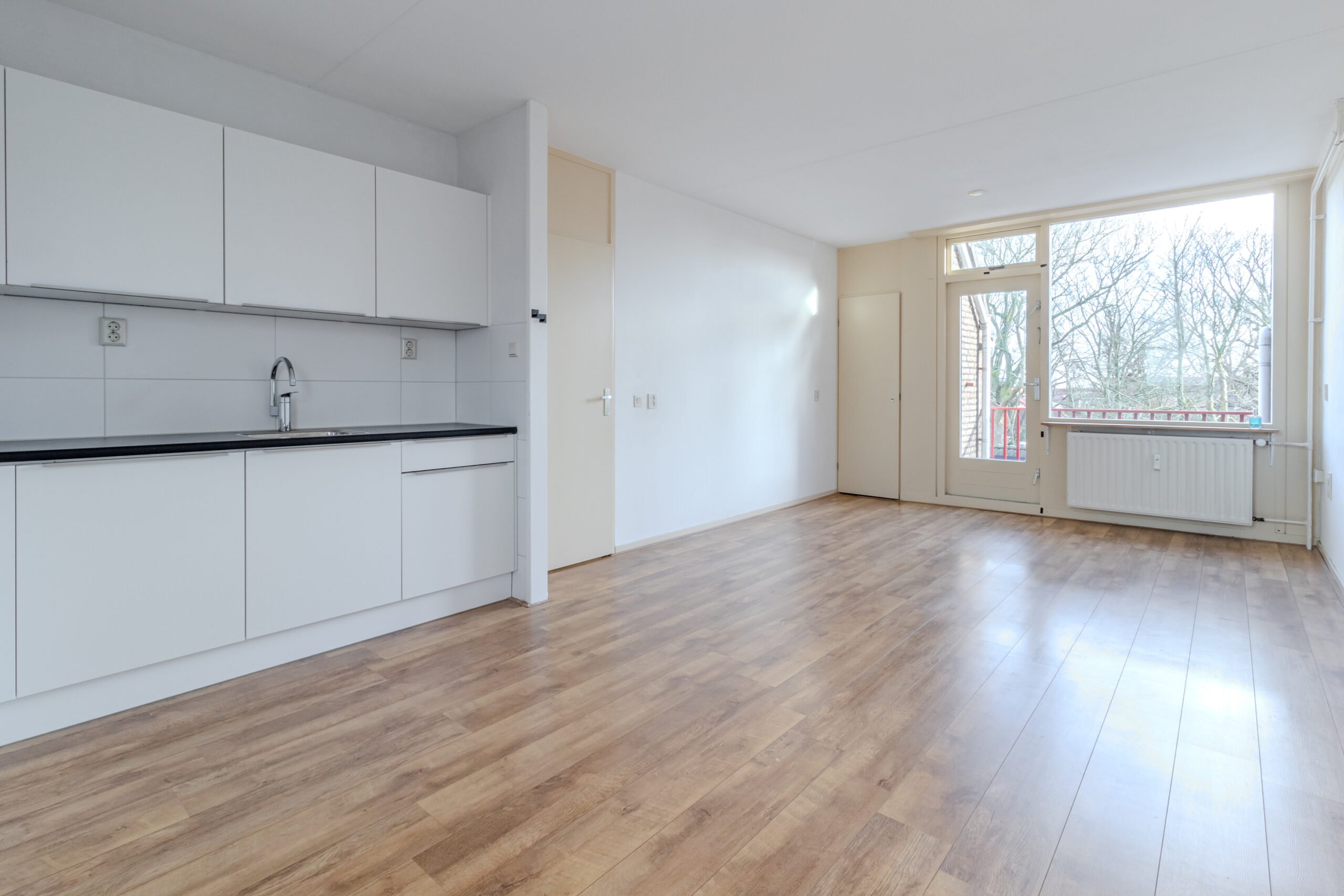 De woonkamer is prettig ingericht en ligt aan de zonnige kant, waardoor je de hele dag geniet van een lichte woning. En niet te vergeten: de woonkamer grenst aan het balkon met uitzicht op het park!