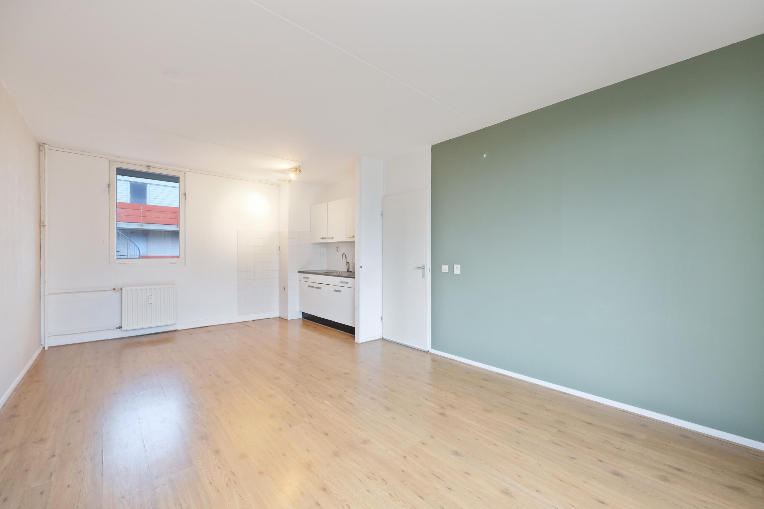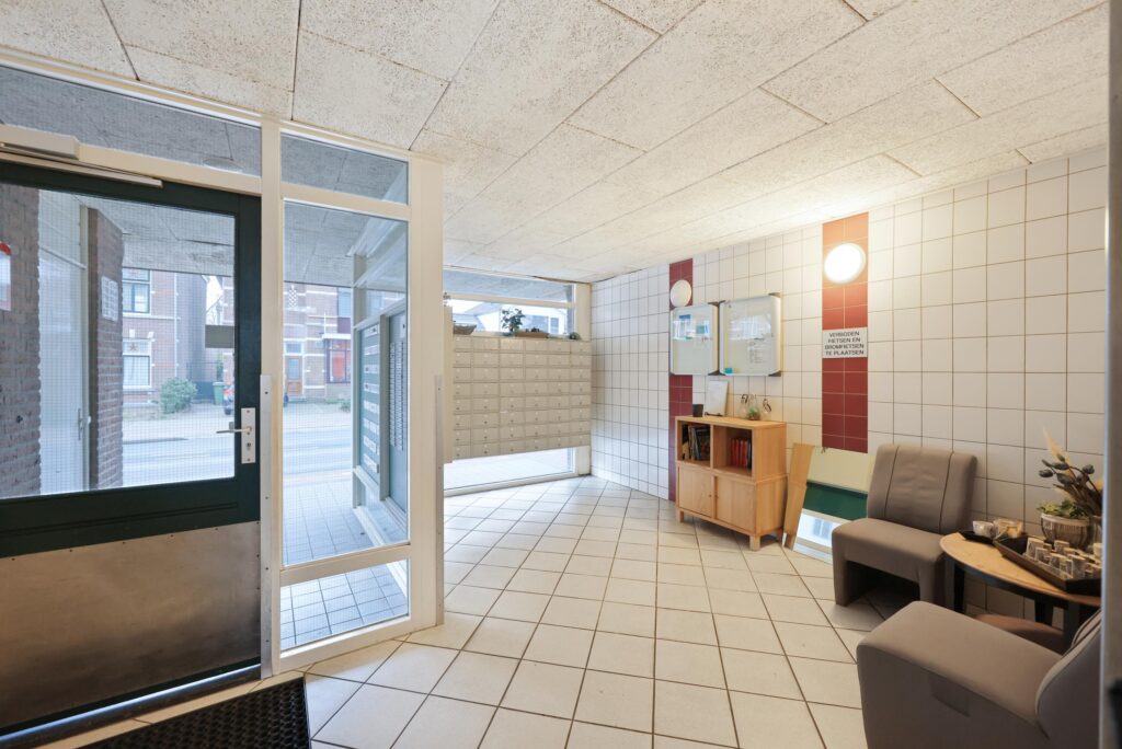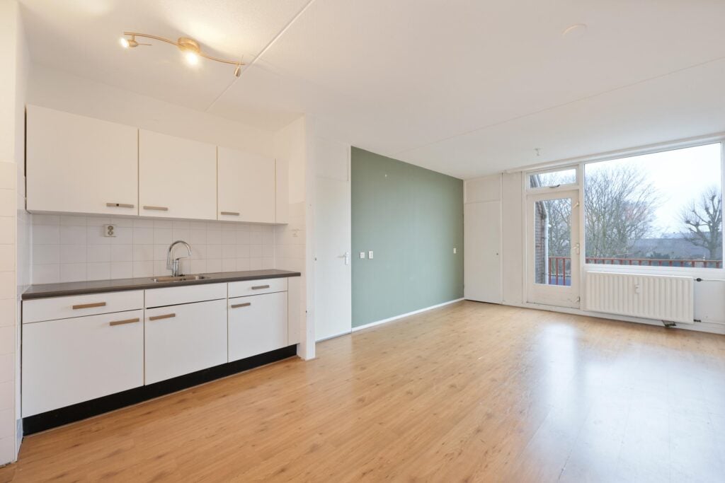 Via de centrale entree met lift bereik je het appartement. Bij binnenkomst valt direct de prettige lichtinval op, mede dankzij de gunstige ligging en het vrije uitzicht. De woonkamer is een fijne leefruimte waar je met gemak een comfortabele zithoek en eethoek kunt creëren. Grote raampartijen zorgen voor een open en ruimtelijk gevoel en laten het daglicht rijkelijk binnenstromen. De keuken is praktisch van opzet en biedt een goede basis om geheel naar eigen wens in te richten. Een prettige ruimte voor wie zijn eigen keukenideeën wil realiseren.