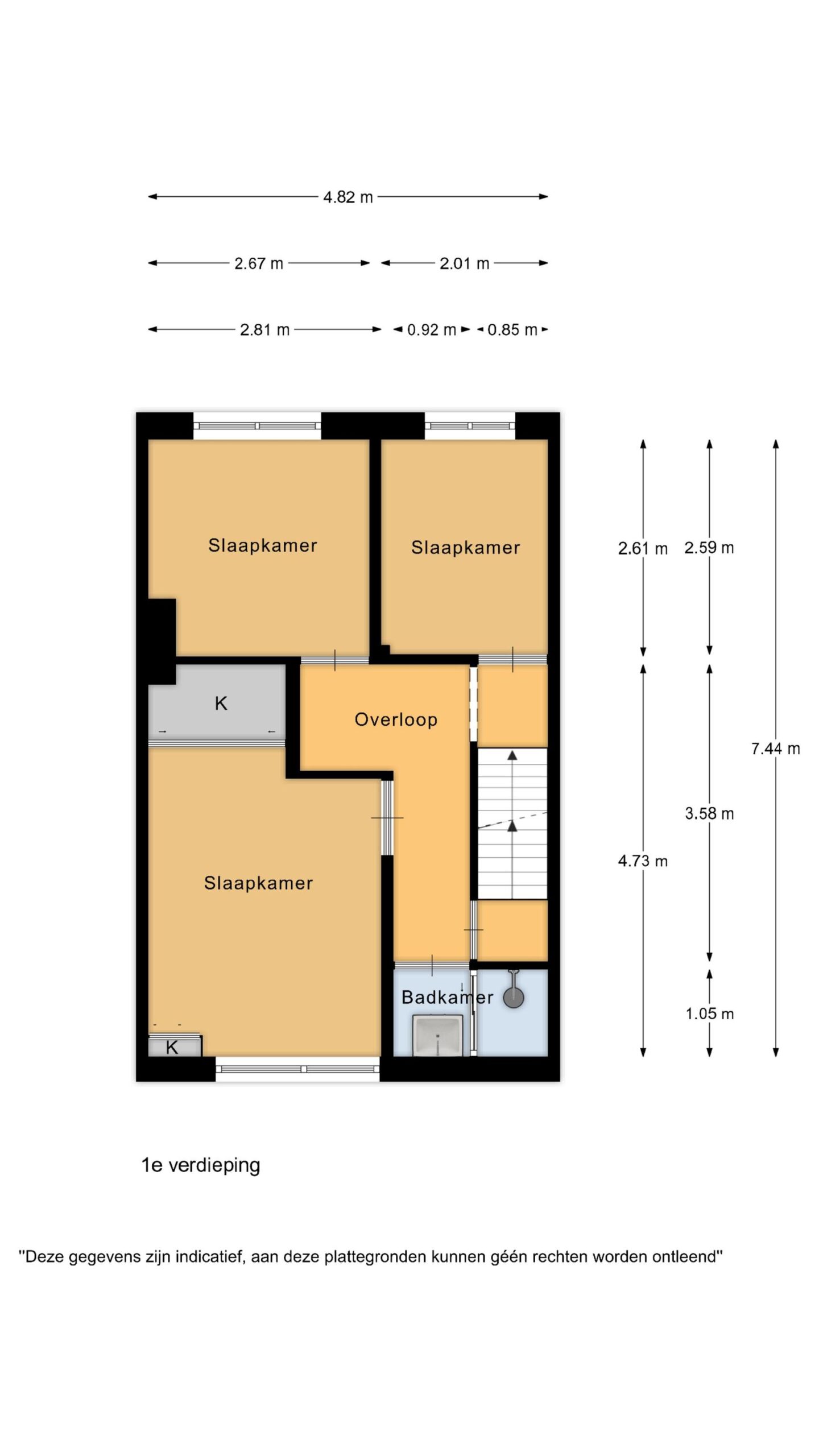 Op de eerste verdieping bevinden zich drie totaal drie prima slaapkamers. Vanuit de overloop bereik je de badkamer voorzien van een ruime douche en wastafelmeubel.