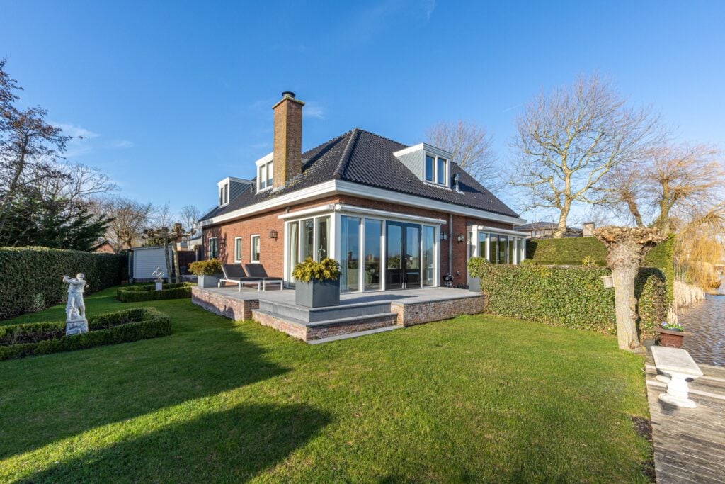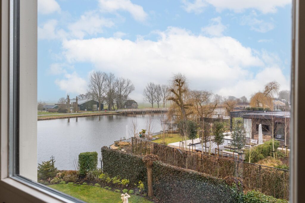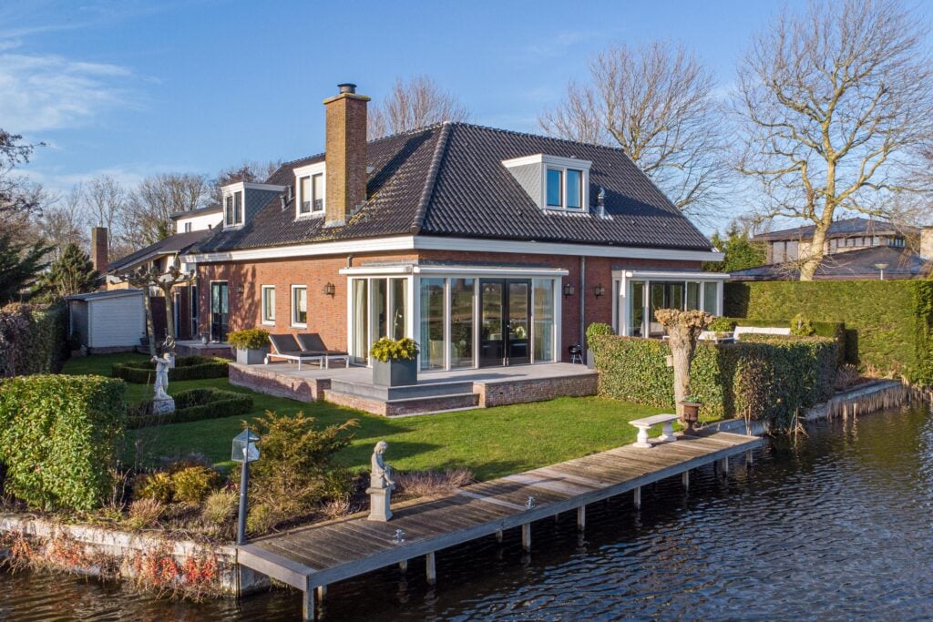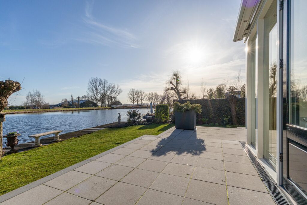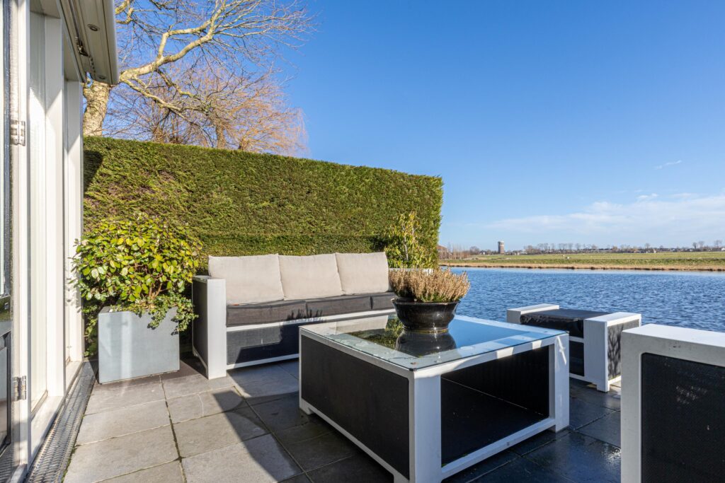 De absolute meerwaarde van dit perceel is zonder twijfel de ligging aan open vaarwater met eigen steiger. Vanuit je achtertuin vaar je zó De Delft op. De combinatie van levendigheid op het water in de zomermaanden en de rustieke sfeer aan de achterzijde van de woning maakt dit een plek waar velen van dromen. Zowel de eetkamer als de woonkamer bieden, via de dubbelopenslaande deuren, directe toegang tot de rondom gelegen tuin met grotendeels overdekt terras.