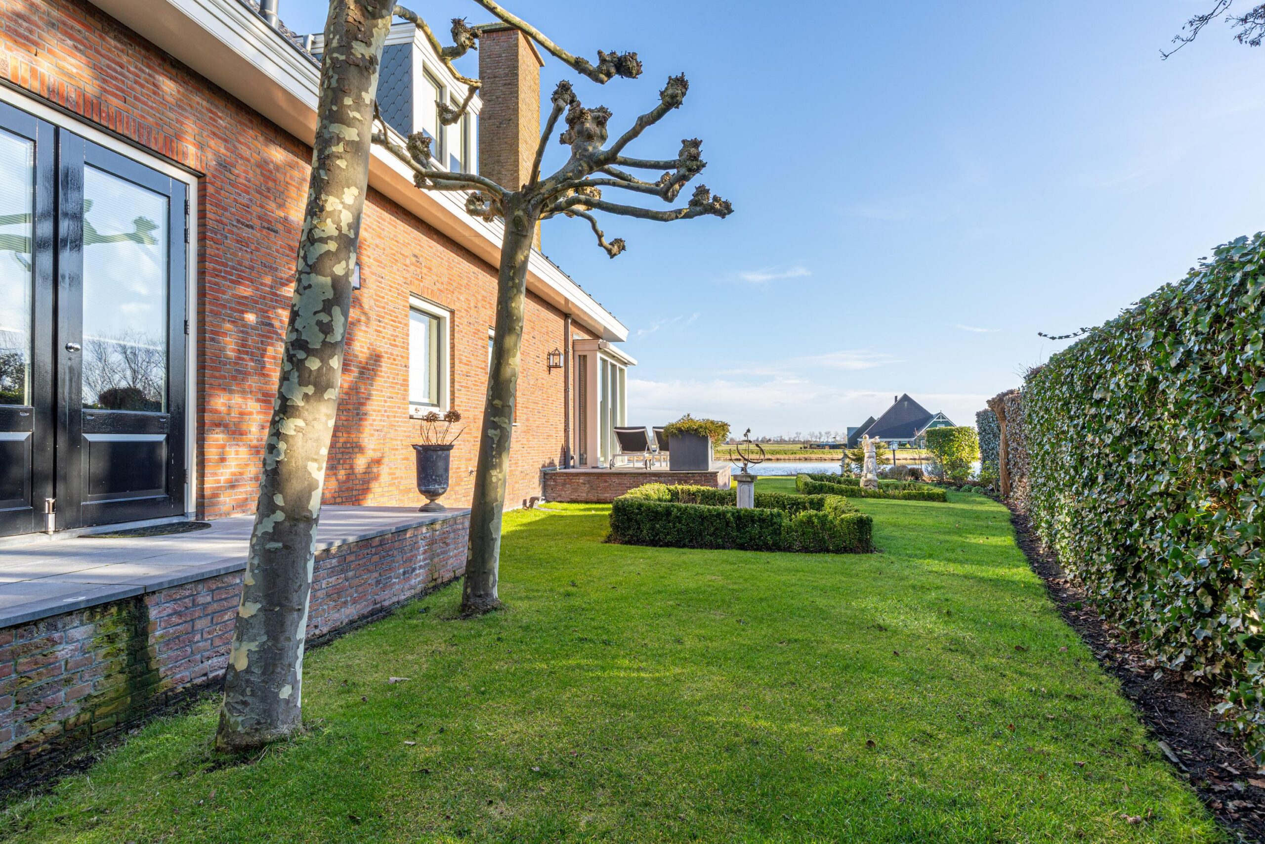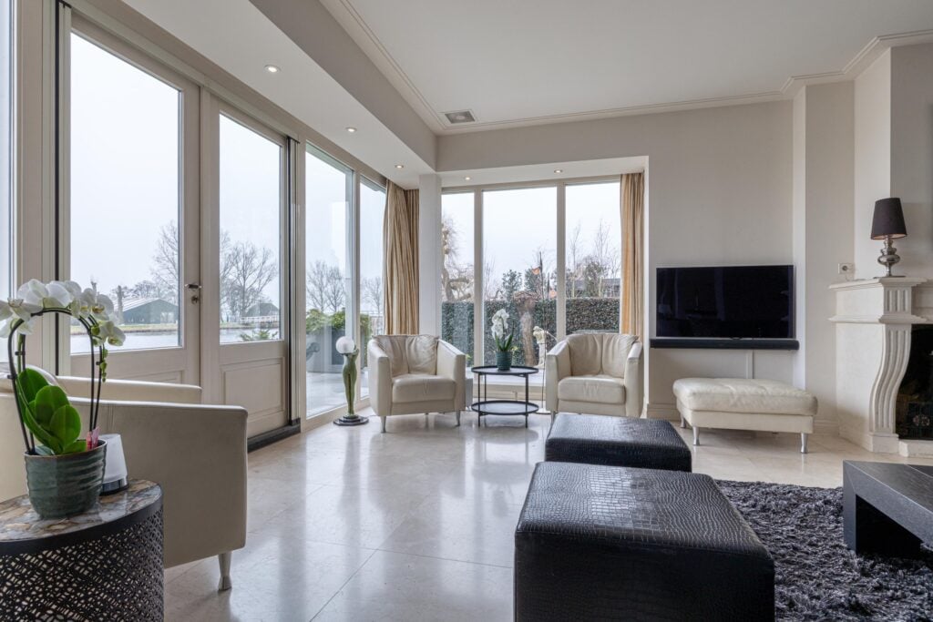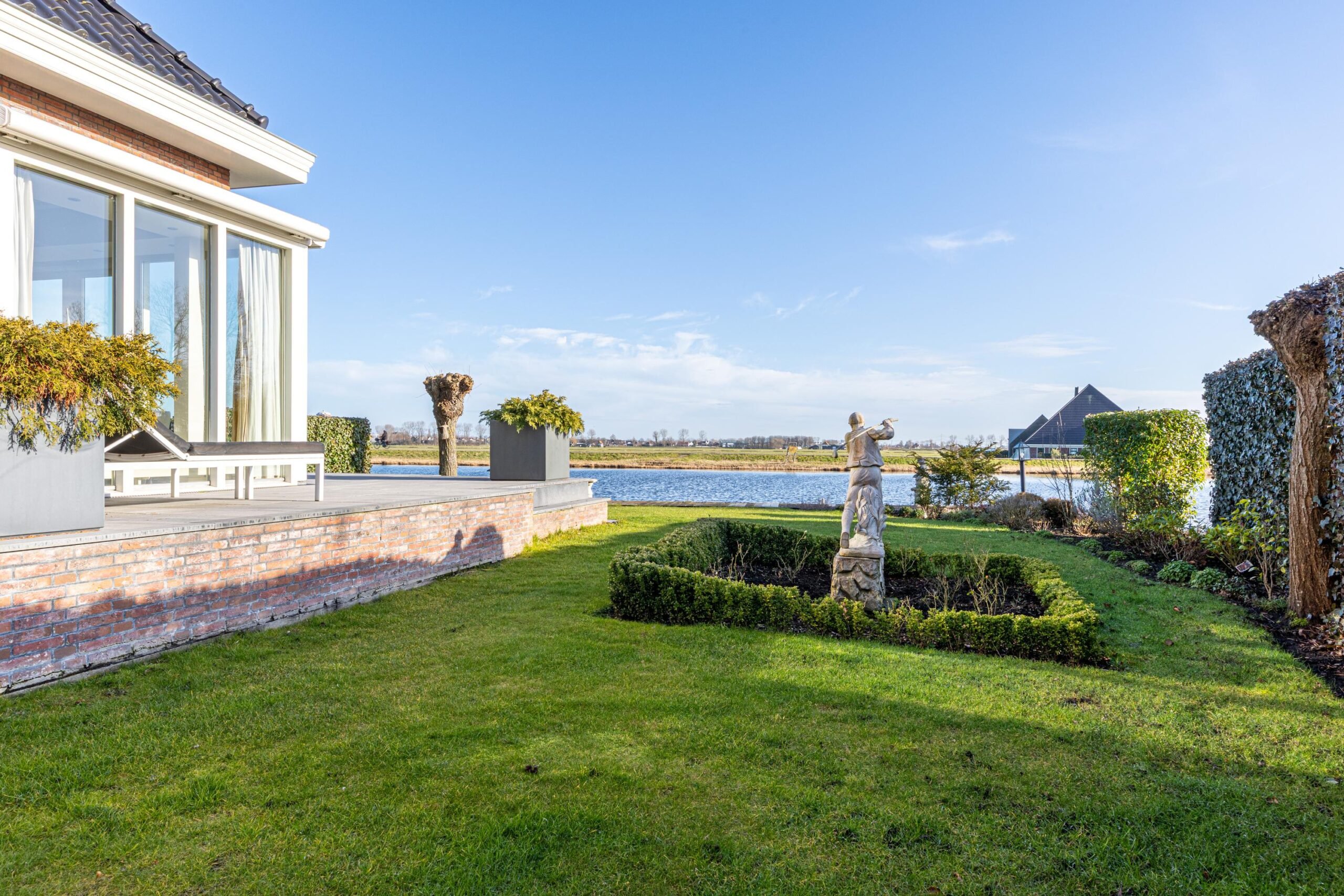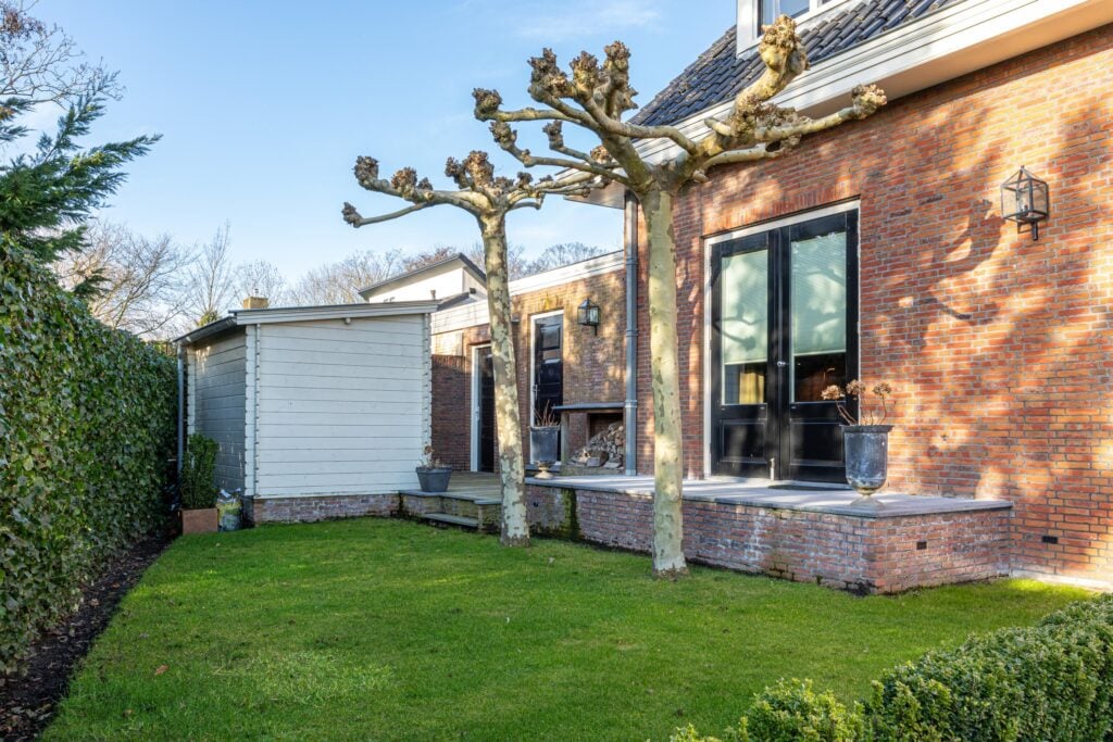 De absolute meerwaarde van dit perceel is zonder twijfel de ligging aan open vaarwater met eigen steiger. Vanuit je achtertuin vaar je zó De Delft op. De combinatie van levendigheid op het water in de zomermaanden en de rustieke sfeer aan de achterzijde van de woning maakt dit een plek waar velen van dromen. Zowel de eetkamer als de woonkamer bieden, via de dubbelopenslaande deuren, directe toegang tot de rondom gelegen tuin met grotendeels overdekt terras.