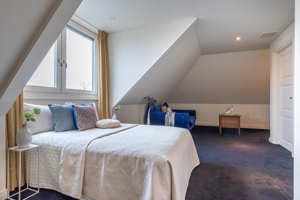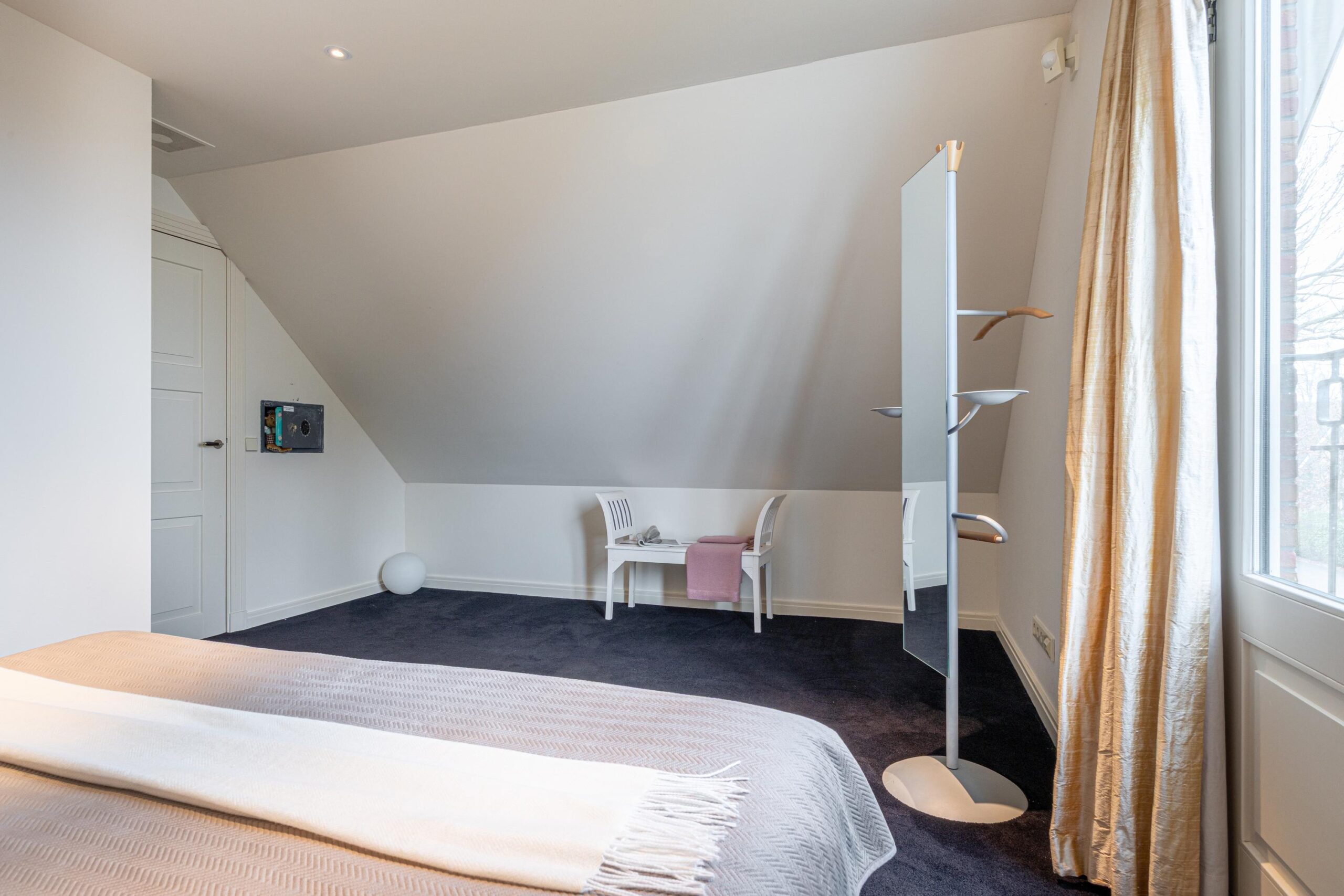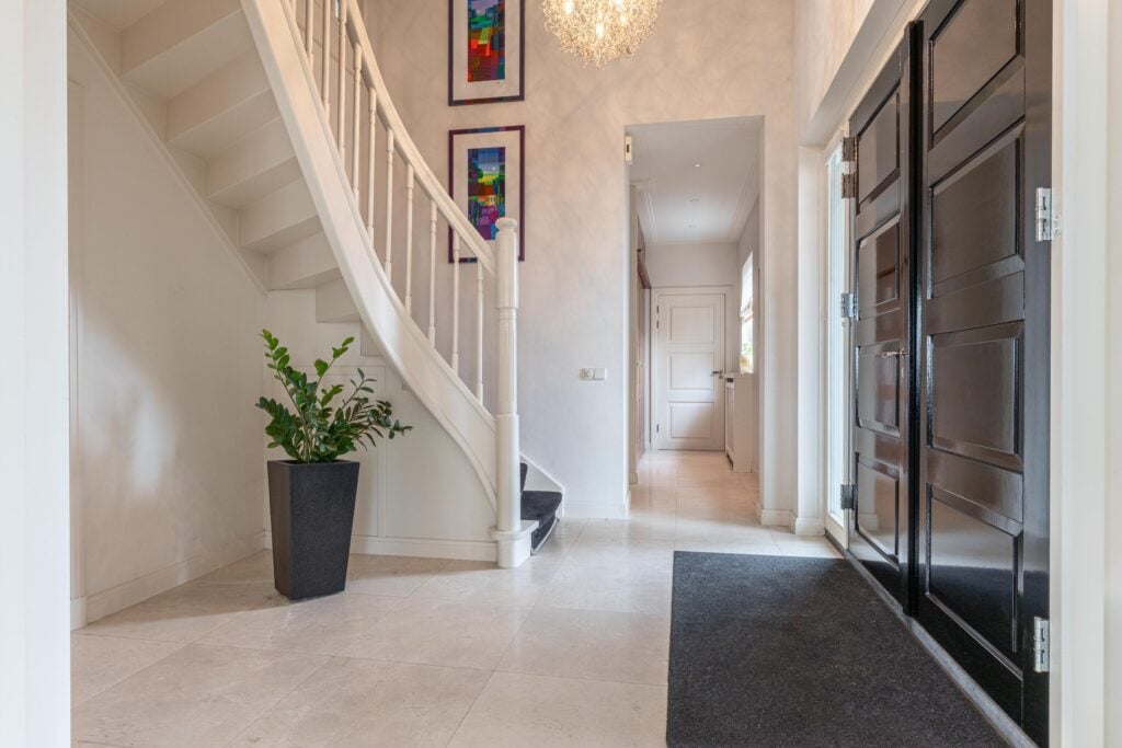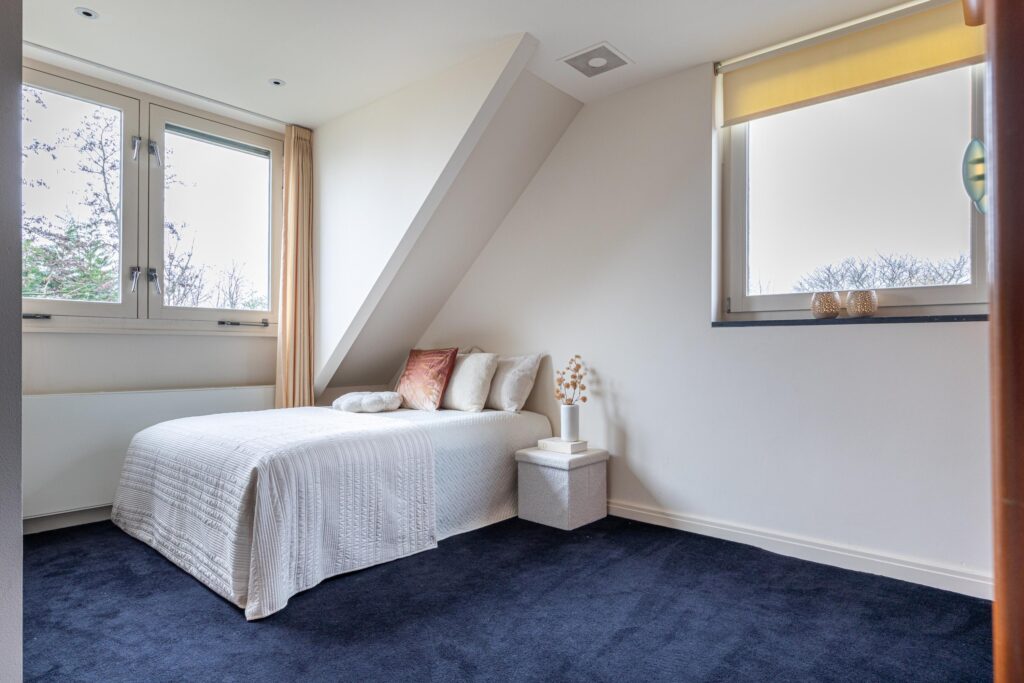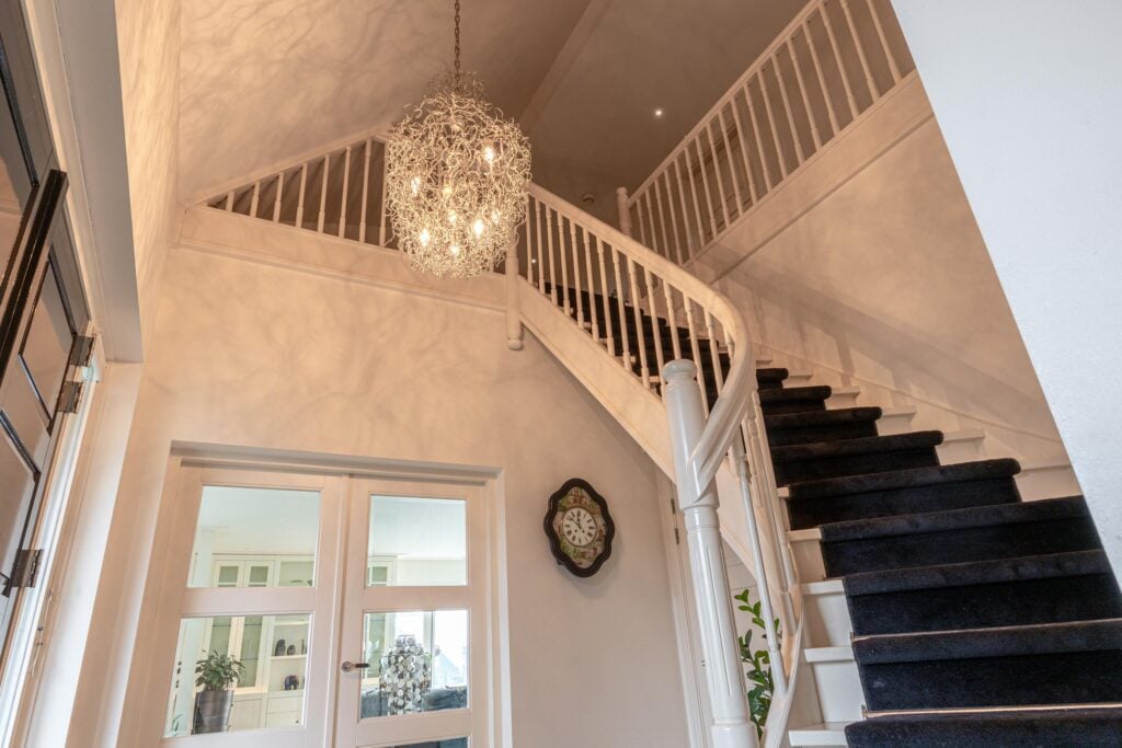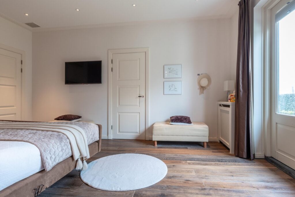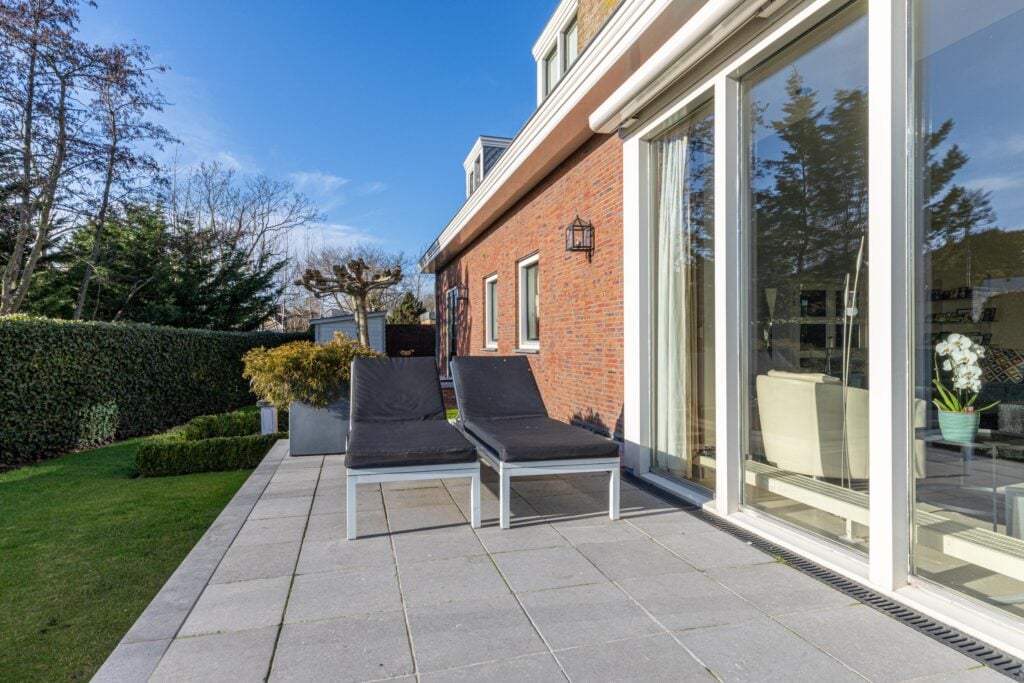 Gelijkvloers wonen behoort hier tot de mogelijkheden. Op de begane grond bevindt zich een royale slaapkamer met inloopkast en airconditioning en een en-suite badkamer, uitgerust met ligbad, douche, toilet en bidet. De inpandige garage met elektra- en watervoorziening zorgt voor extra comfort. Met dit formaat garage kun je rustig naar binnen rijden en je vier portieren tegelijk openen. Voor tuin- of hobbybenodigdheden is er tevens een vrijstaande houten berging achter de woning. Via de statige trap bereik je de verdieping, waar zich drie zeer ruime slaapkamers bevinden. Hier zijn tevens een tweede badkamer, een aparte wasruimte en diverse bergruimten gesitueerd.
