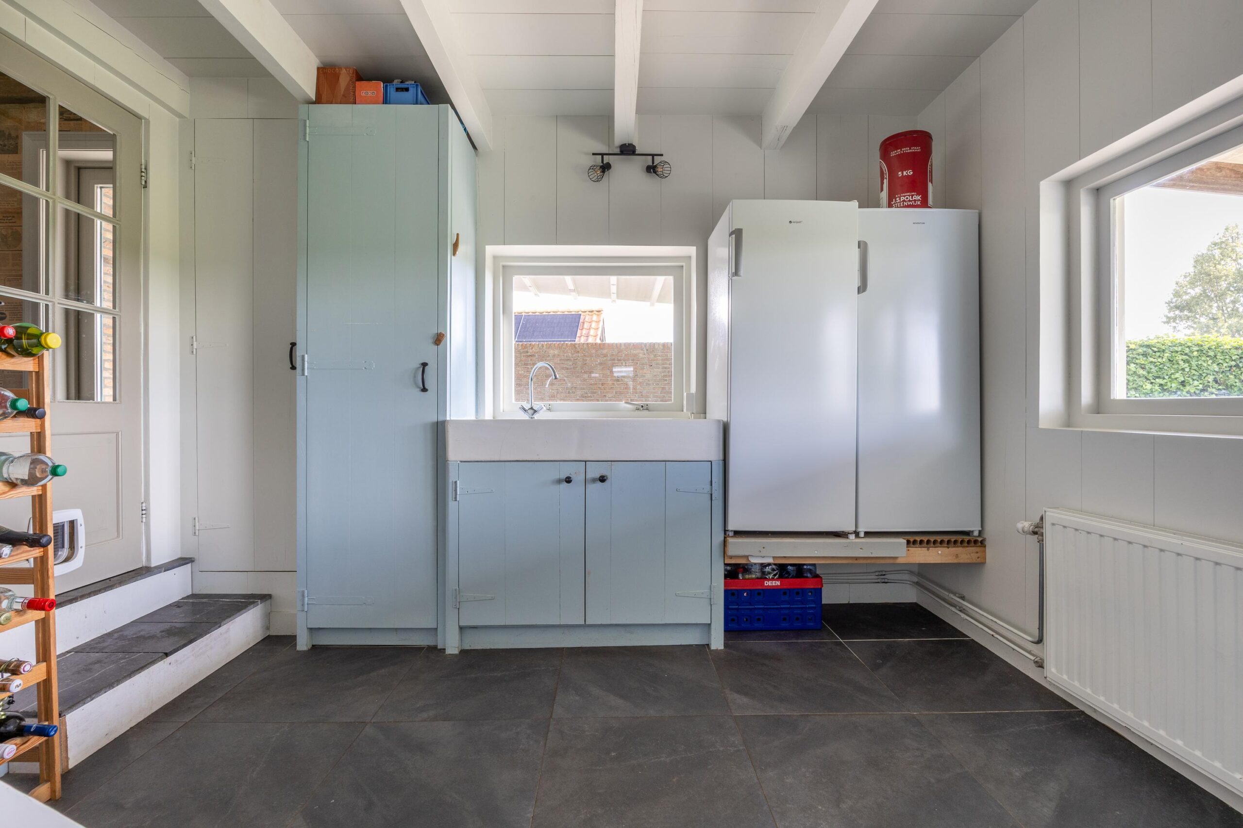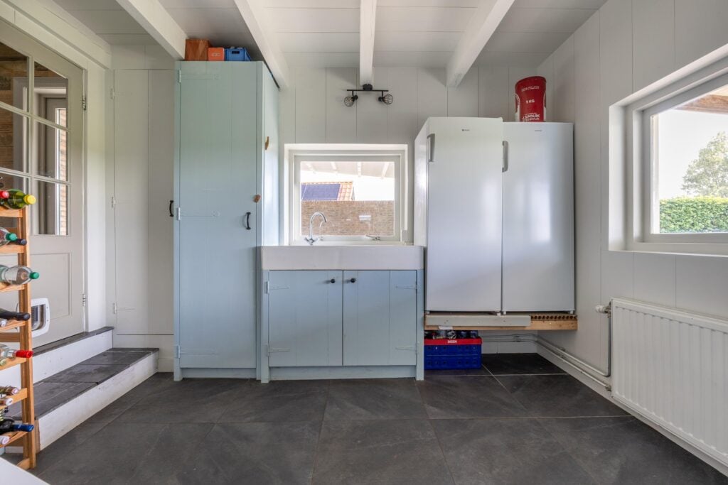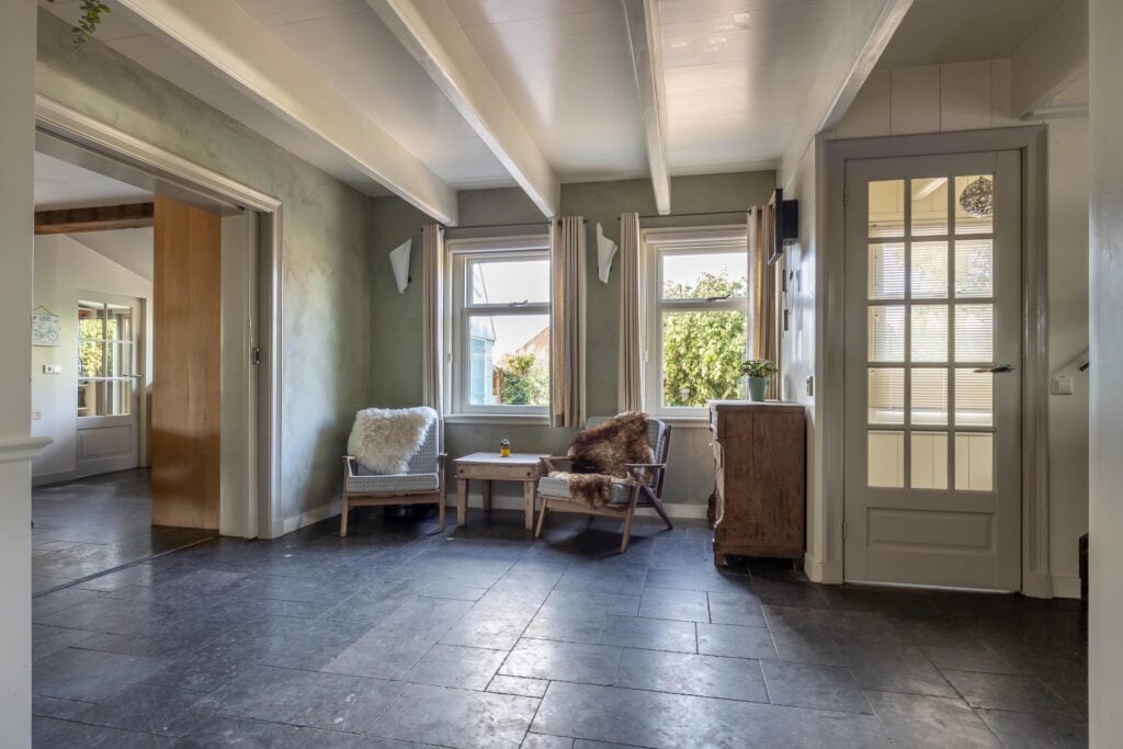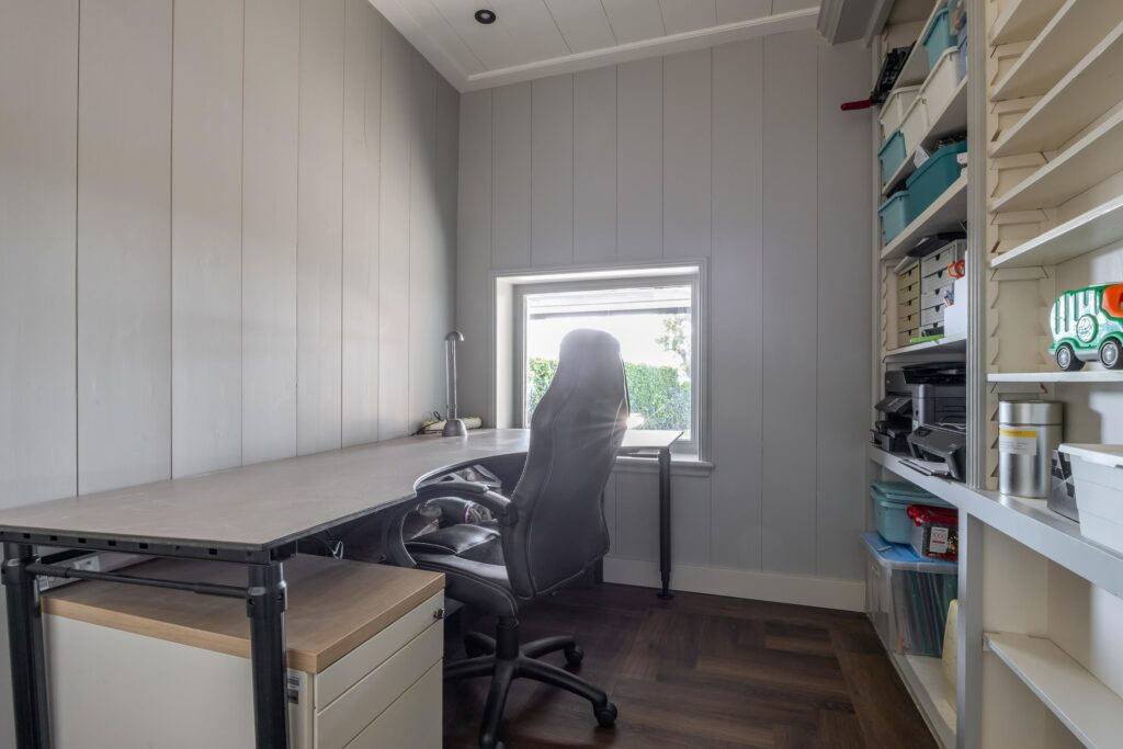 Bij binnenkomst valt meteen de ruime hal op. Vanuit hier stap je de grote woonkamer binnen: een lichte leefruimte met een strakke visgraat pvc-vloer met vloerverwarming en hoge witte plinten. De strak afgewerkte wanden en de royale indeling maken het mogelijk om een grote zithoek te creëren. Voor de knusse winteravonden is er een sfeervolle open haard aanwezig. Aan beide zijden zorgen grote raampartijen voor volop daglicht en een prachtig uitzicht op de tuin. Grenzend aan de woonkamer vind je een afgesloten kantoorruimte, ideaal als thuiswerkplek. Ook is er een eethoek met uitzicht over de tuin, waar je elke maaltijd in een fijne ambiance kunt genieten. De landelijke keuken sluit hier mooi op aan en is voorzien van diverse inbouwapparatuur en meer dan voldoende ruimte voor een tweede eettafel. Via de keuken loop je door naar de bijkeuken, met aansluitingen voor de wasmachine en droger en extra opbergruimte.