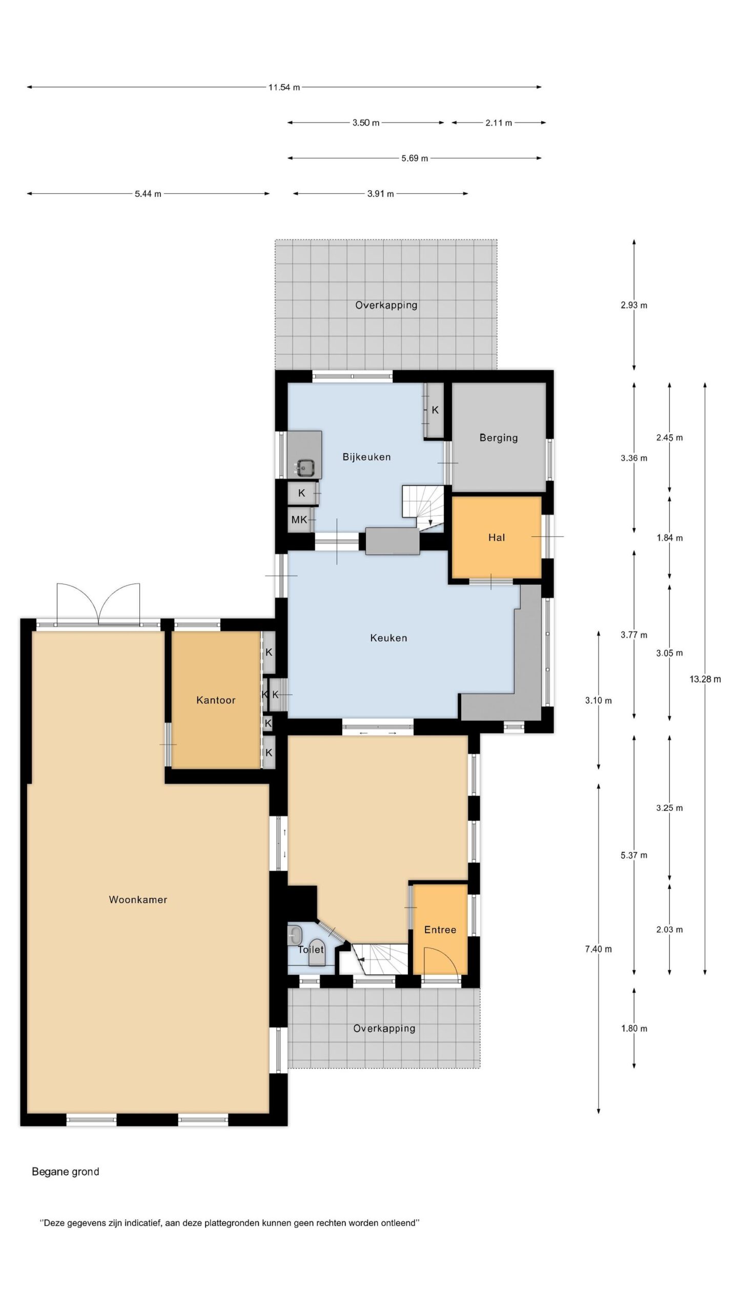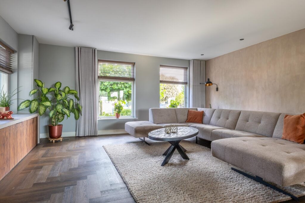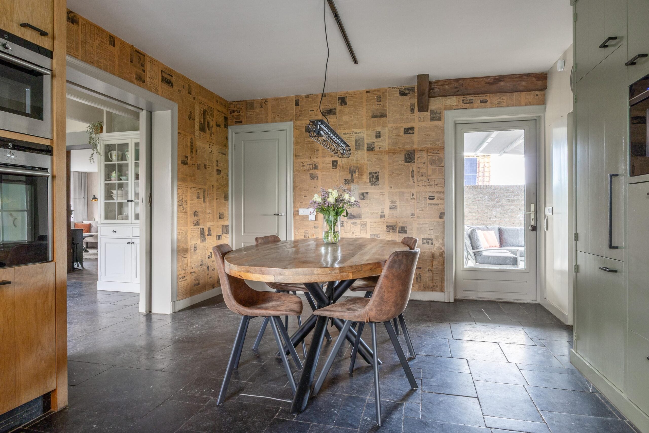 Bij binnenkomst valt meteen de ruime hal op. Vanuit hier stap je de grote woonkamer binnen: een lichte leefruimte met een strakke visgraat pvc-vloer met vloerverwarming en hoge witte plinten. De strak afgewerkte wanden en de royale indeling maken het mogelijk om een grote zithoek te creëren. Voor de knusse winteravonden is er een sfeervolle open haard aanwezig. Aan beide zijden zorgen grote raampartijen voor volop daglicht en een prachtig uitzicht op de tuin. Grenzend aan de woonkamer vind je een afgesloten kantoorruimte, ideaal als thuiswerkplek. Ook is er een eethoek met uitzicht over de tuin, waar je elke maaltijd in een fijne ambiance kunt genieten. De landelijke keuken sluit hier mooi op aan en is voorzien van diverse inbouwapparatuur en meer dan voldoende ruimte voor een tweede eettafel. Via de keuken loop je door naar de bijkeuken, met aansluitingen voor de wasmachine en droger en extra opbergruimte.