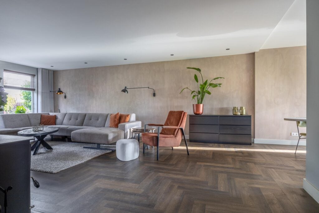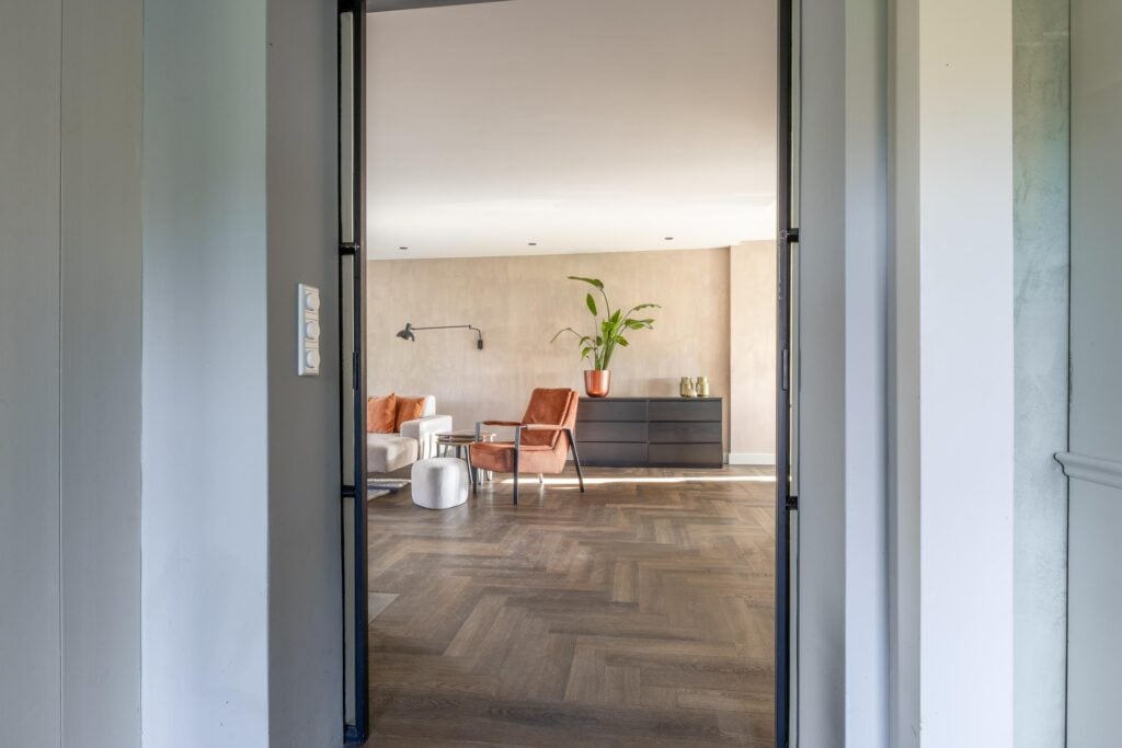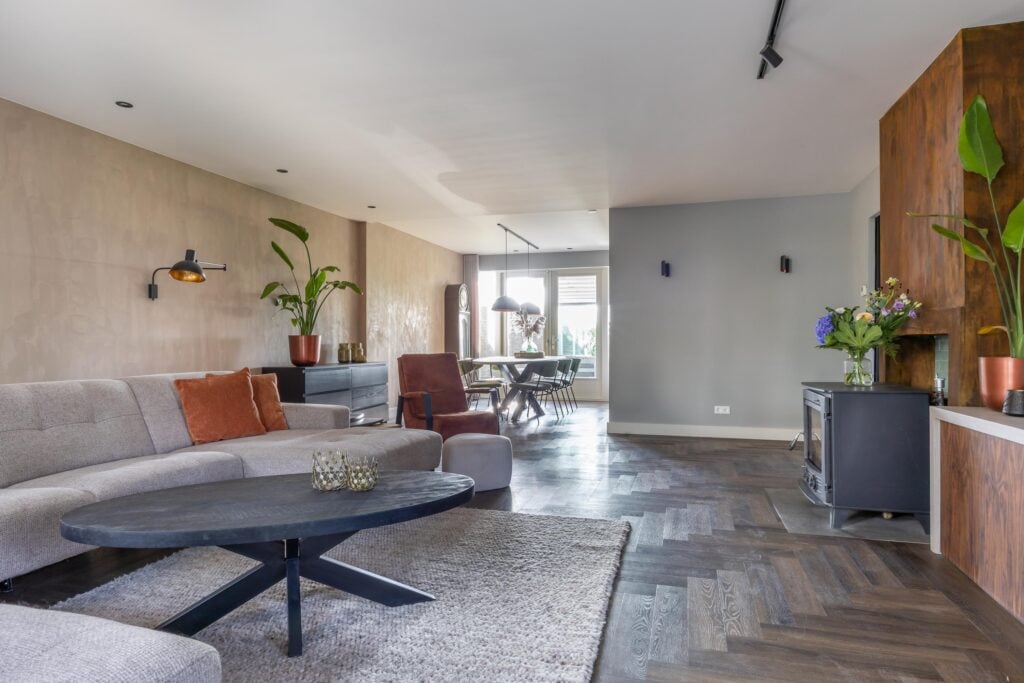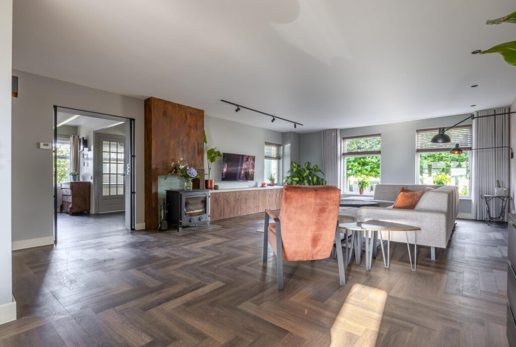 – Ruime woonkamer met visgraat pvc-vloer, vloerverwarming en open haard;